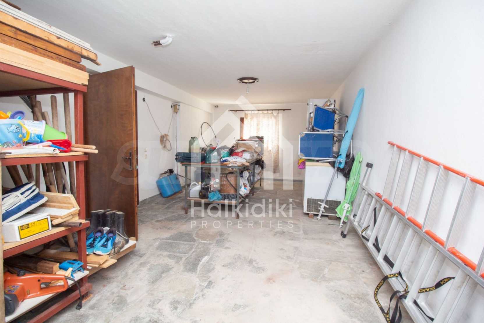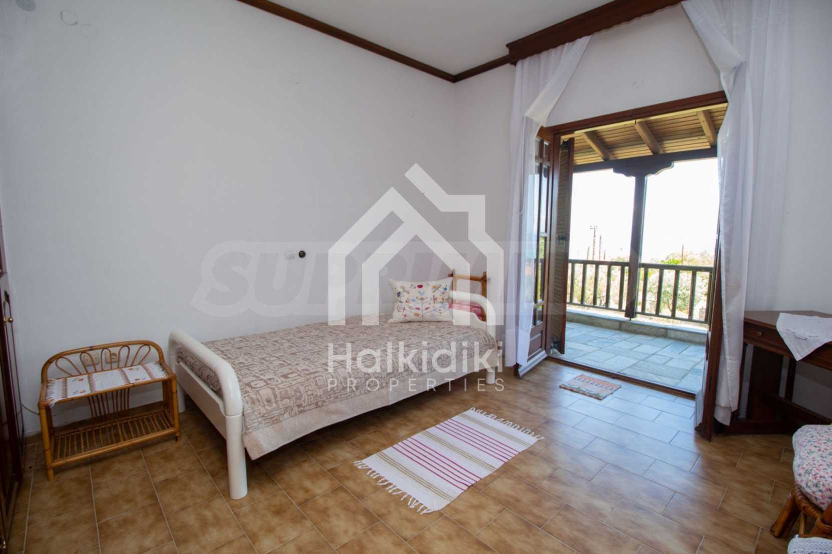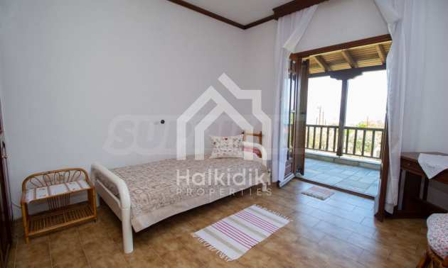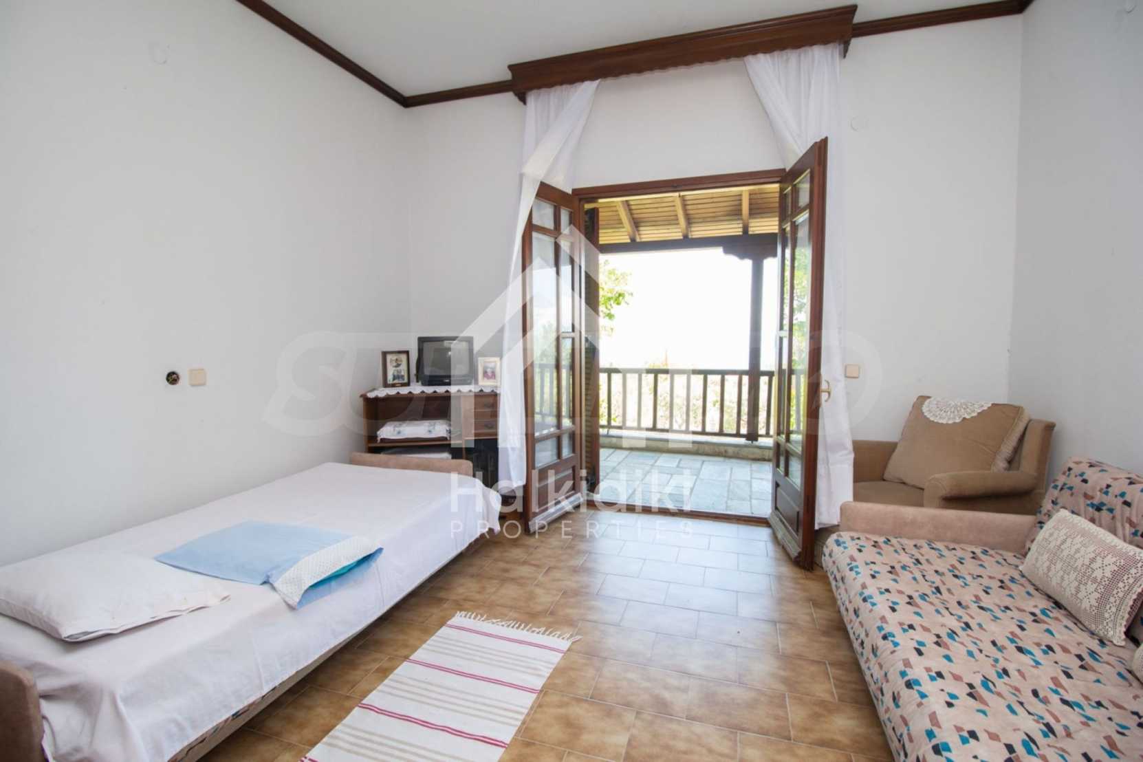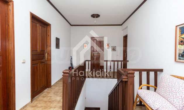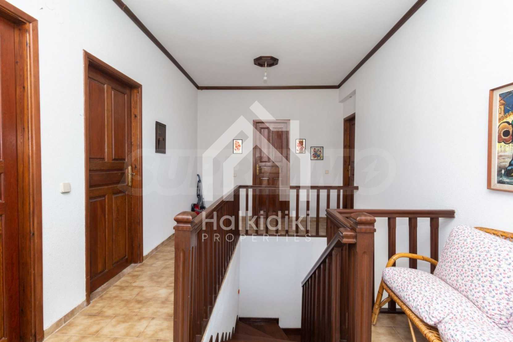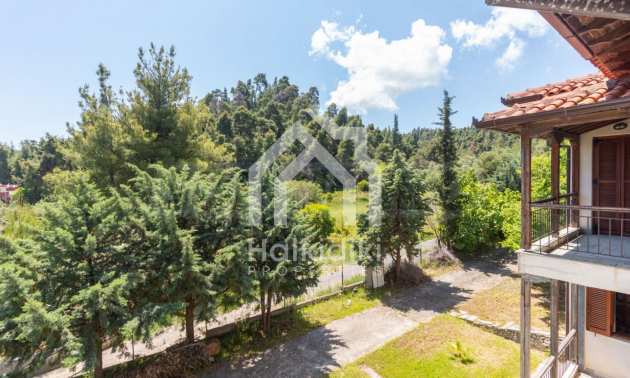 Excellent, bright detached house,300 m²,in Kassandra, Halkidiki. It is outside the village, with a southeastern orientation, very close to the sea. It is 150 meters away from the beach and 600 meters away from the center of the village. It is in an extremely good condition, furnished with fitted closets and all the electrical appliances. It has parking, autonomous heating system, fireplace, wooden joinery and a wonderful private garden of 4.150 m², in which there is also a large olive grove. It is split in three levels,100 m² each one of them, consisted of two living rooms connected with the kitchens, seven bedrooms, two bathrooms and two storage rooms.
