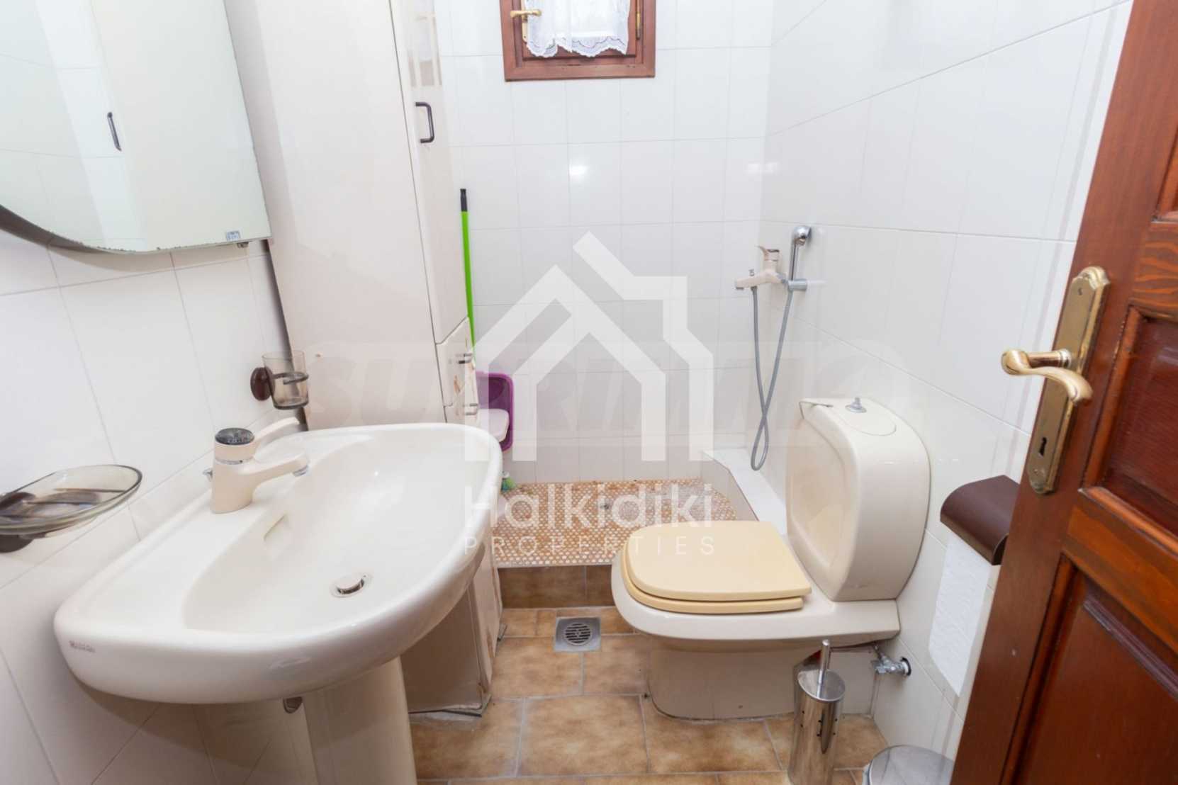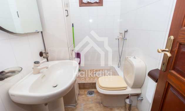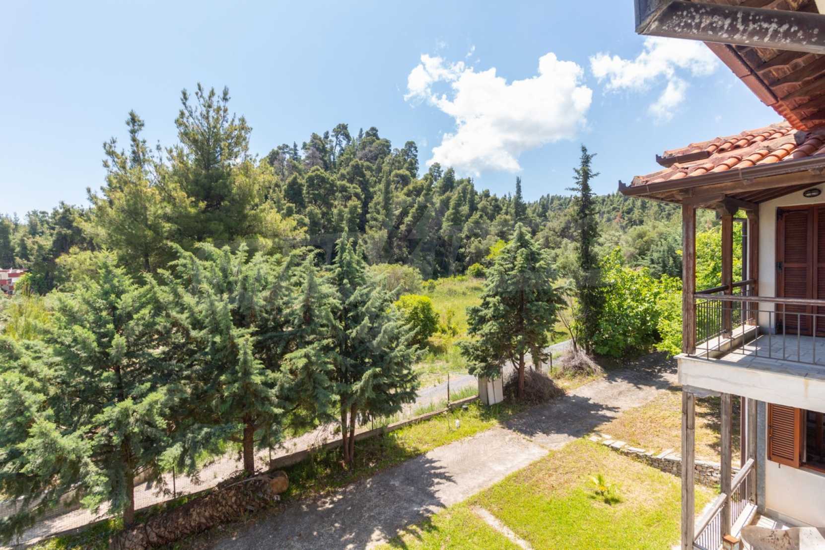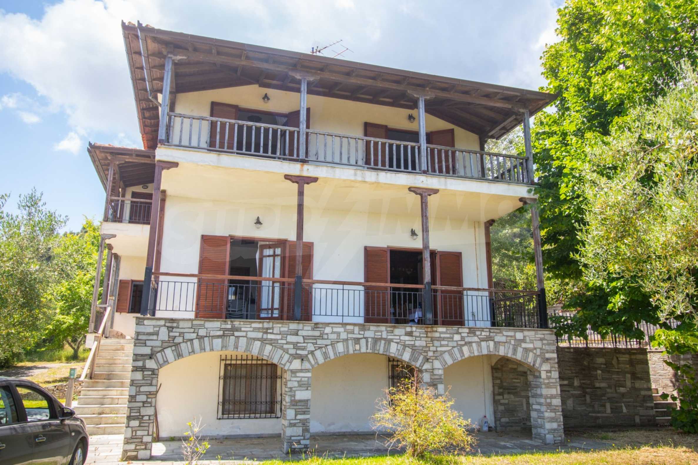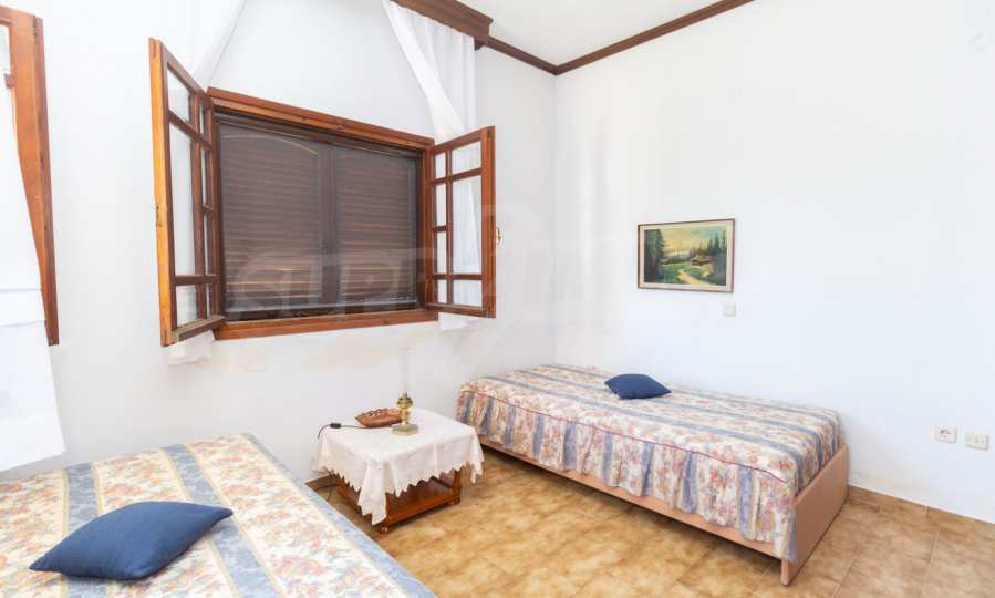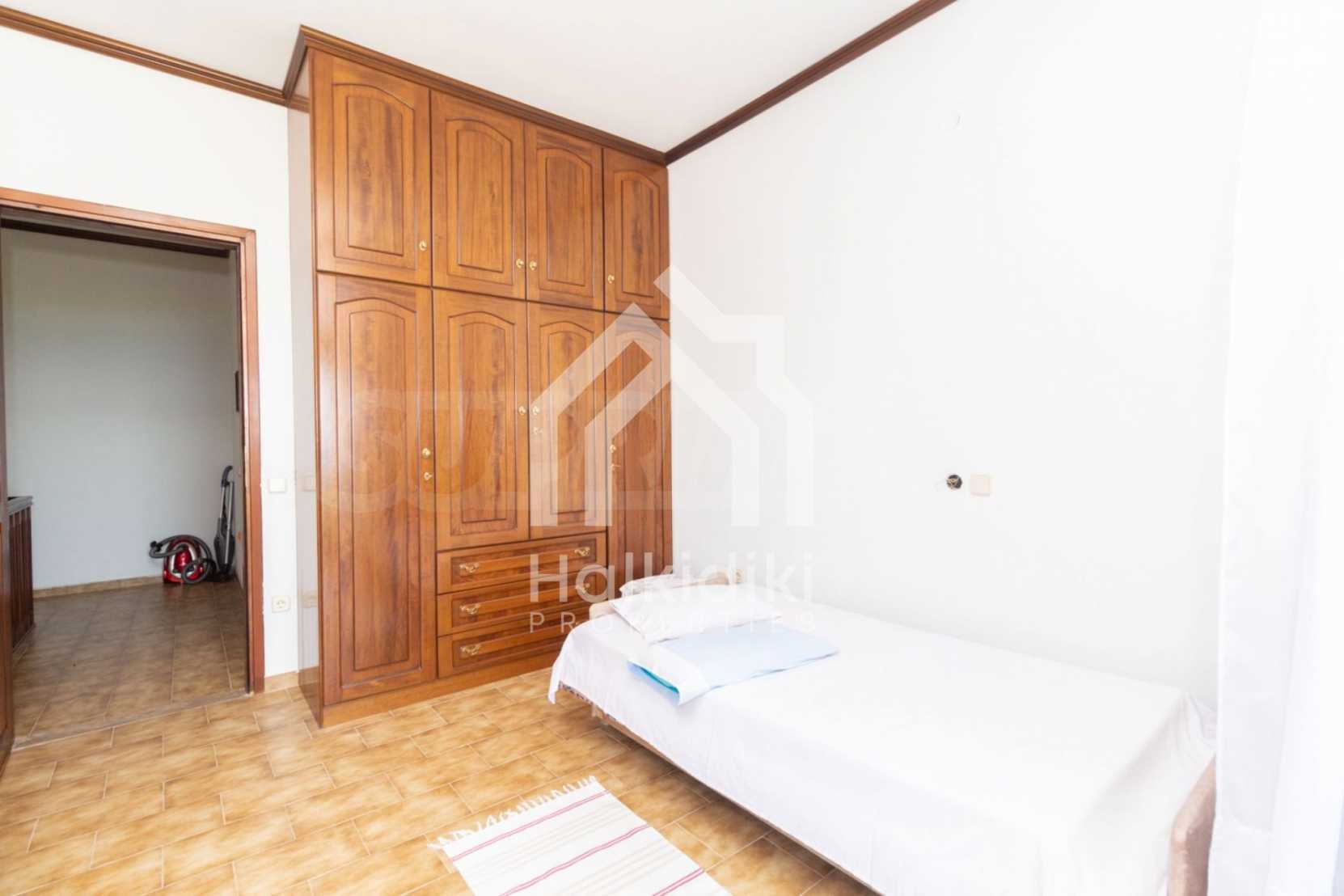 Excellent, bright detached house,300 m²,in Kassandra, Halkidiki. It is outside the village, with a southeastern orientation, very close to the sea. It is 150 meters away from the beach and 600 meters away from the center of the village. It is in an extremely good condition, furnished with fitted closets and all the electrical appliances. It has parking, autonomous heating system, fireplace, wooden joinery and a wonderful private garden of 4.150 m², in which there is also a large olive grove. It is split in three levels,100 m² each one of them, consisted of two living rooms connected with the kitchens, seven bedrooms, two bathrooms and two storage rooms.