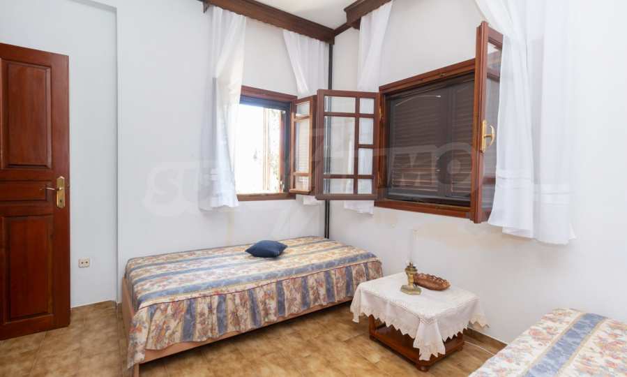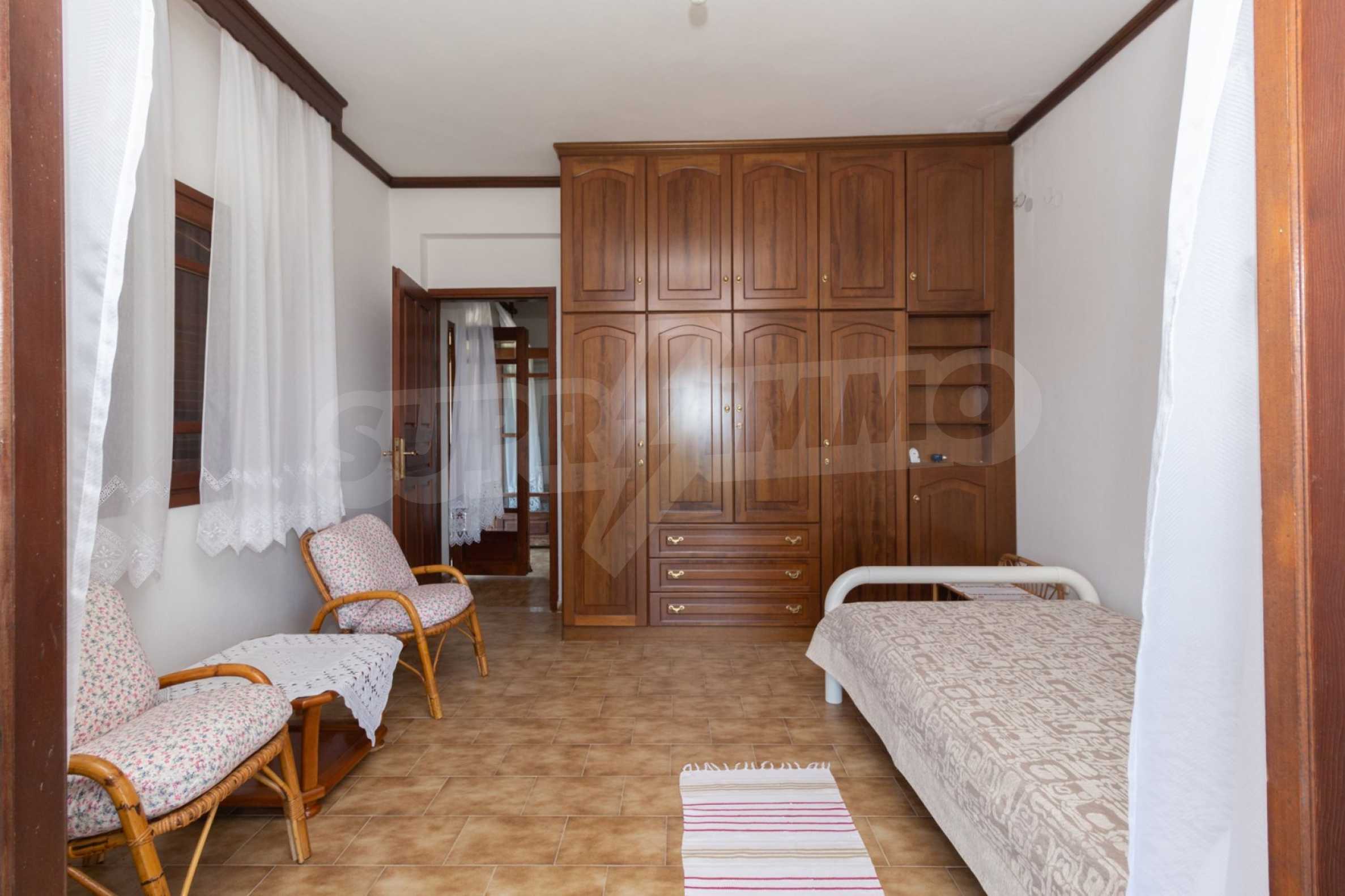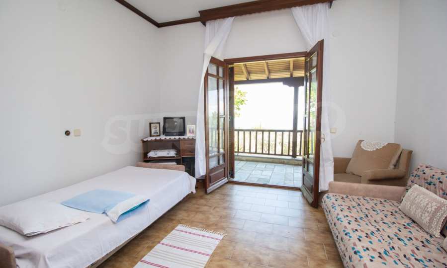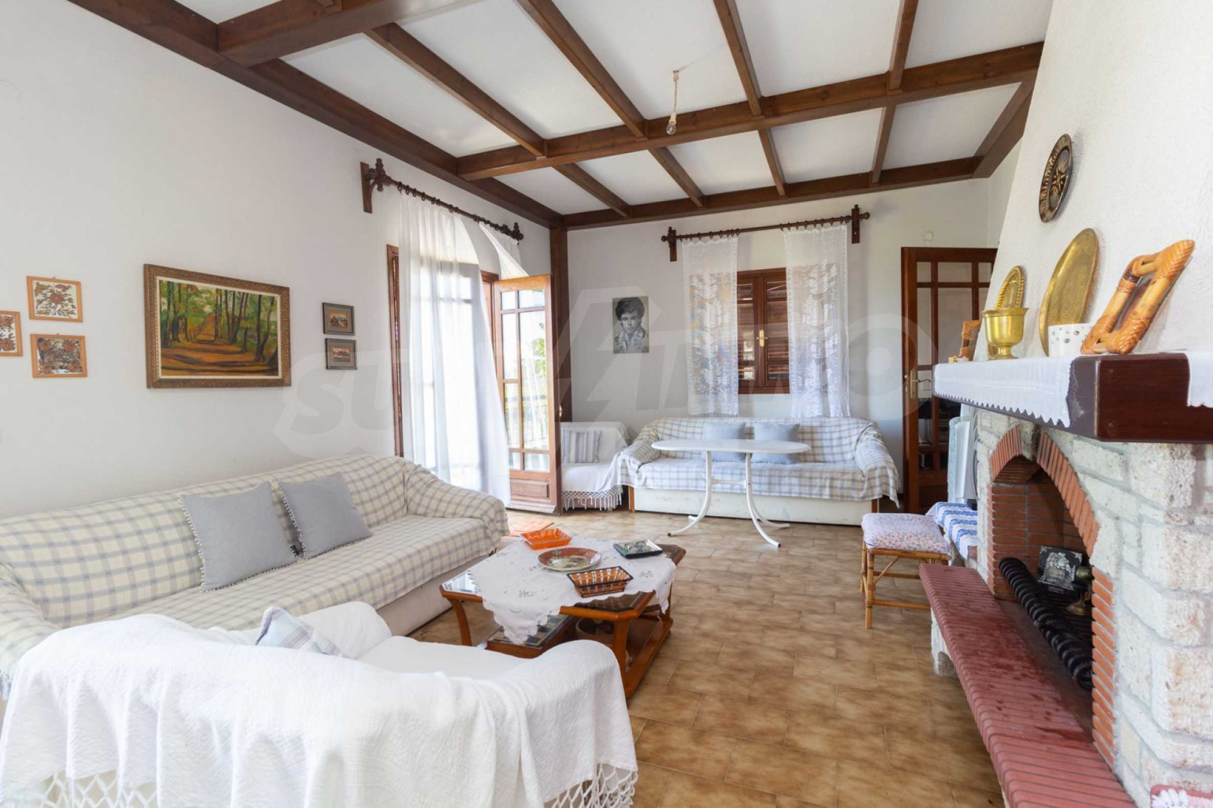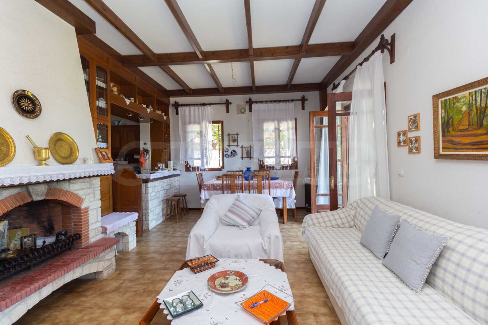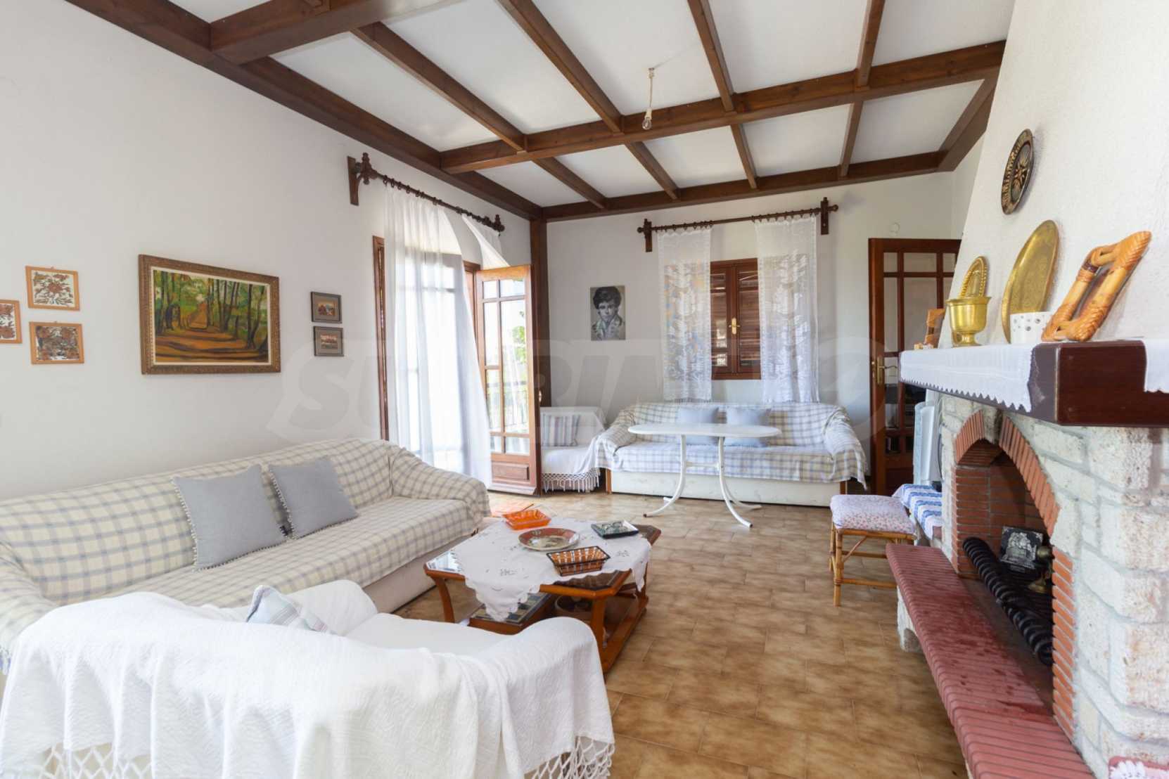 Excellent, bright detached house,300 m²,in Kassandra, Halkidiki. It is outside the village, with a southeastern orientation, very close to the sea. It is 150 meters away from the beach and 600 meters away from the center of the village. It is in an extremely good condition, furnished with fitted closets and all the electrical appliances. It has parking, autonomous heating system, fireplace, wooden joinery and a wonderful private garden of 4.150 m², in which there is also a large olive grove. It is split in three levels,100 m² each one of them, consisted of two living rooms connected with the kitchens, seven bedrooms, two bathrooms and two storage rooms.