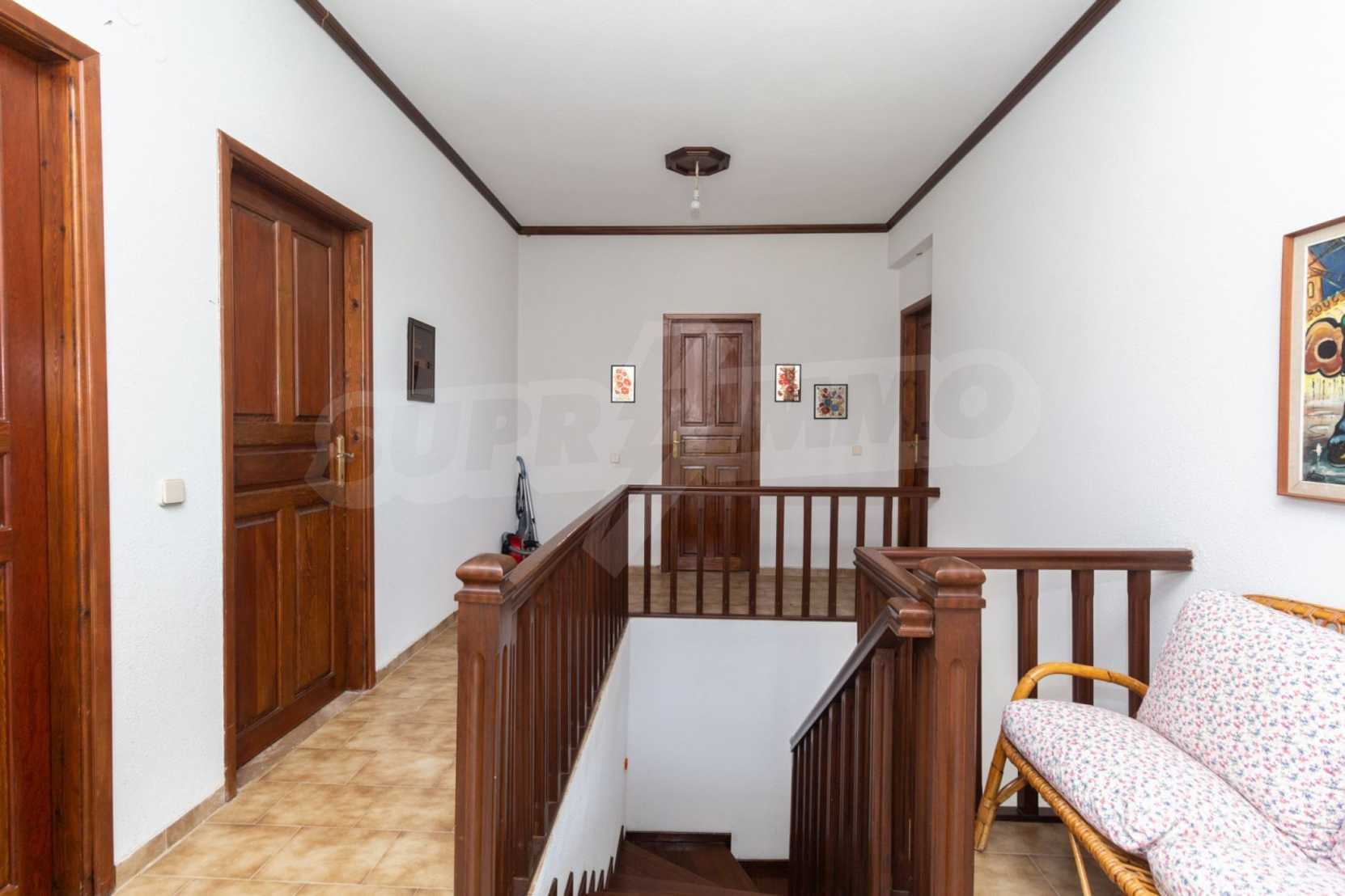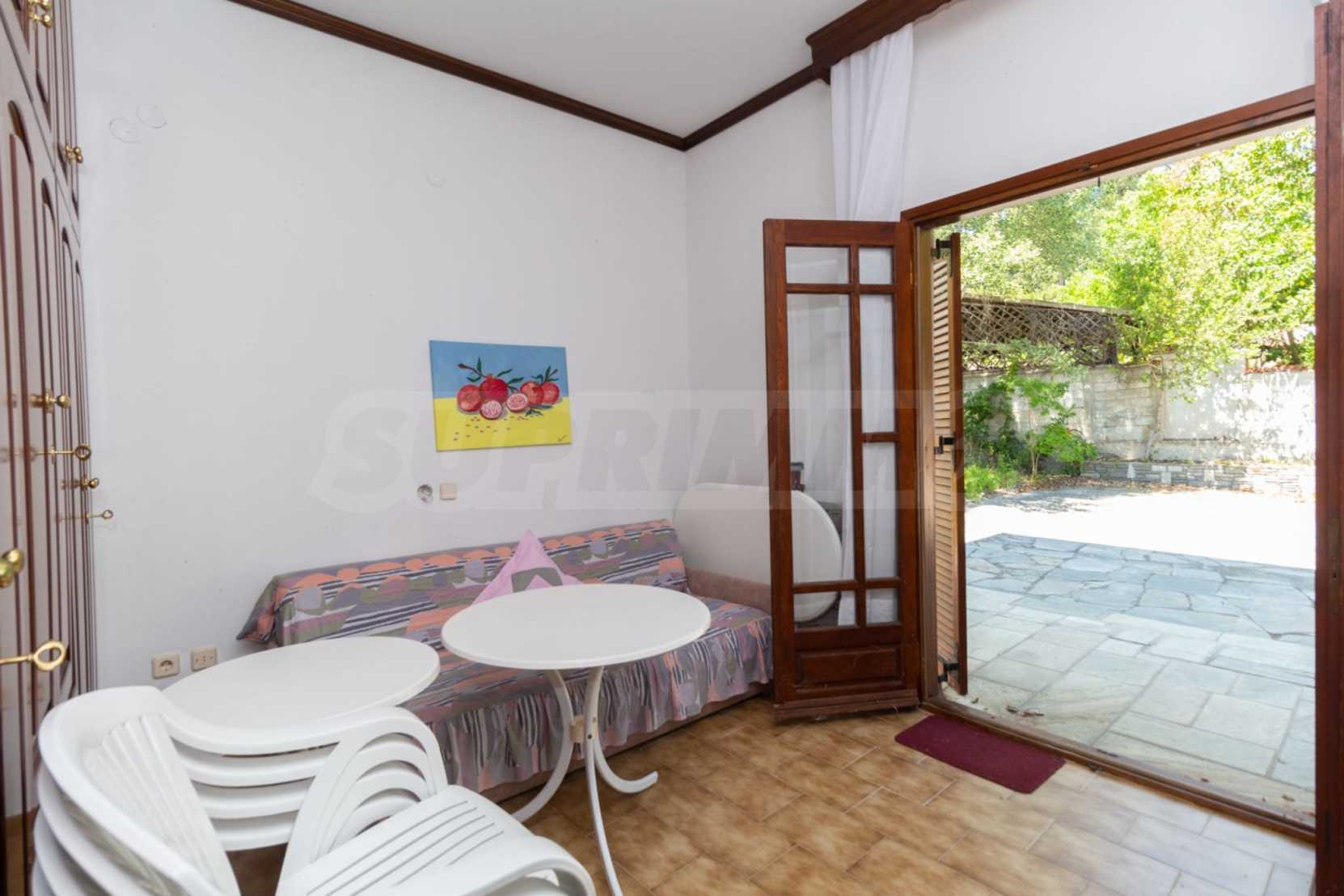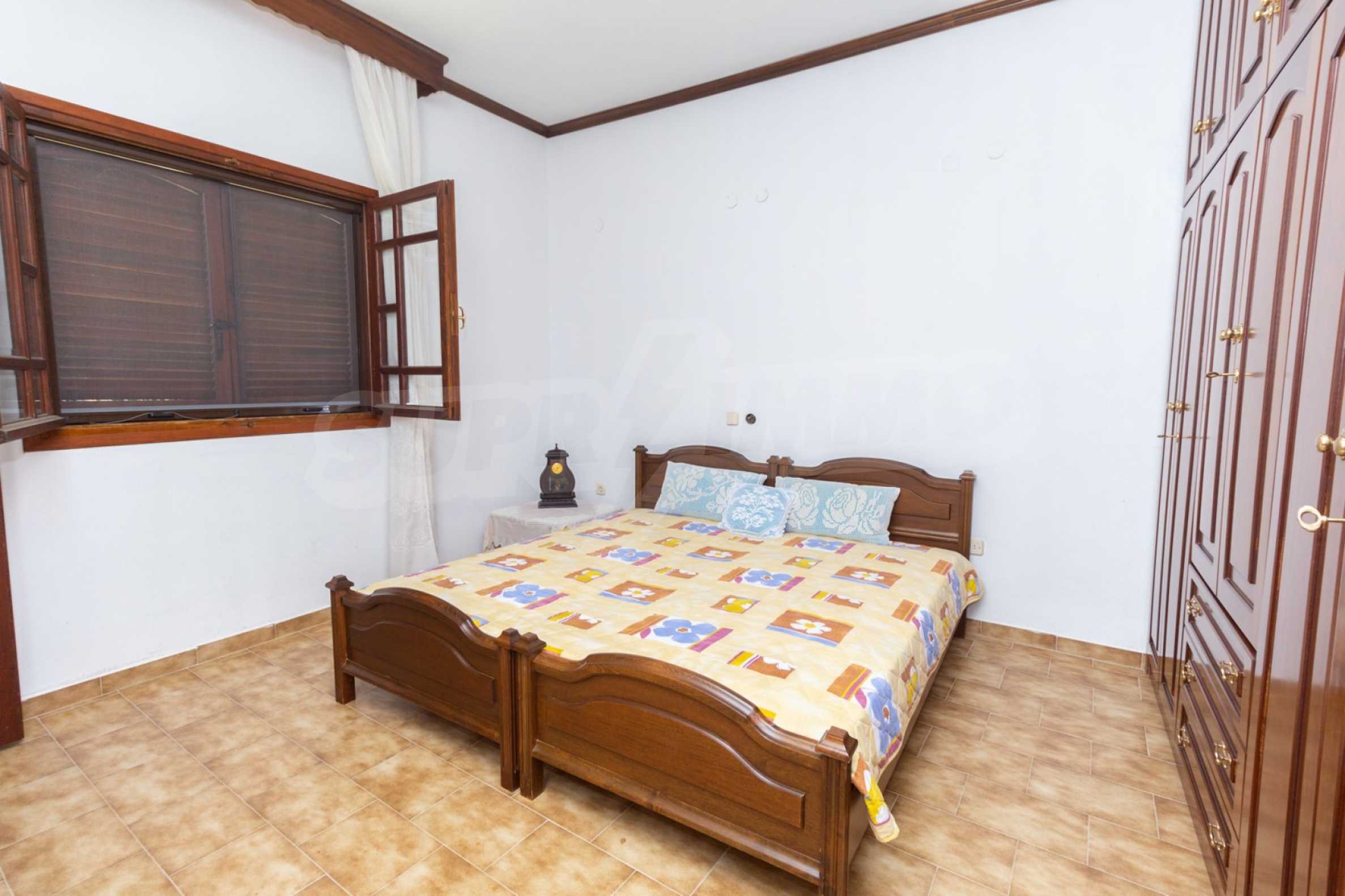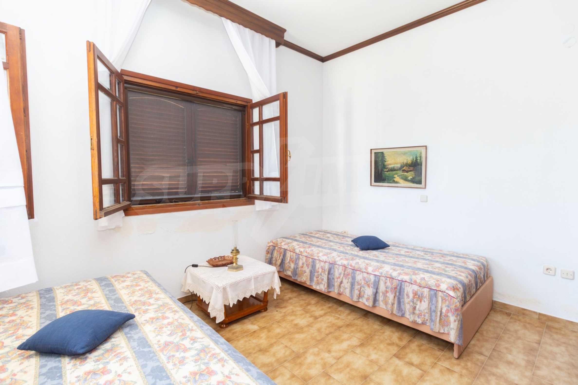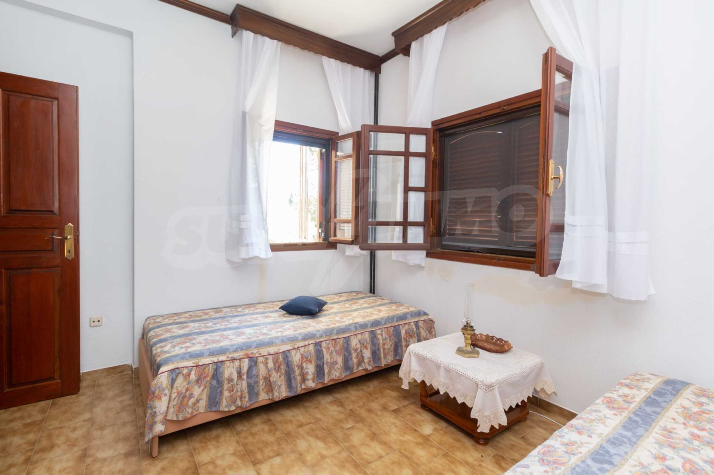 Excellent, bright detached house,300 m²,in Kassandra, Halkidiki. It is outside the village, with a southeastern orientation, very close to the sea. It is 150 meters away from the beach and 600 meters away from the center of the village. It is in an extremely good condition, furnished with fitted closets and all the electrical appliances. It has parking, autonomous heating system, fireplace, wooden joinery and a wonderful private garden of 4.150 m², in which there is also a large olive grove. It is split in three levels,100 m² each one of them, consisted of two living rooms connected with the kitchens, seven bedrooms, two bathrooms and two storage rooms.