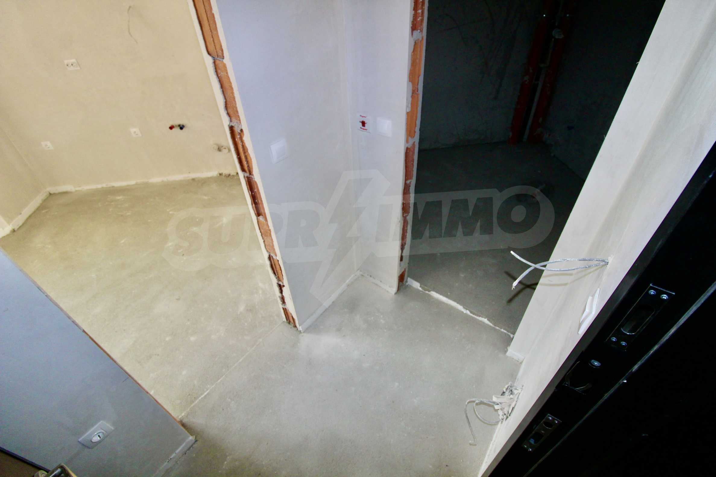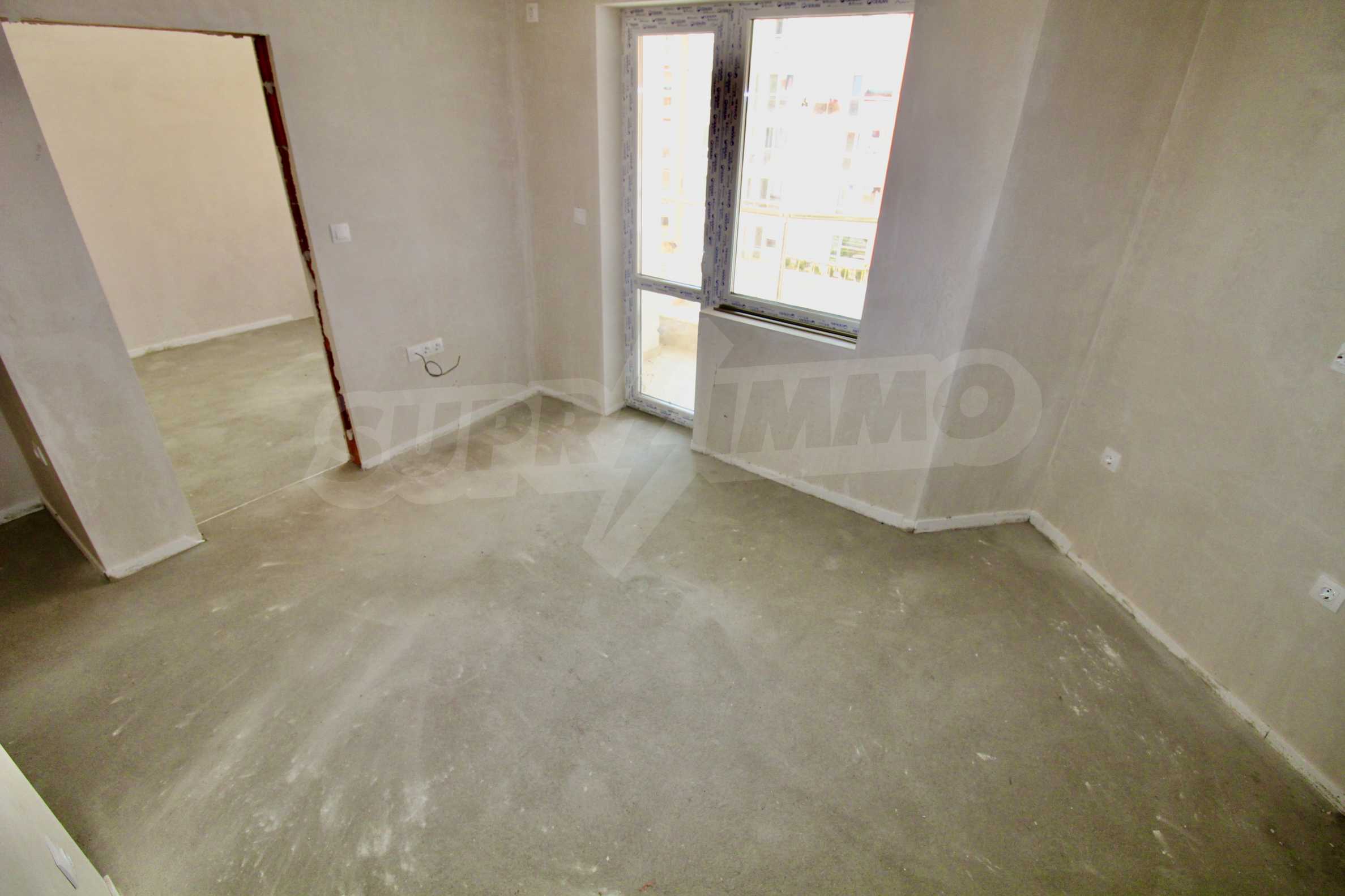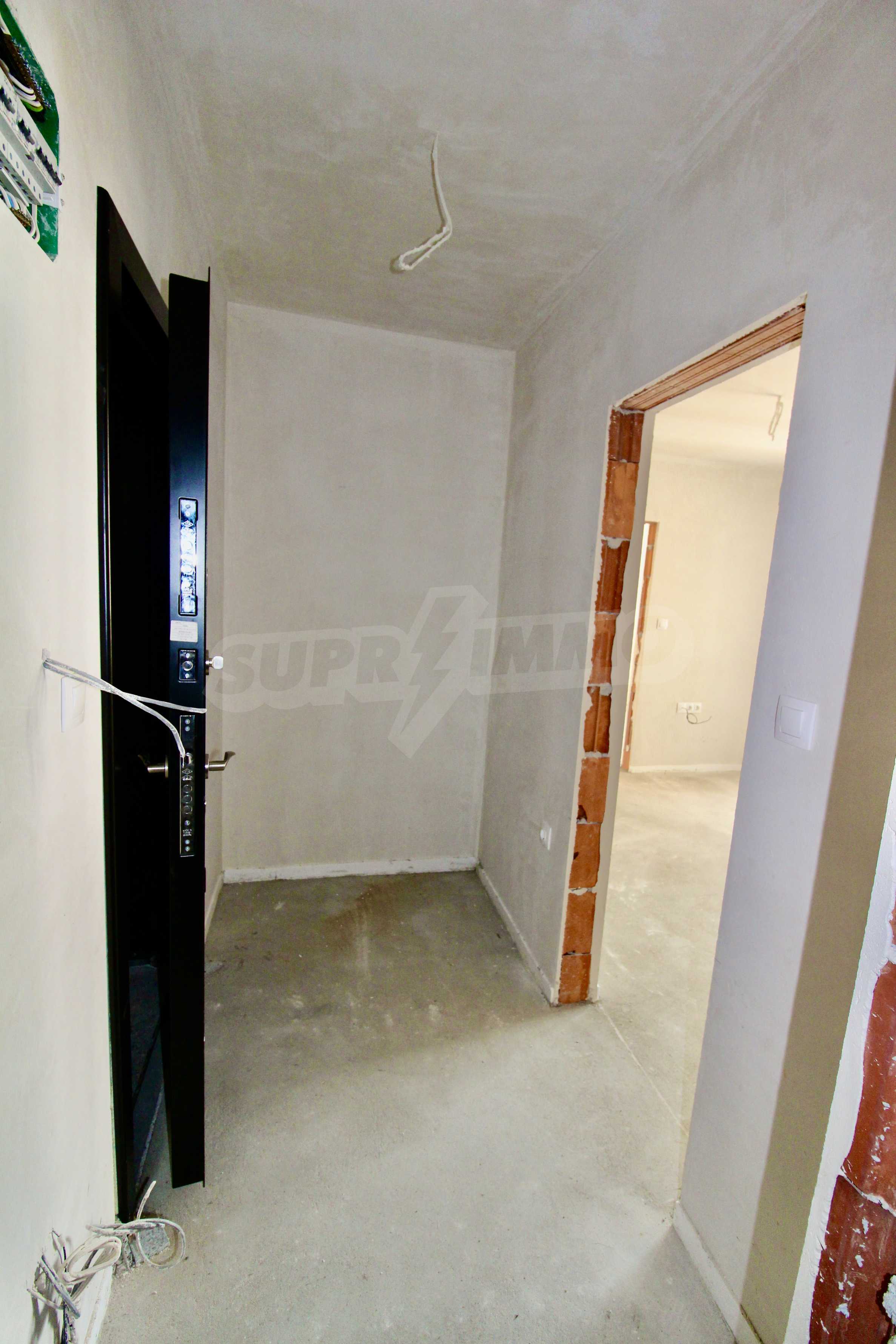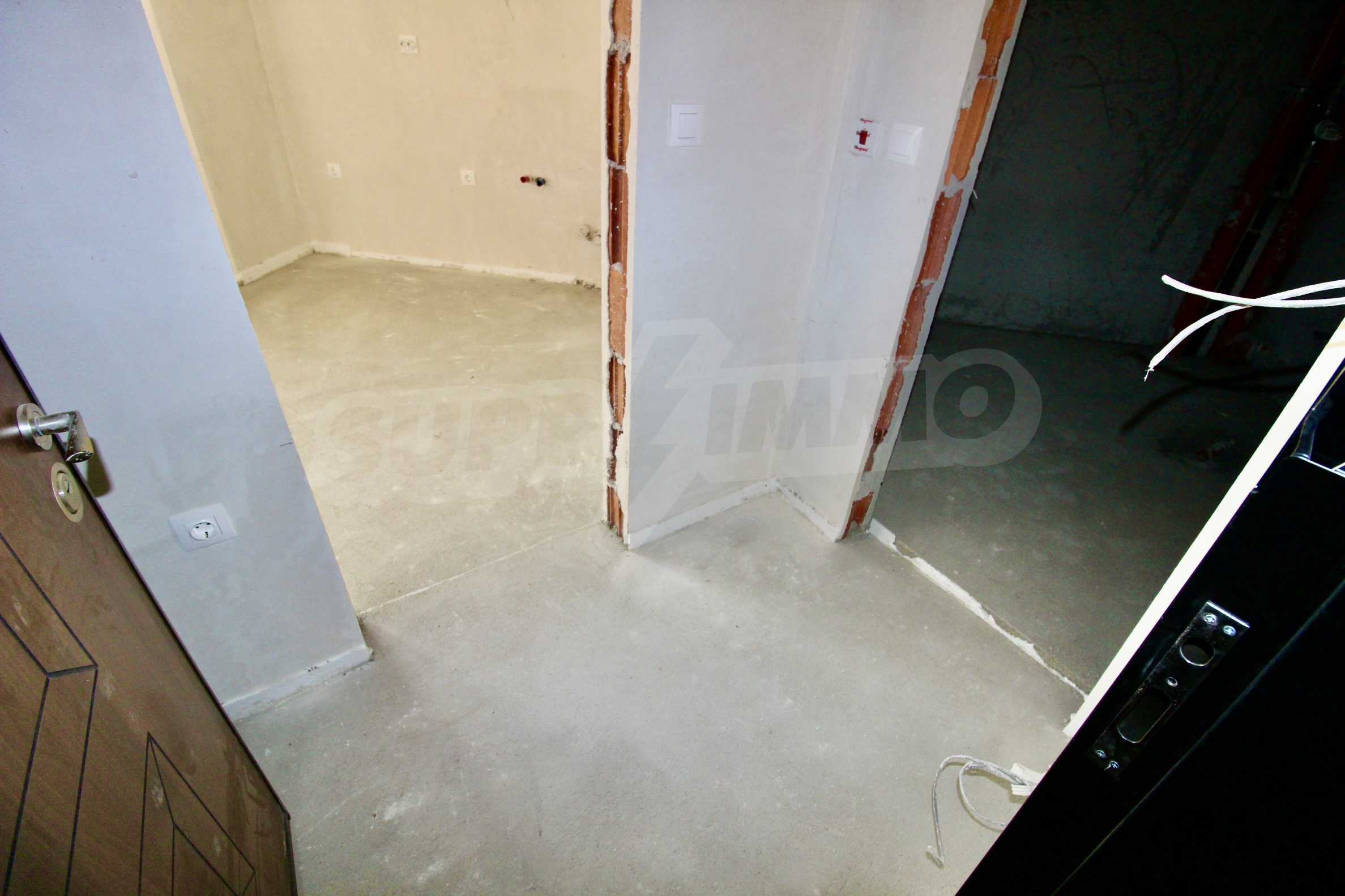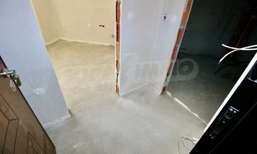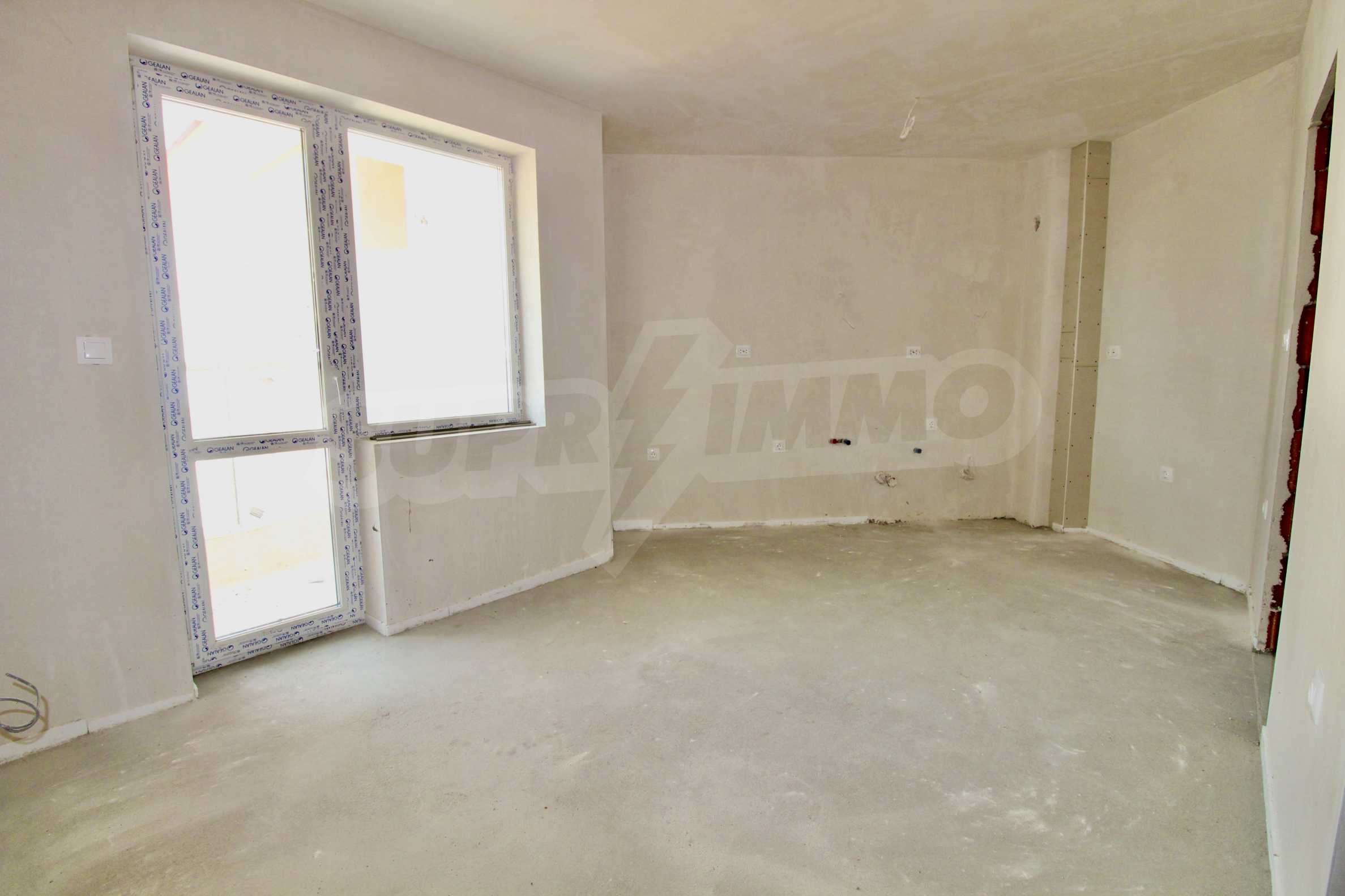 The apartment will have a degree of completion - windows with German profile, 70 mm, triple glazing - 4 mm four seasons, 4 mm white, and 4 mm low-emission (K) glass. The front door is armored with mineral wool filling. The interior doors are by the German company GRADDE, the flooring is plastered, the walls are plastered, and the external insulation provides efficient heating in the winter months and pleasant coolness in the summer.
