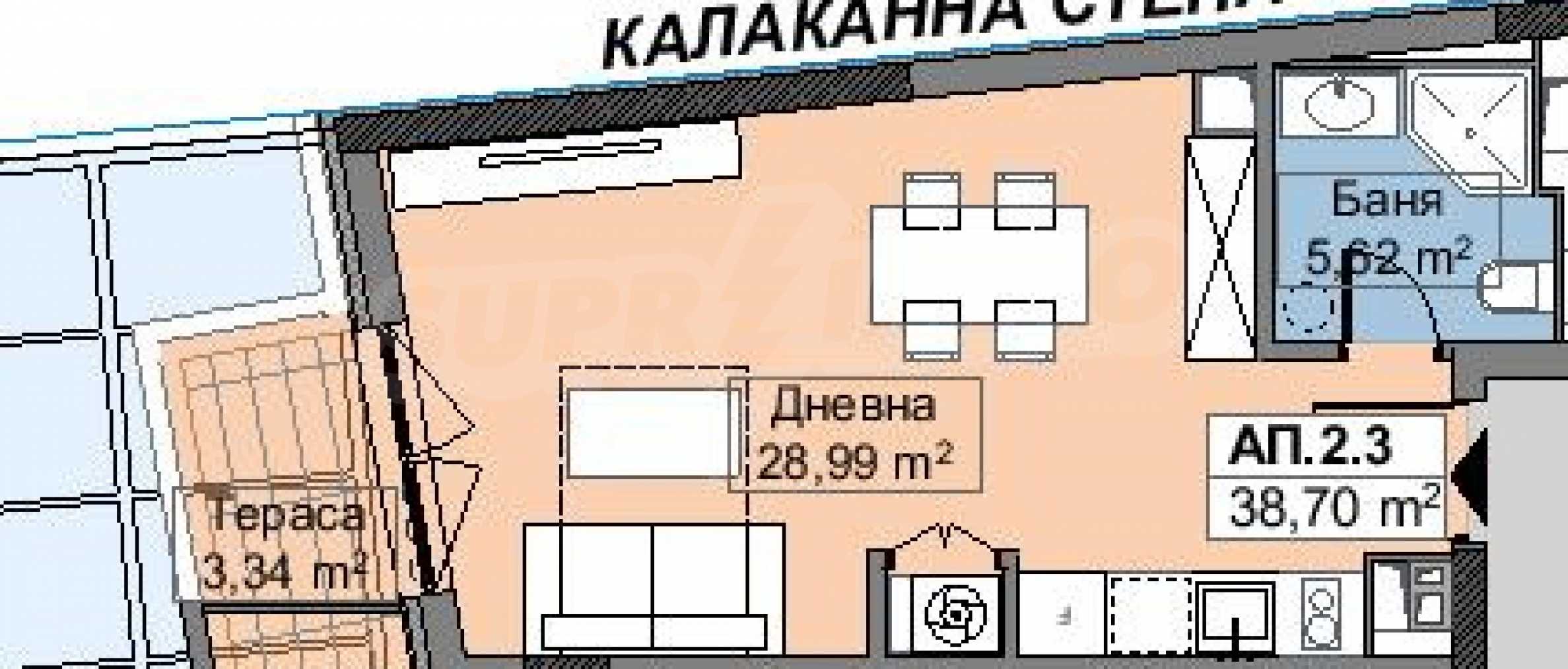 • Studio apartment consists of living room with kitchenette, sleeping area, bathroom with toilet, terrace, hallway. Built-up area 38 - 40 m2.