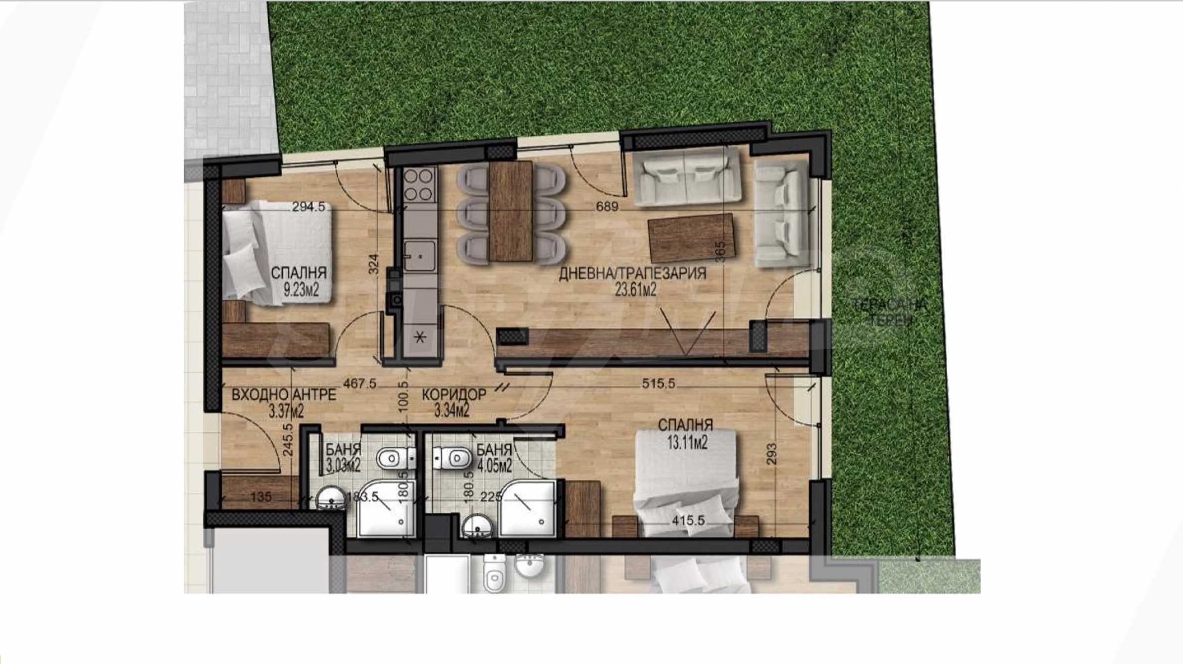 Distribution: corridor, bedroom, bathroom with toilet, living room with kitchen and dining area, bedroom, closet. Total living area: 130.67 m2., yard - 49.89 m2., net living area - 70.86, common areas - 9.92 m2.