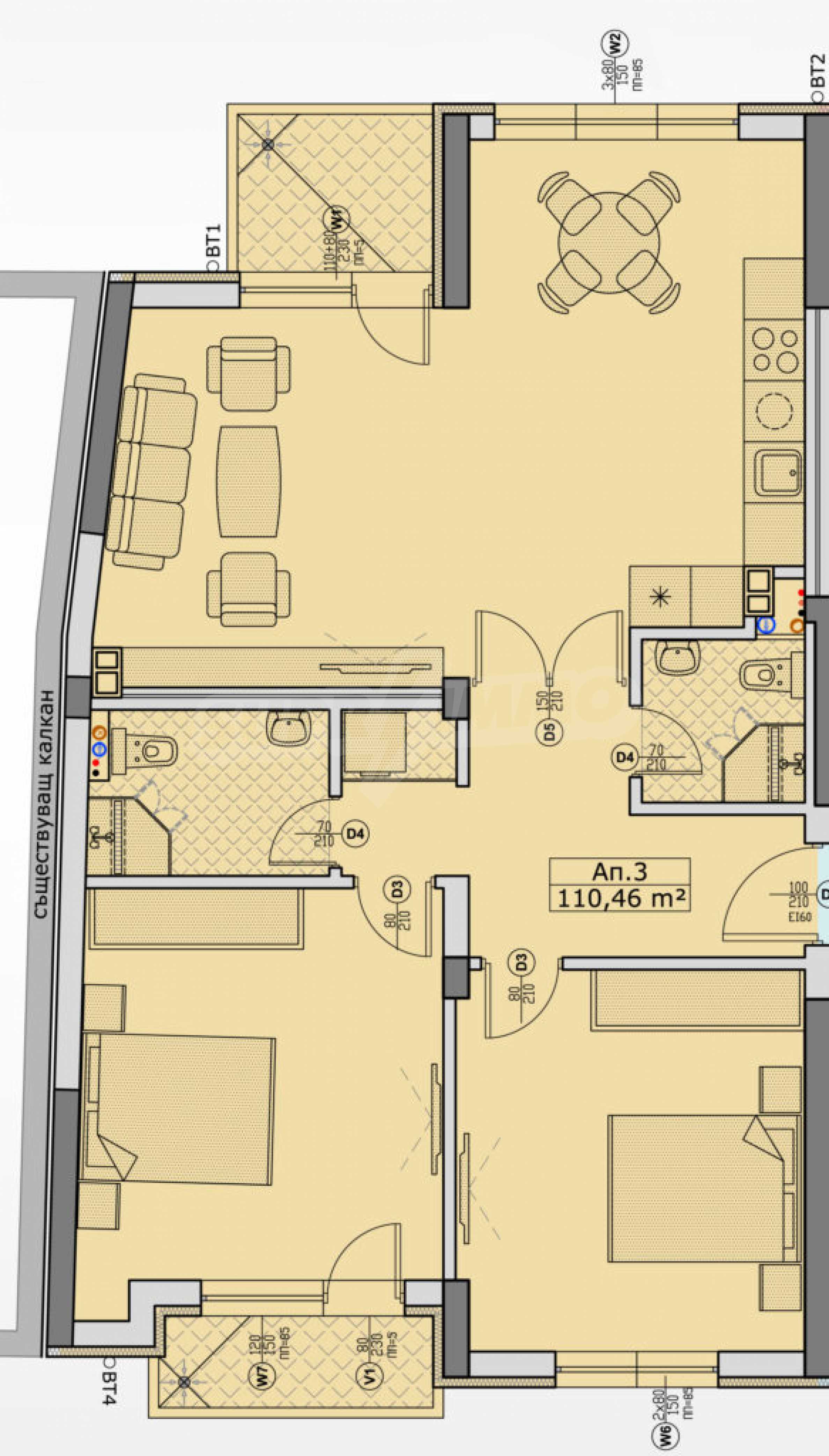 The apartment has a total area of 110.46 m2 / built-up area 93.89 m2 /. It consists of an entrance hall, a corridor, a spacious living room with a dining area and a kitchenette, two separate bedrooms, 2 bathrooms with a toilet and 2 terraces.