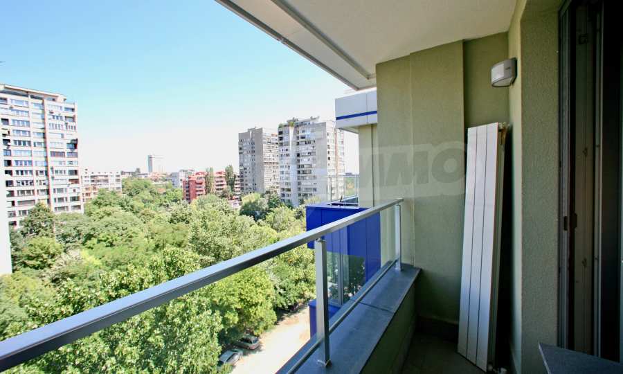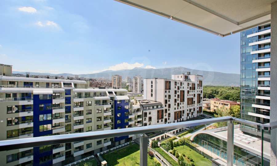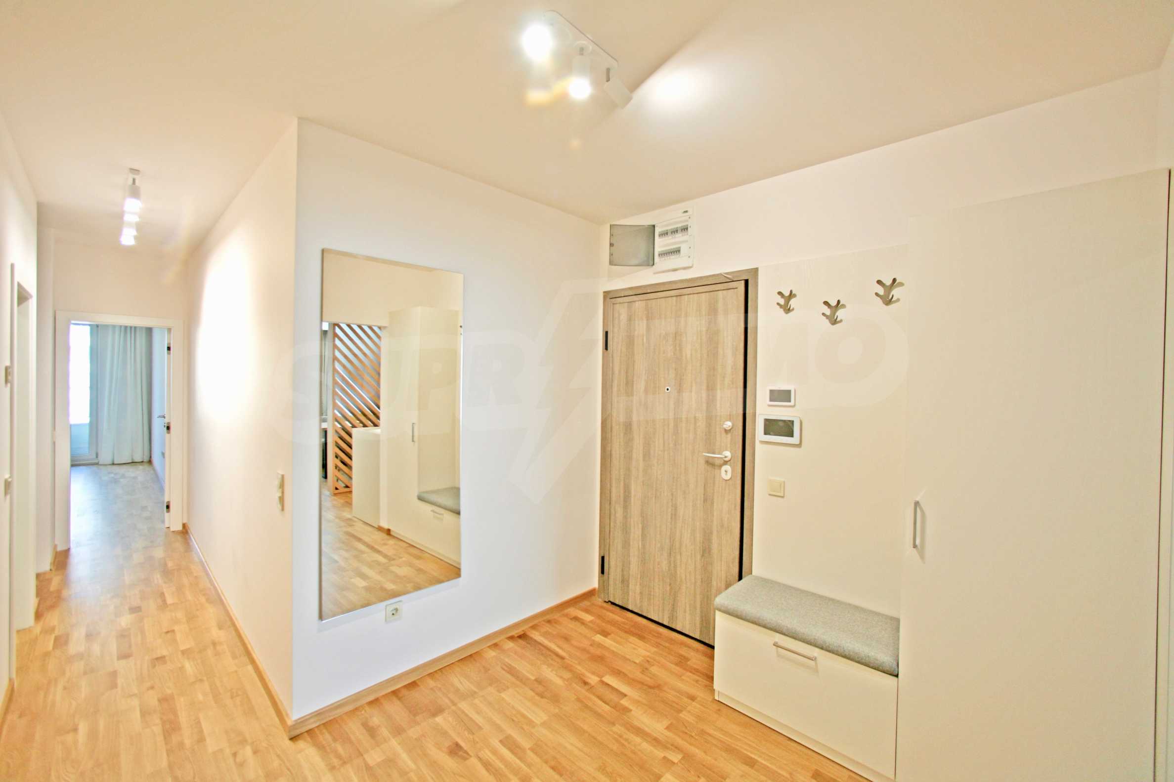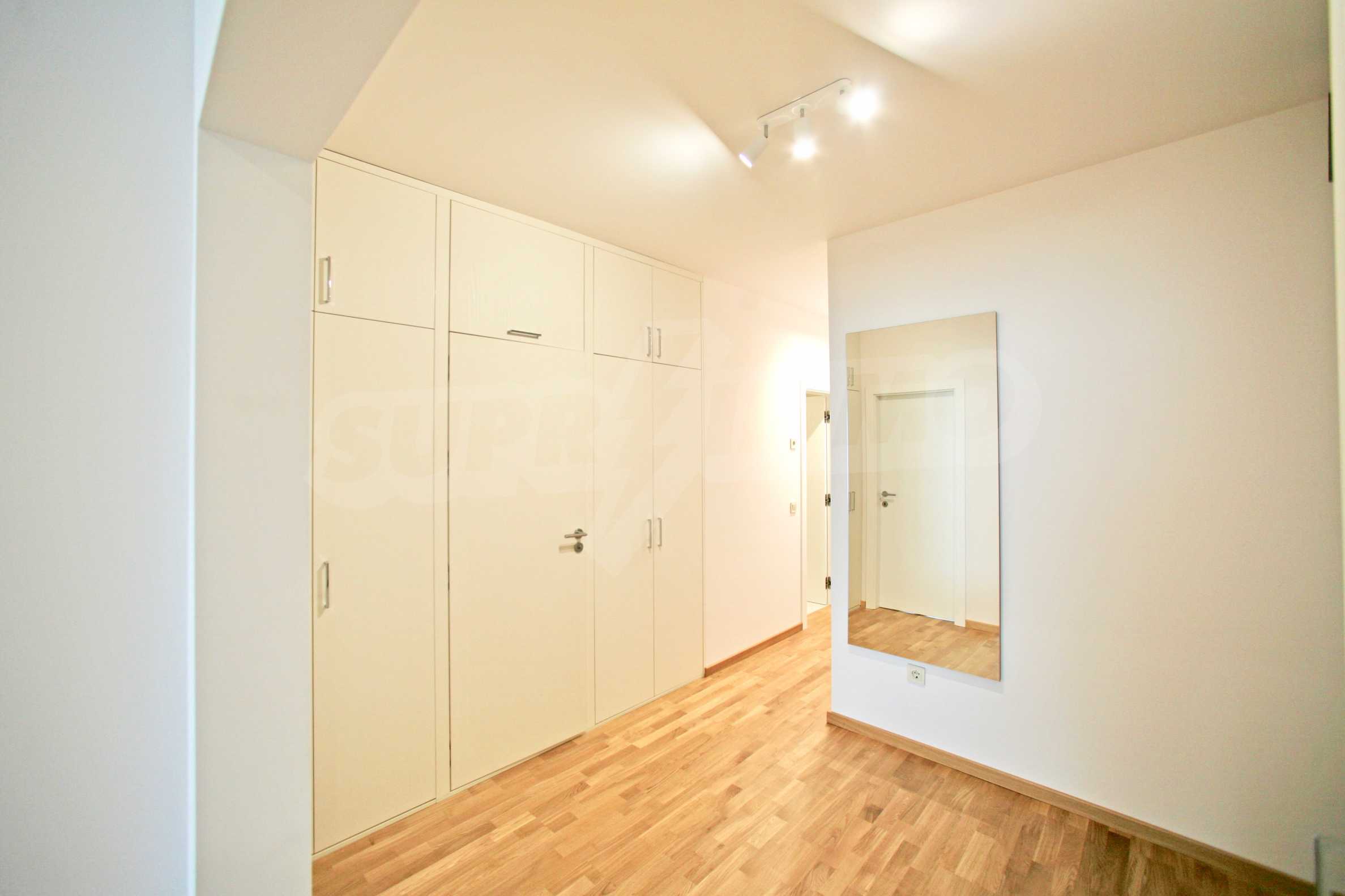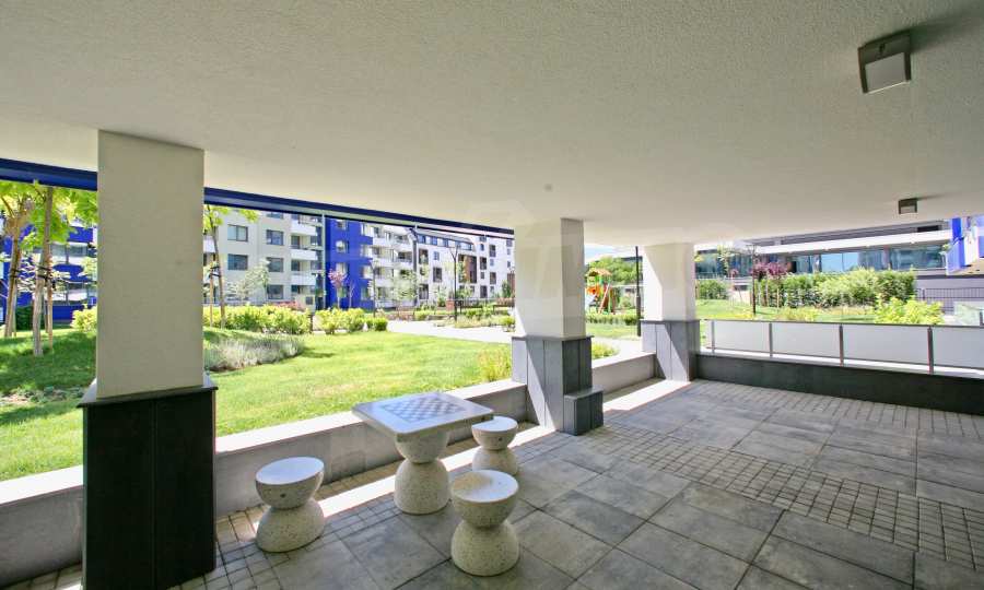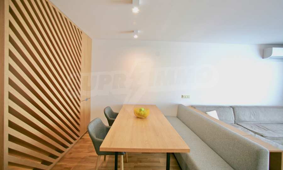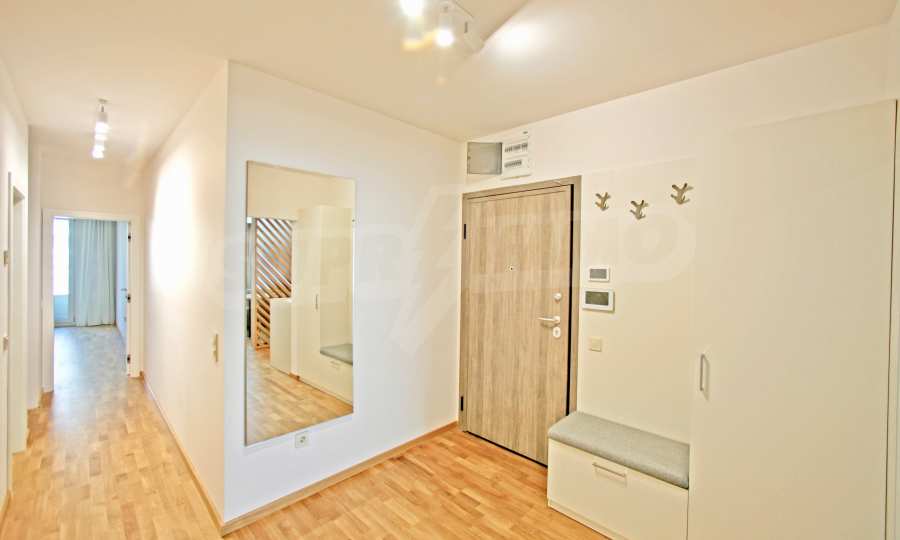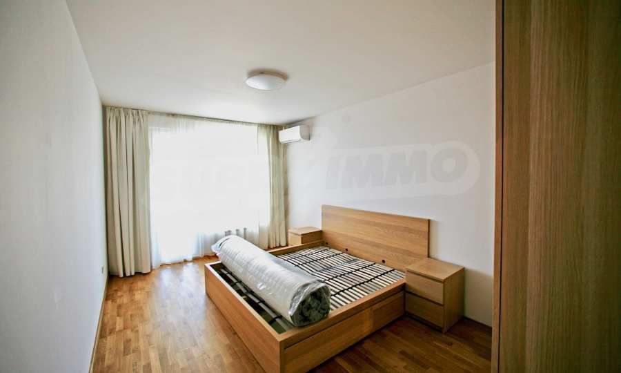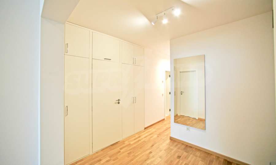 On an area of 114.62 m2. there are two bedrooms, a kitchen, a dining room, a living room, two bathrooms with toilets, two terraces (with northern and southern exposure) and a closet / closet. The kitchen is equipped with stove, hob, extractor, refrigerator and large dishwasher. The south-facing terrace has a great view of the city, Vitosha Mountain and the landscaped yard of the complex. According to the plan, the "Green Ring" bike lane will pass right in front of the entrance of the building. The apartment is on central heating, but there is an alternative with inverter air conditioners and electric water heater. The dining room with living room, open type, give the feeling of a spacious and spacious room, and the kitchen is separated by a beautiful wooden partition. The corridor has a large area and has many cabinets for storage. One of the bedrooms is furnished with a large double bed, and the other can be furnished at the choice of future tenants. The floor in the apartment is made of natural wood - oak. The rental price includes two garages with separate doors and a total area of 32.69 m2.
