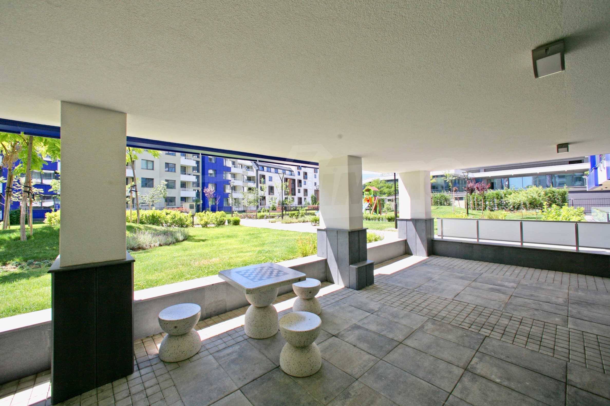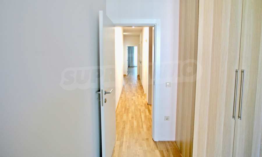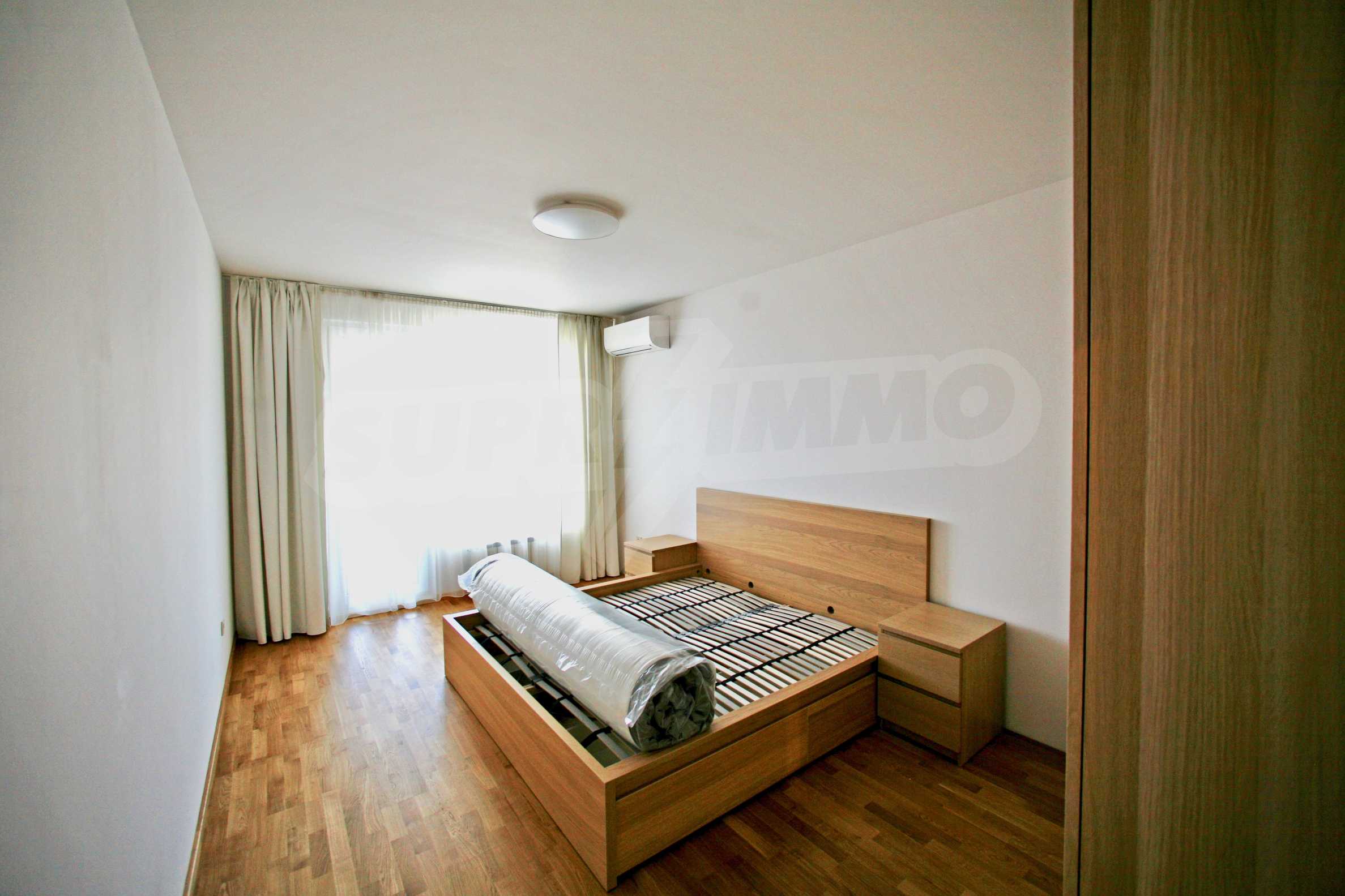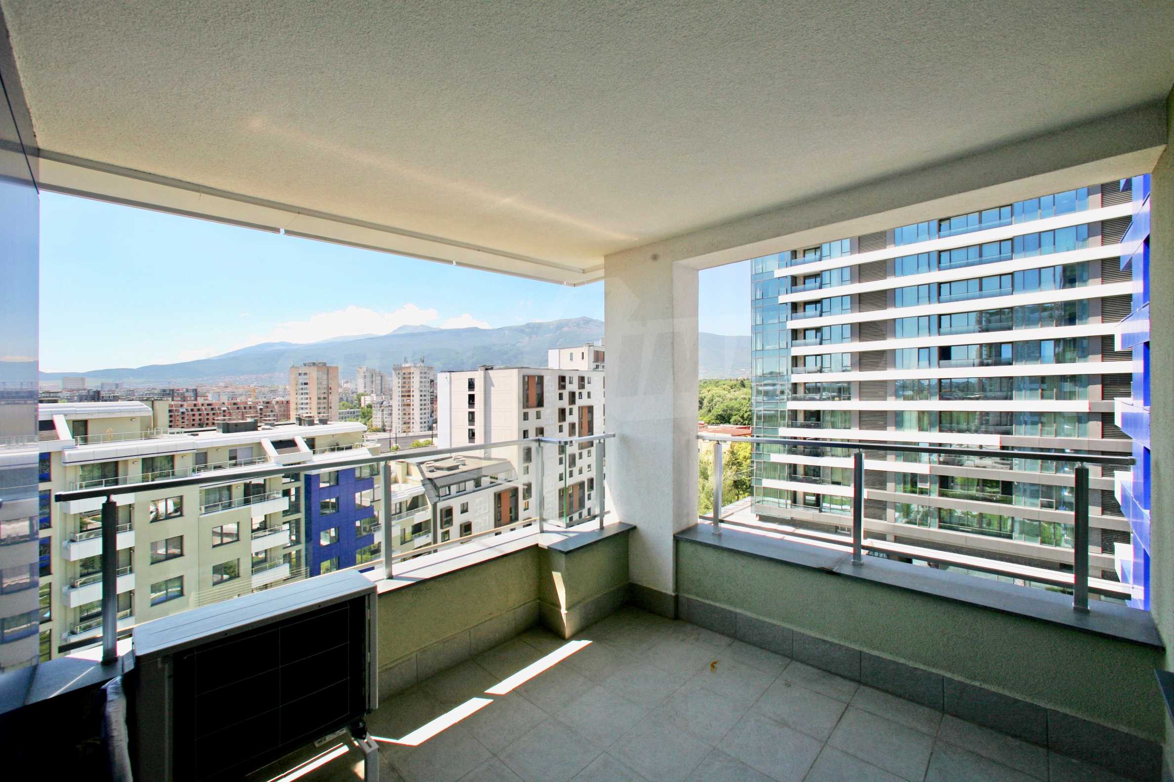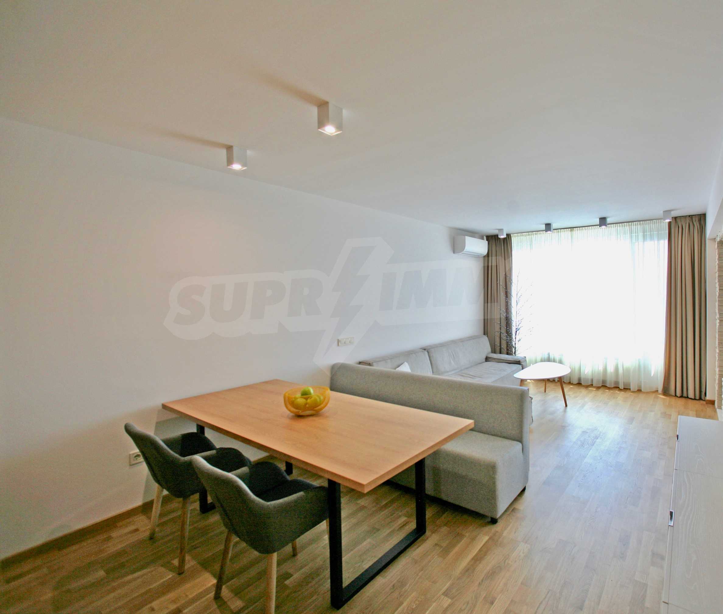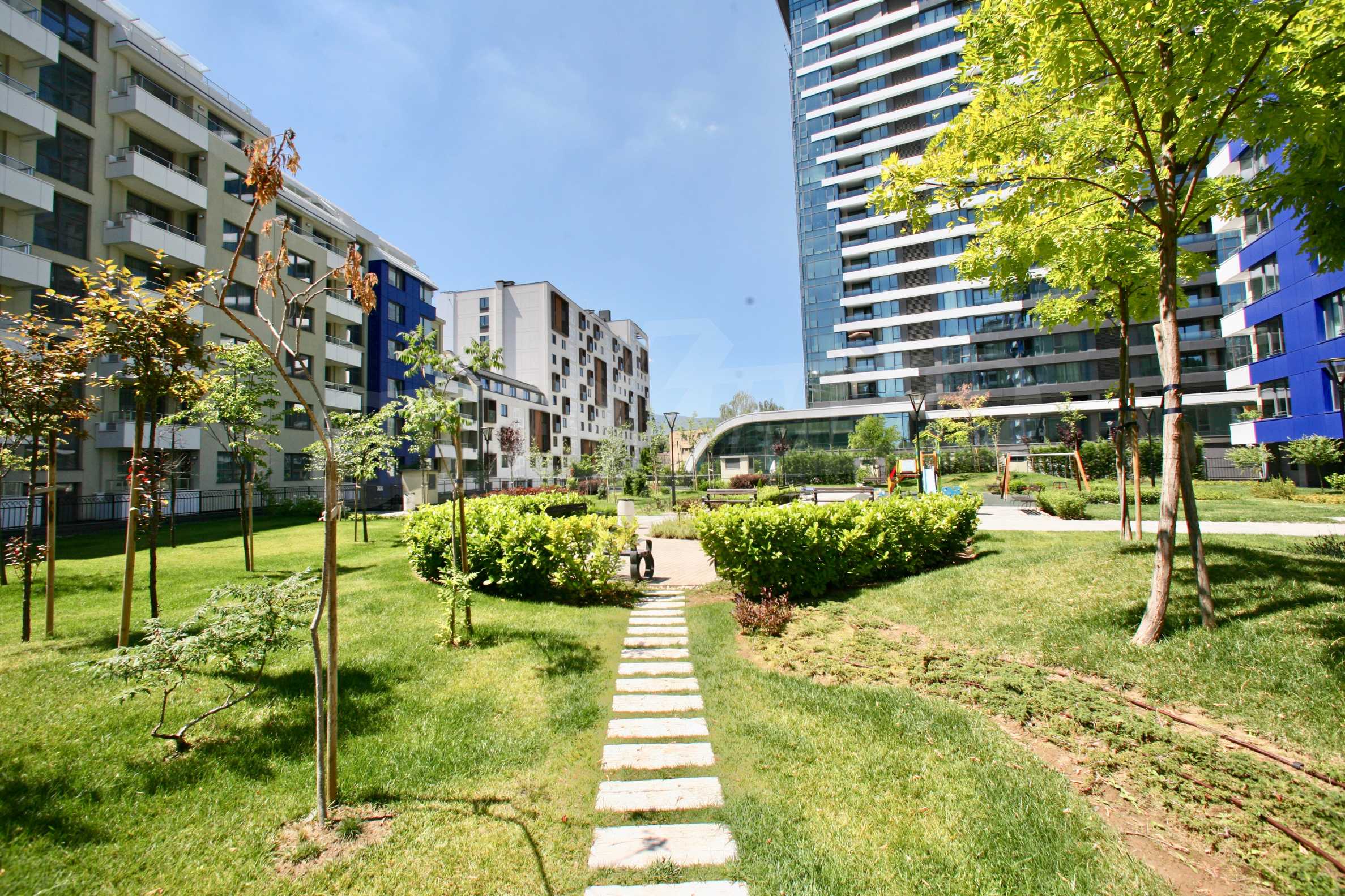 On an area of 114.62 m2. there are two bedrooms, a kitchen, a dining room, a living room, two bathrooms with toilets, two terraces (with northern and southern exposure) and a closet / closet. The kitchen is equipped with stove, hob, extractor, refrigerator and large dishwasher. The south-facing terrace has a great view of the city, Vitosha Mountain and the landscaped yard of the complex. According to the plan, the "Green Ring" bike lane will pass right in front of the entrance of the building. The apartment is on central heating, but there is an alternative with inverter air conditioners and electric water heater. The dining room with living room, open type, give the feeling of a spacious and spacious room, and the kitchen is separated by a beautiful wooden partition. The corridor has a large area and has many cabinets for storage. One of the bedrooms is furnished with a large double bed, and the other can be furnished at the choice of future tenants. The floor in the apartment is made of natural wood - oak. The rental price includes two garages with separate doors and a total area of 32.69 m2.