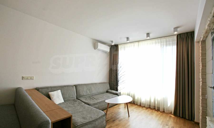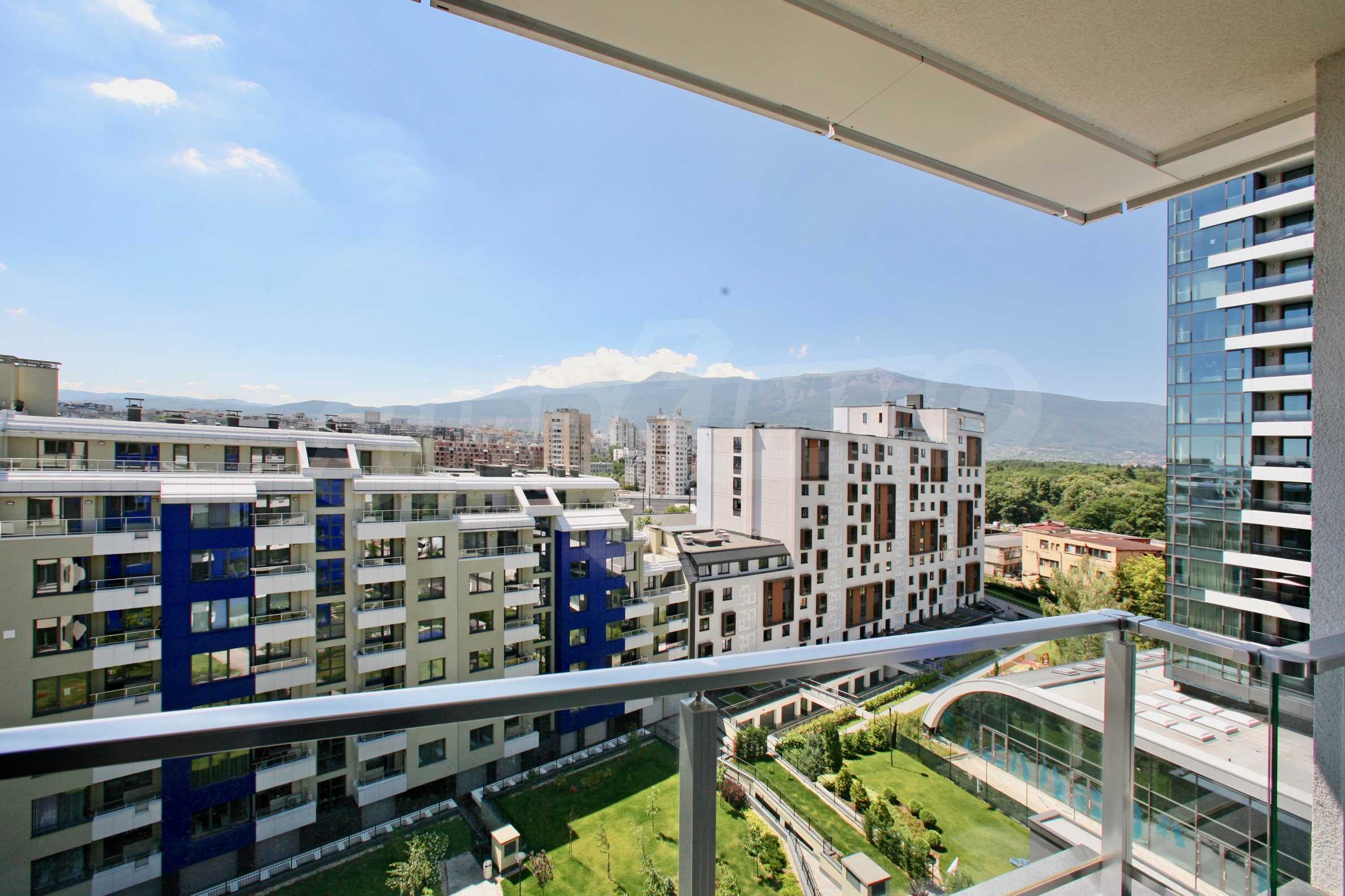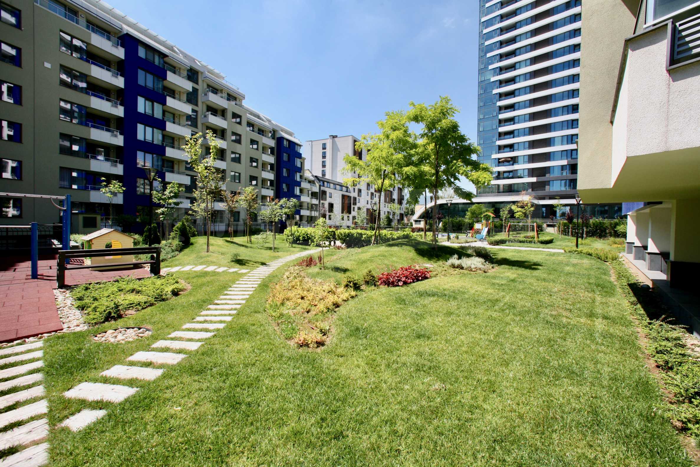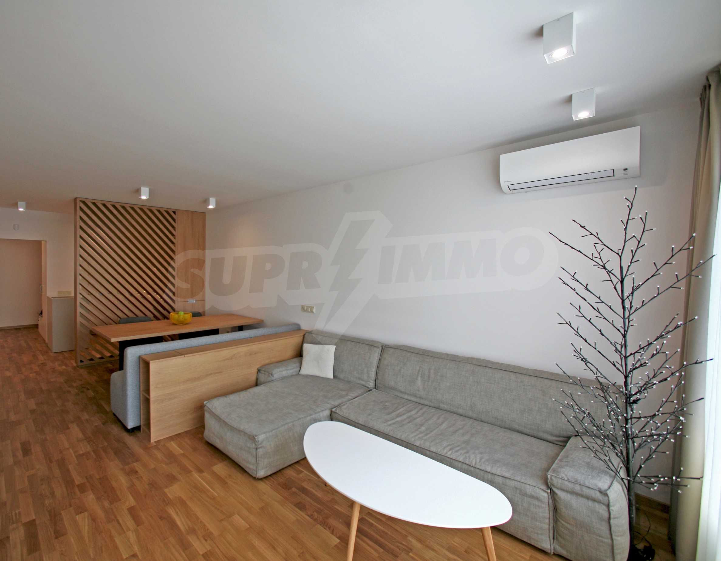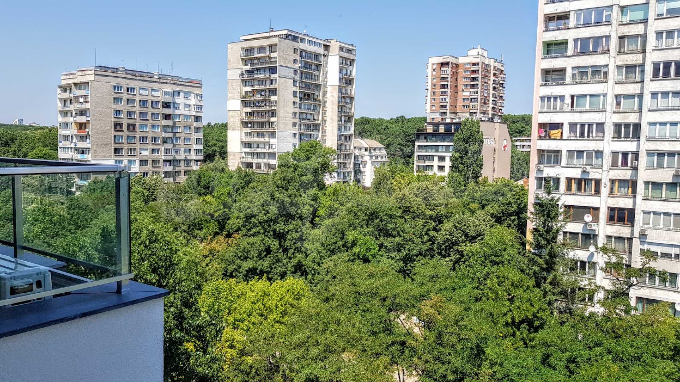 On an area of 114.62 m2. there are two bedrooms, a kitchen, a dining room, a living room, two bathrooms with toilets, two terraces (with northern and southern exposure) and a closet / closet. The kitchen is equipped with stove, hob, extractor, refrigerator and large dishwasher. The south-facing terrace has a great view of the city, Vitosha Mountain and the landscaped yard of the complex. According to the plan, the "Green Ring" bike lane will pass right in front of the entrance of the building. The apartment is on central heating, but there is an alternative with inverter air conditioners and electric water heater. The dining room with living room, open type, give the feeling of a spacious and spacious room, and the kitchen is separated by a beautiful wooden partition. The corridor has a large area and has many cabinets for storage. One of the bedrooms is furnished with a large double bed, and the other can be furnished at the choice of future tenants. The floor in the apartment is made of natural wood - oak. The rental price includes two garages with separate doors and a total area of 32.69 m2.