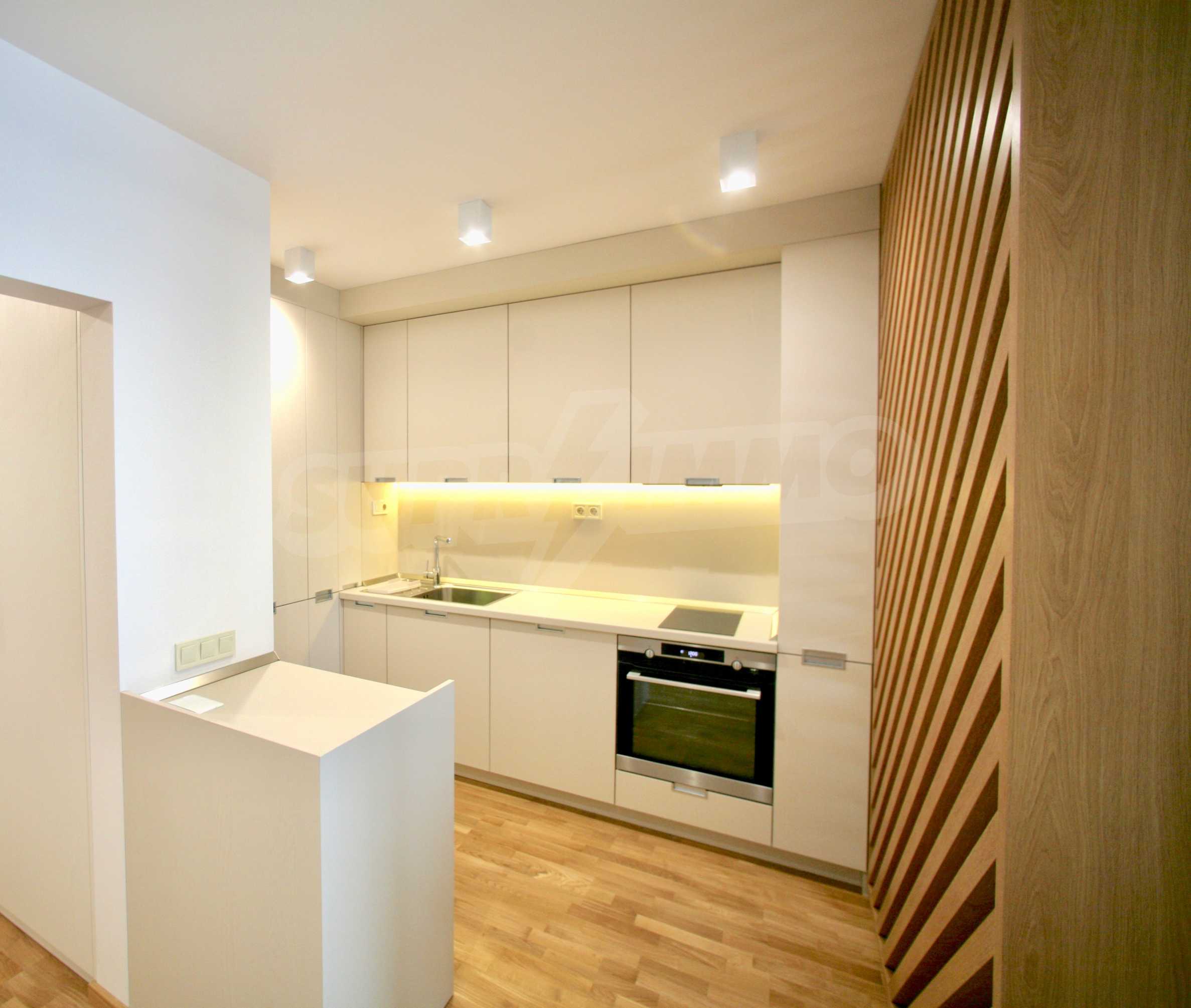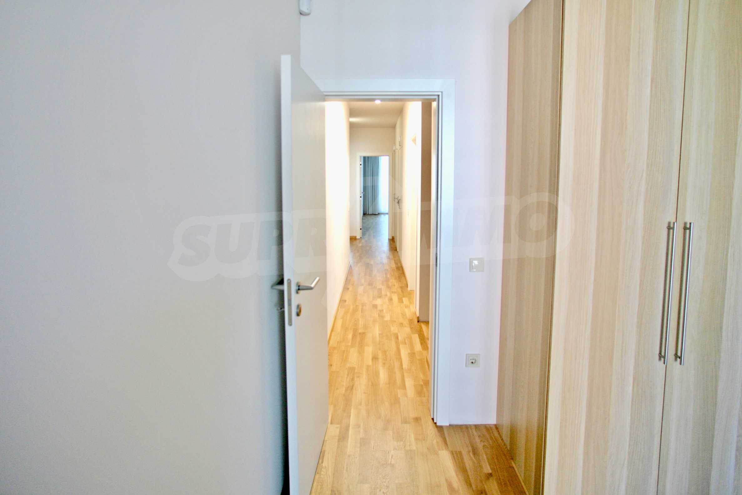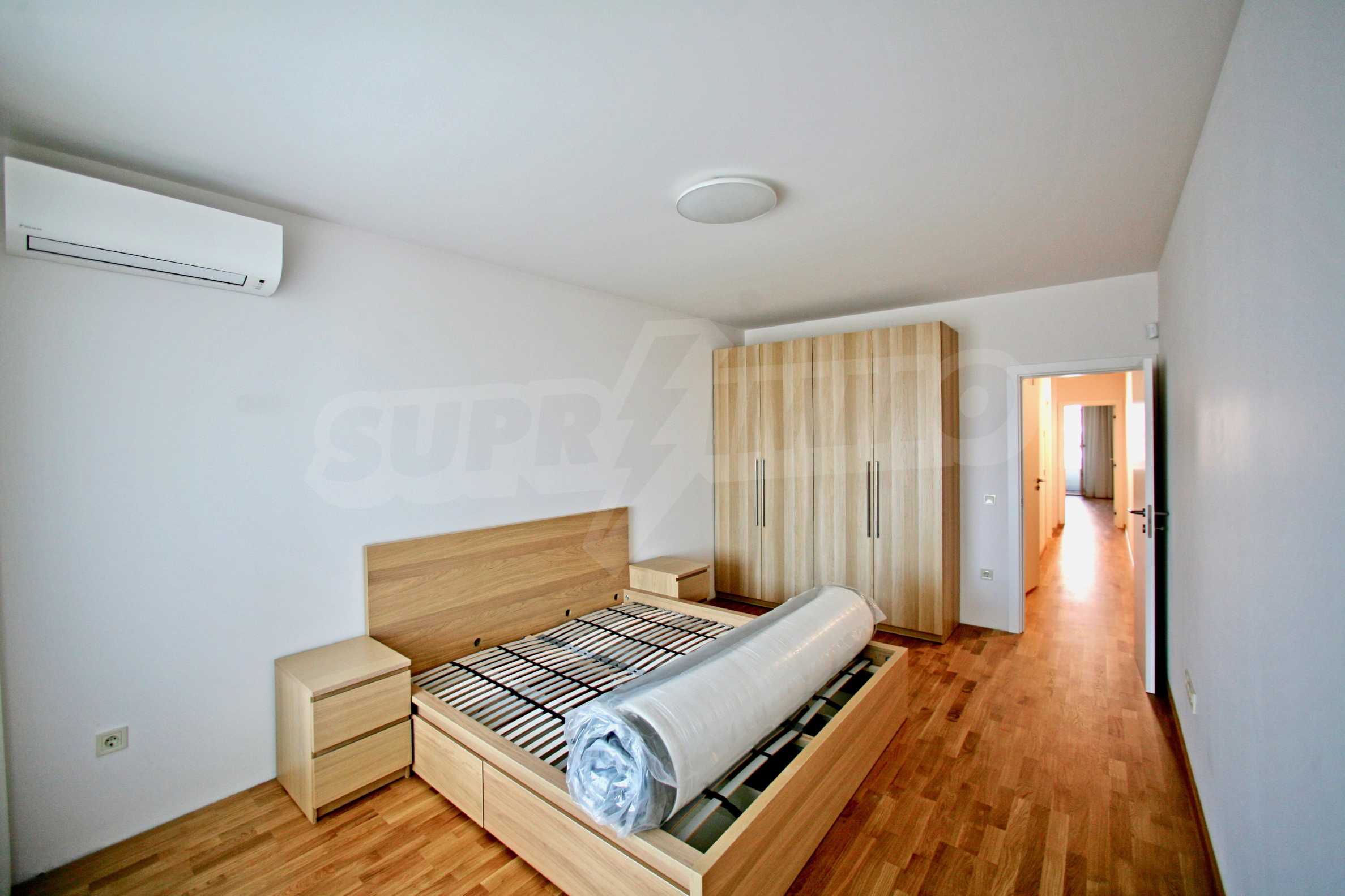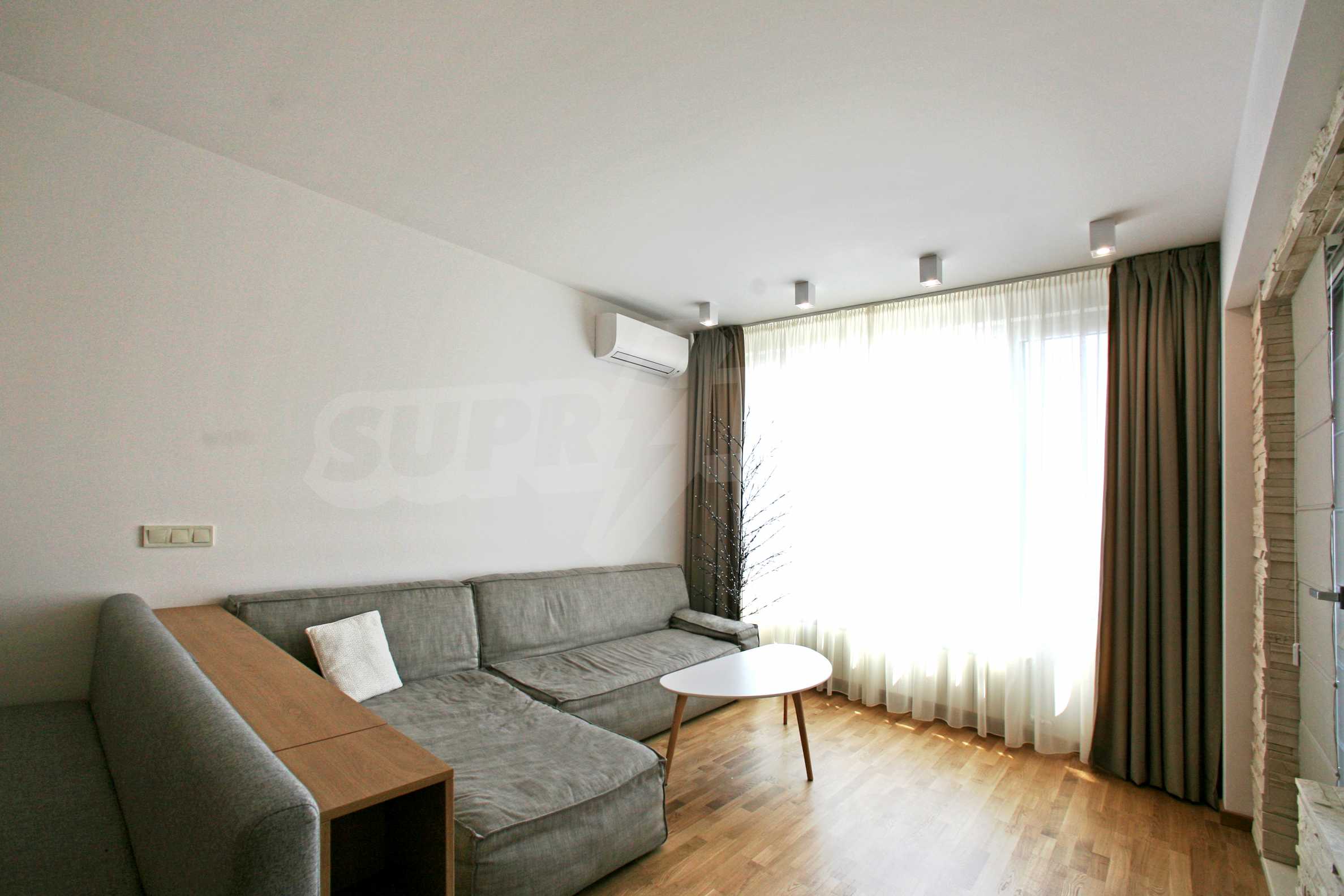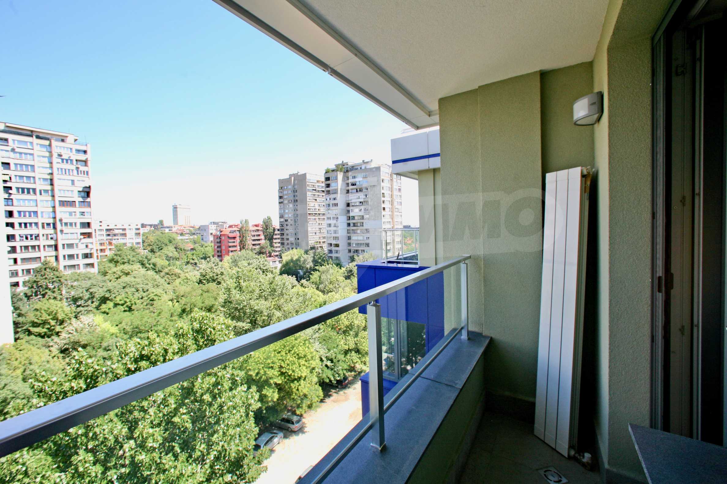 On an area of 114.62 m2. there are two bedrooms, a kitchen, a dining room, a living room, two bathrooms with toilets, two terraces (with northern and southern exposure) and a closet / closet. The kitchen is equipped with stove, hob, extractor, refrigerator and large dishwasher. The south-facing terrace has a great view of the city, Vitosha Mountain and the landscaped yard of the complex. According to the plan, the "Green Ring" bike lane will pass right in front of the entrance of the building. The apartment is on central heating, but there is an alternative with inverter air conditioners and electric water heater. The dining room with living room, open type, give the feeling of a spacious and spacious room, and the kitchen is separated by a beautiful wooden partition. The corridor has a large area and has many cabinets for storage. One of the bedrooms is furnished with a large double bed, and the other can be furnished at the choice of future tenants. The floor in the apartment is made of natural wood - oak. The rental price includes two garages with separate doors and a total area of 32.69 m2.