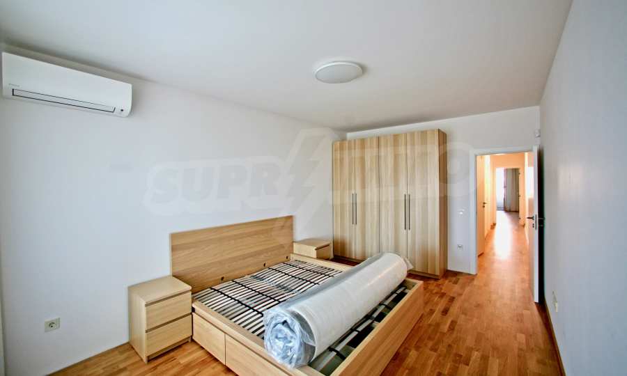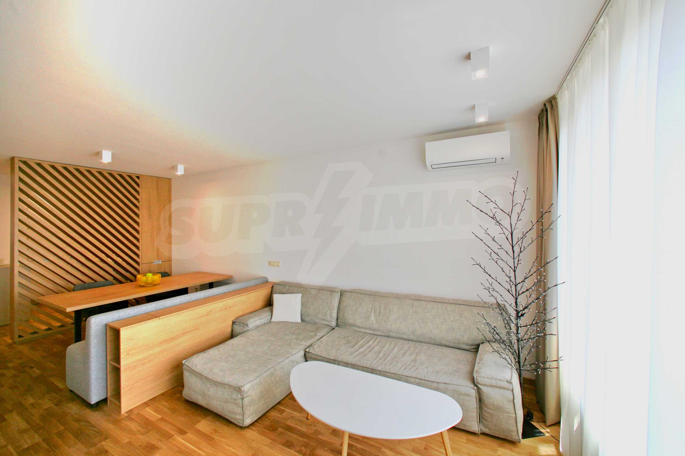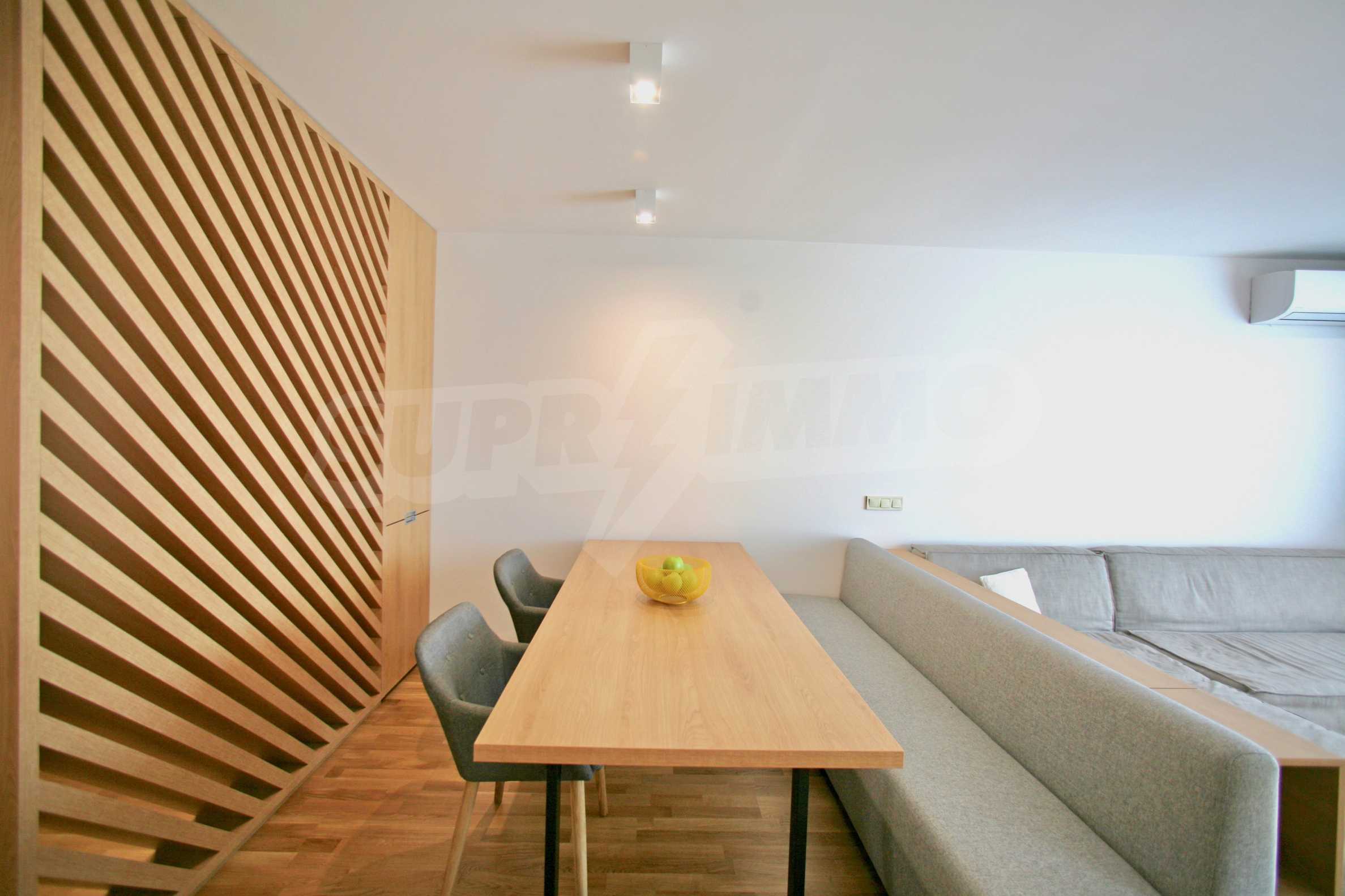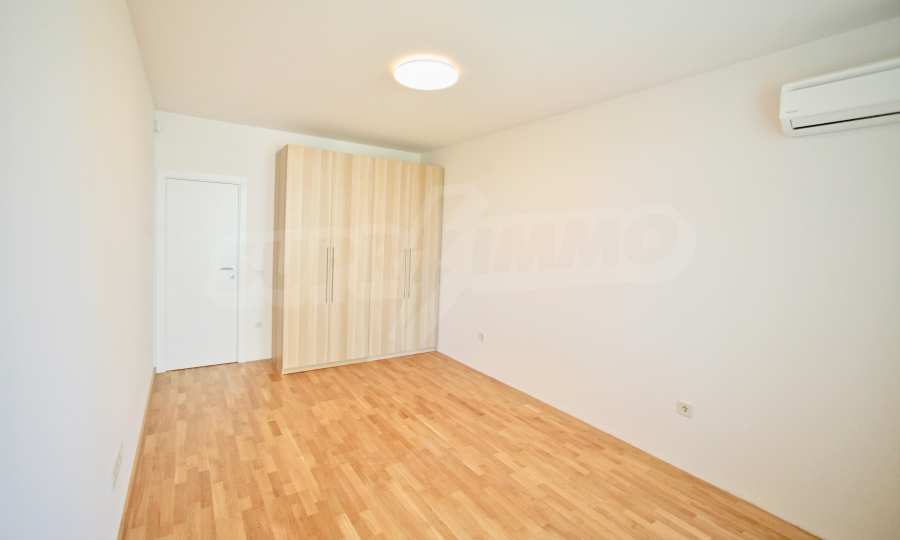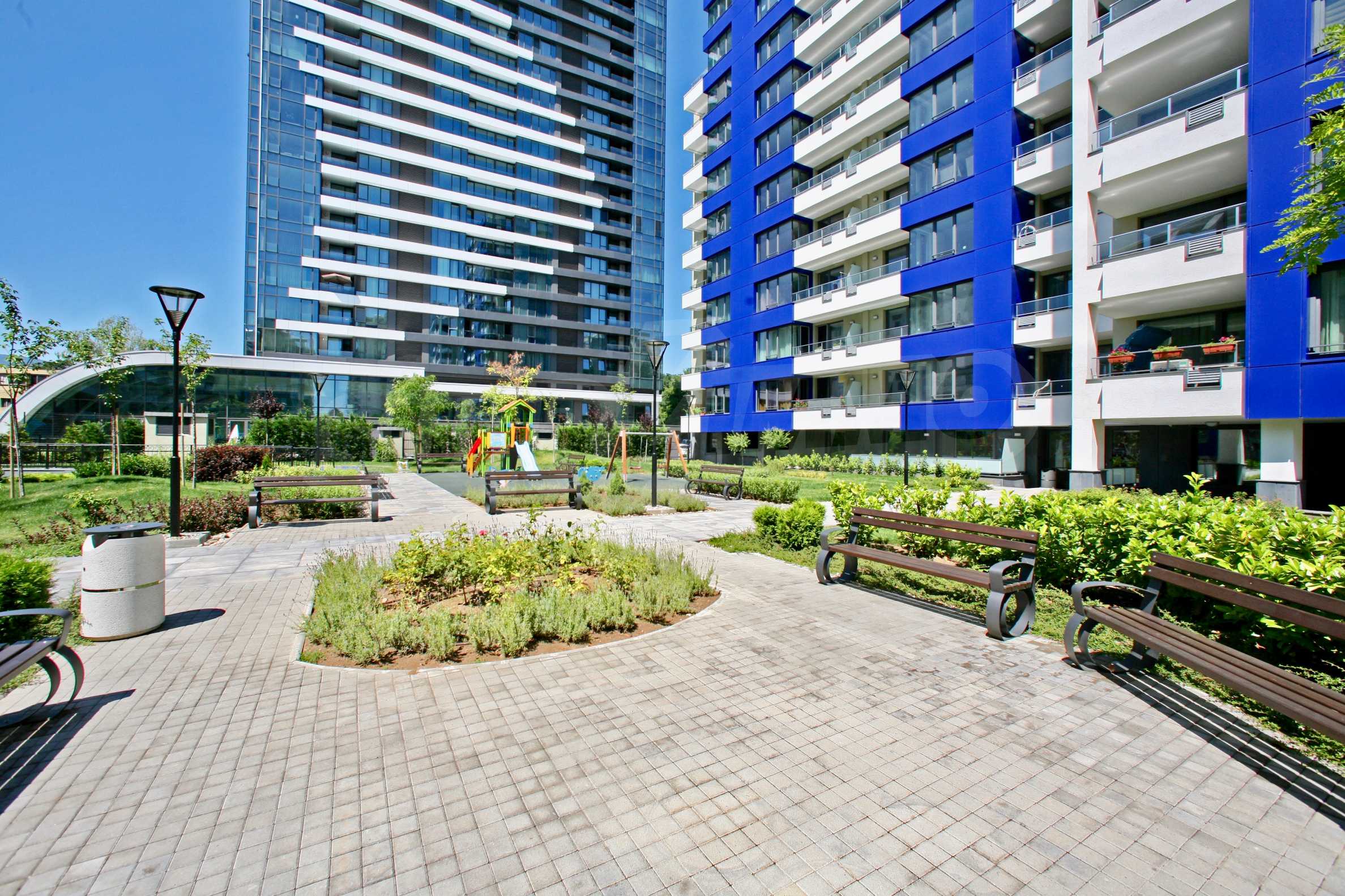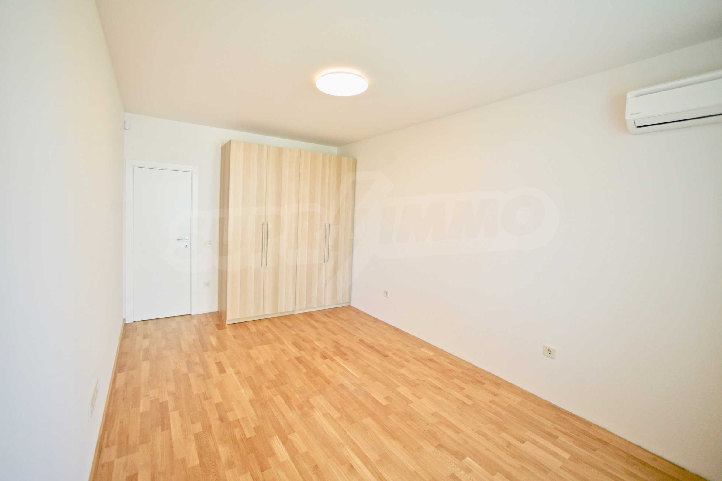 On an area of 114.62 m2. there are two bedrooms, a kitchen, a dining room, a living room, two bathrooms with toilets, two terraces (with northern and southern exposure) and a closet / closet. The kitchen is equipped with stove, hob, extractor, refrigerator and large dishwasher. The south-facing terrace has a great view of the city, Vitosha Mountain and the landscaped yard of the complex. According to the plan, the "Green Ring" bike lane will pass right in front of the entrance of the building. The apartment is on central heating, but there is an alternative with inverter air conditioners and electric water heater. The dining room with living room, open type, give the feeling of a spacious and spacious room, and the kitchen is separated by a beautiful wooden partition. The corridor has a large area and has many cabinets for storage. One of the bedrooms is furnished with a large double bed, and the other can be furnished at the choice of future tenants. The floor in the apartment is made of natural wood - oak. The rental price includes two garages with separate doors and a total area of 32.69 m2.