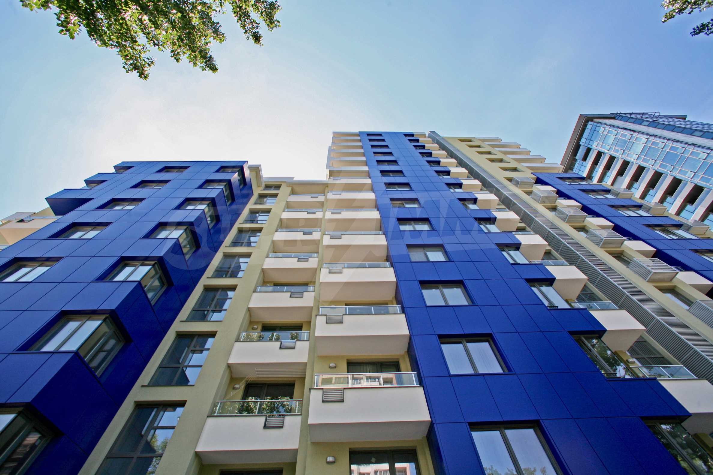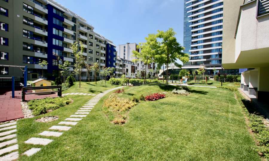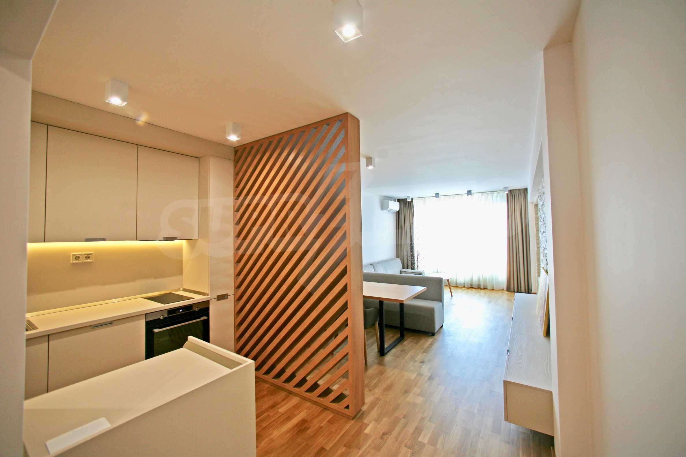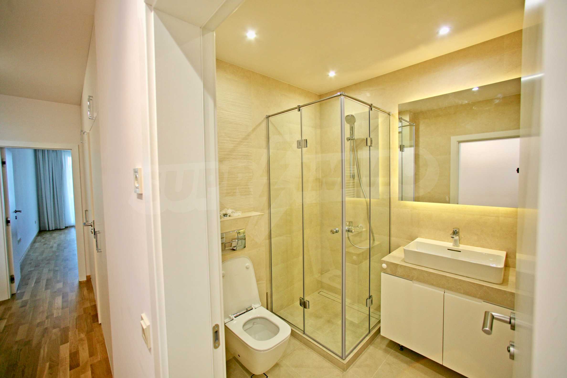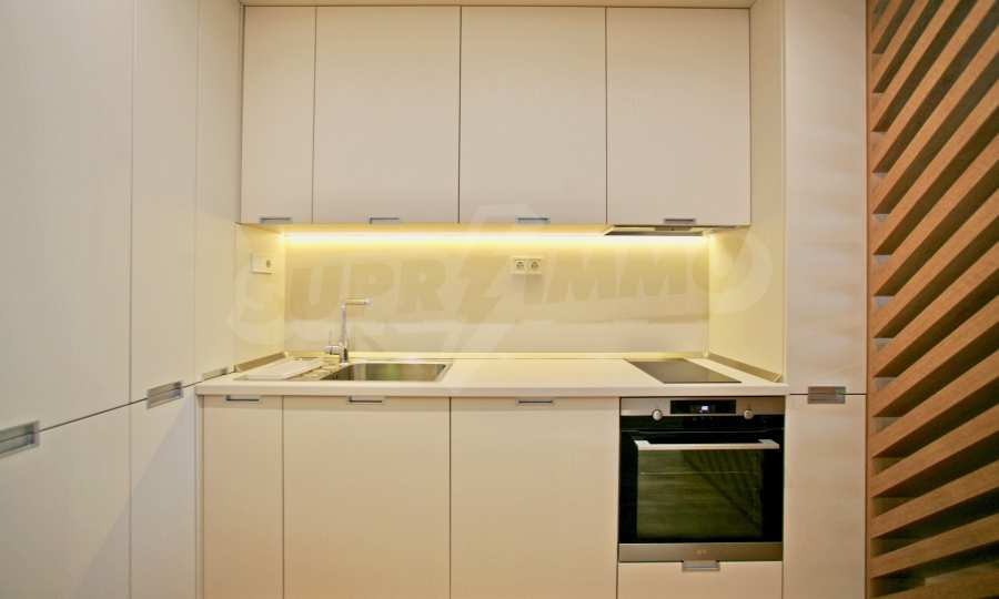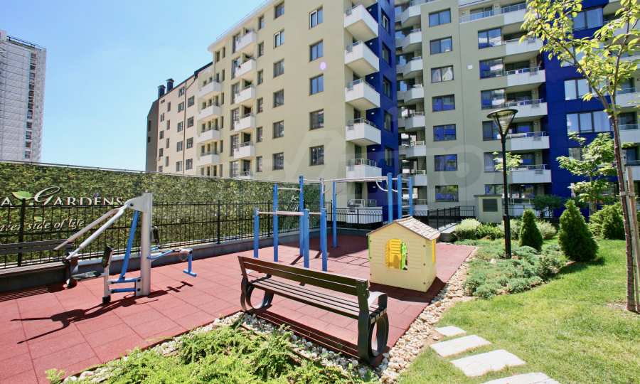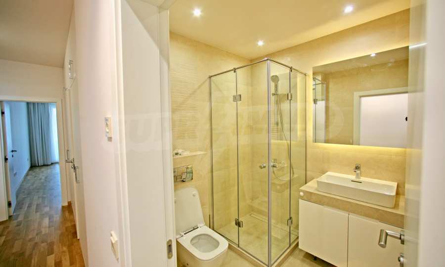 On an area of 114.62 m2. there are two bedrooms, a kitchen, a dining room, a living room, two bathrooms with toilets, two terraces (with northern and southern exposure) and a closet / closet. The kitchen is equipped with stove, hob, extractor, refrigerator and large dishwasher. The south-facing terrace has a great view of the city, Vitosha Mountain and the landscaped yard of the complex. According to the plan, the "Green Ring" bike lane will pass right in front of the entrance of the building. The apartment is on central heating, but there is an alternative with inverter air conditioners and electric water heater. The dining room with living room, open type, give the feeling of a spacious and spacious room, and the kitchen is separated by a beautiful wooden partition. The corridor has a large area and has many cabinets for storage. One of the bedrooms is furnished with a large double bed, and the other can be furnished at the choice of future tenants. The floor in the apartment is made of natural wood - oak. The rental price includes two garages with separate doors and a total area of 32.69 m2.