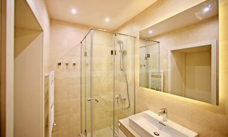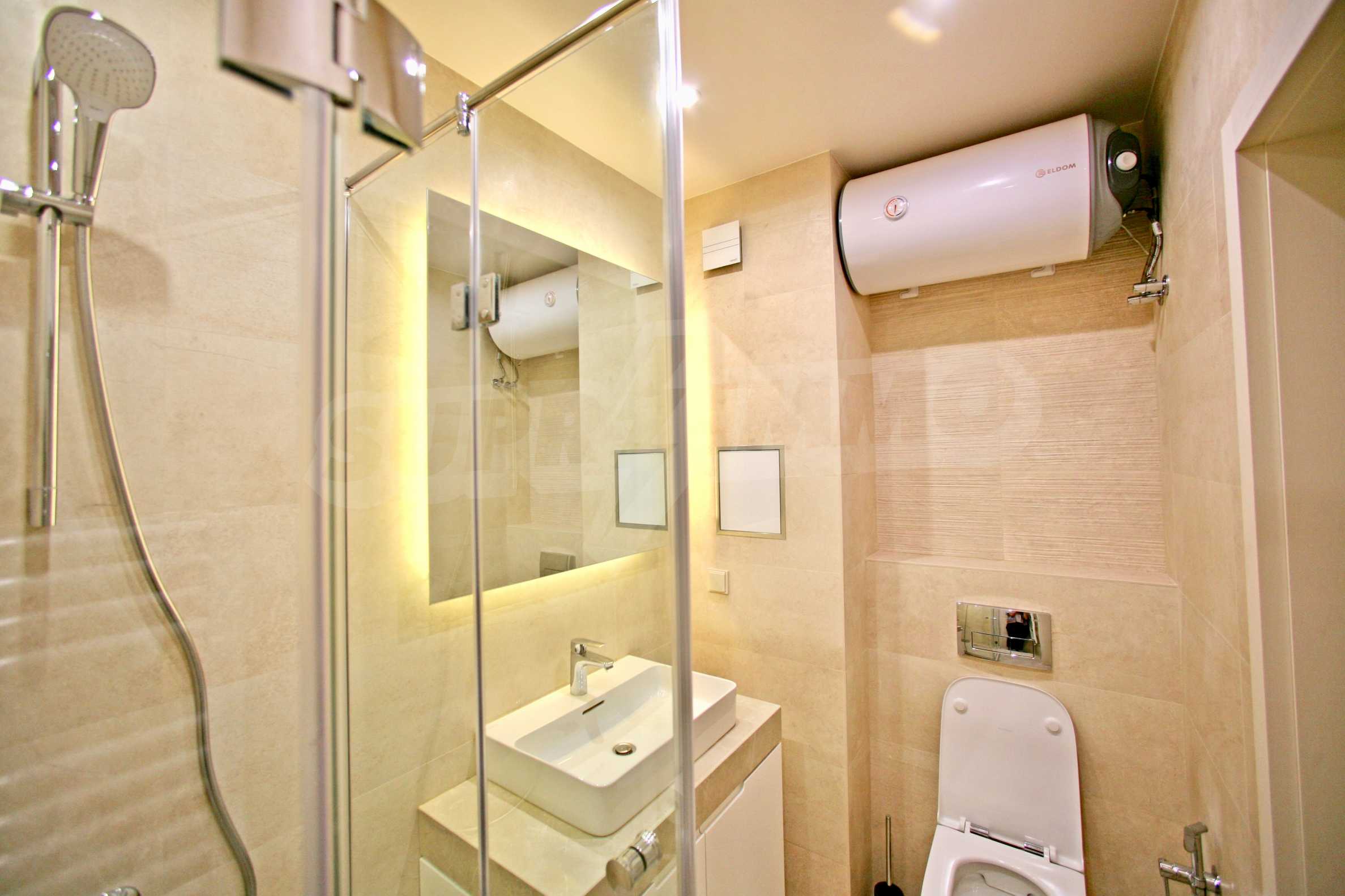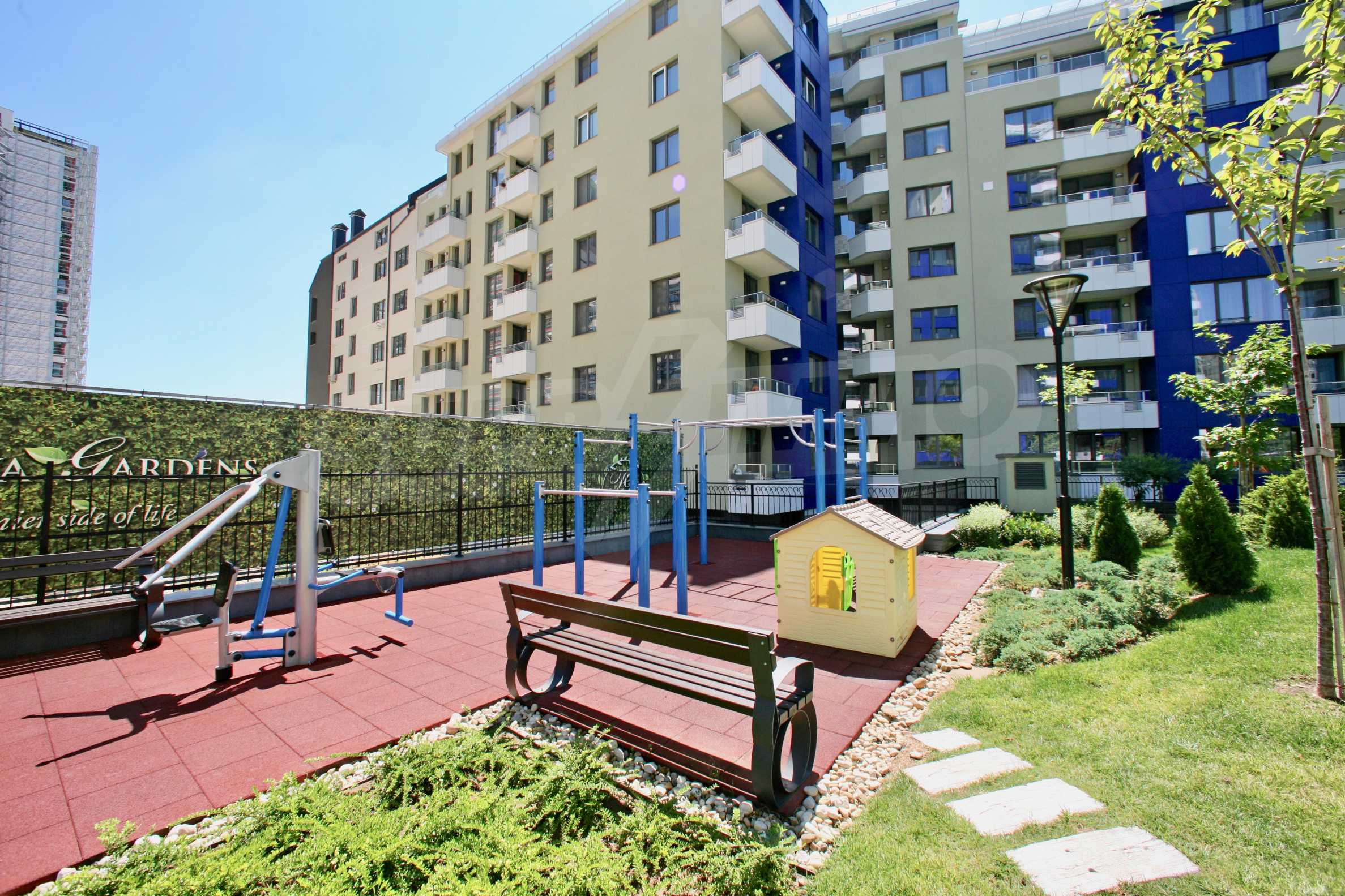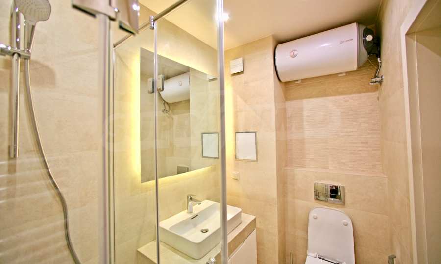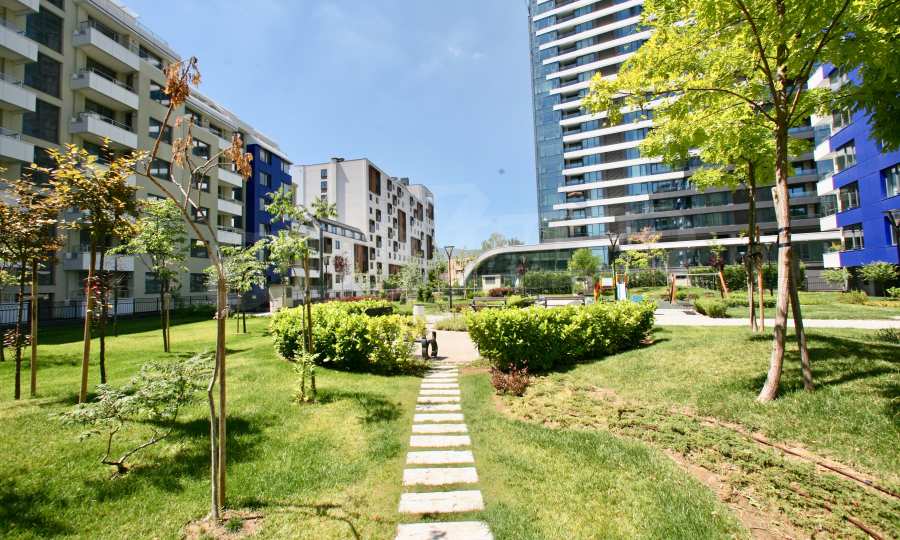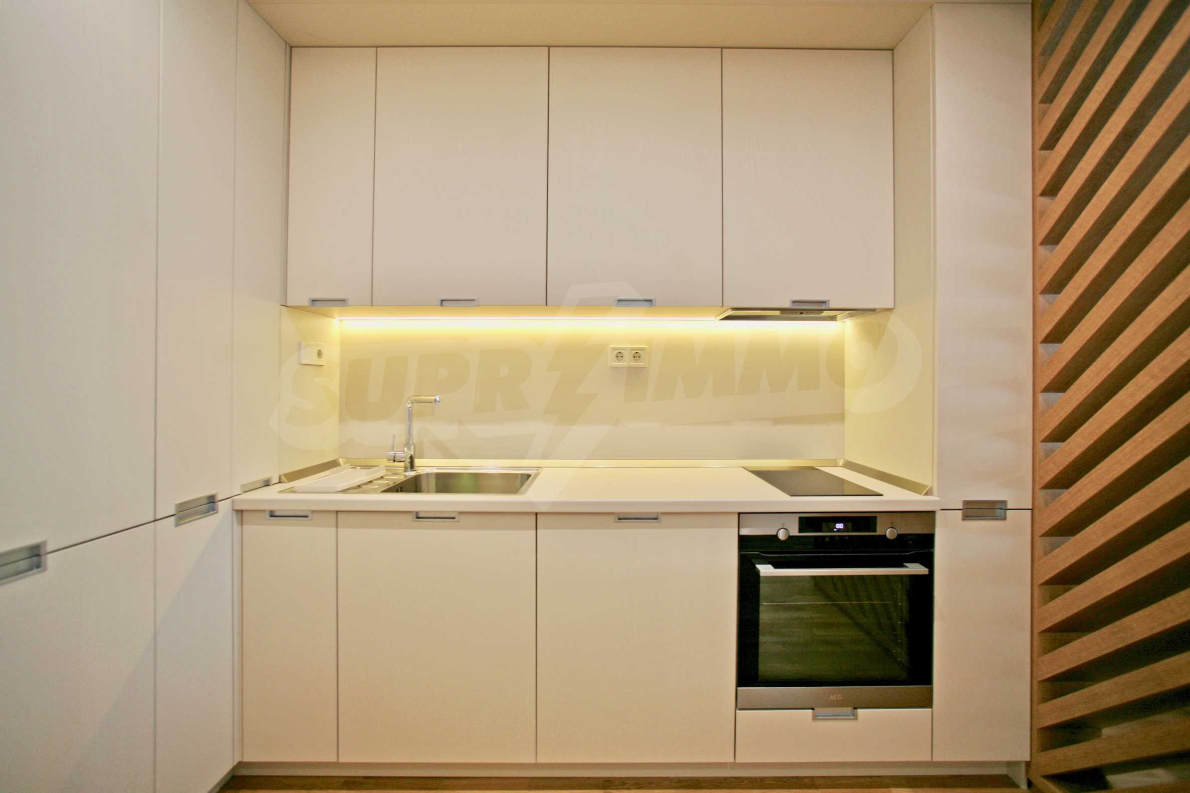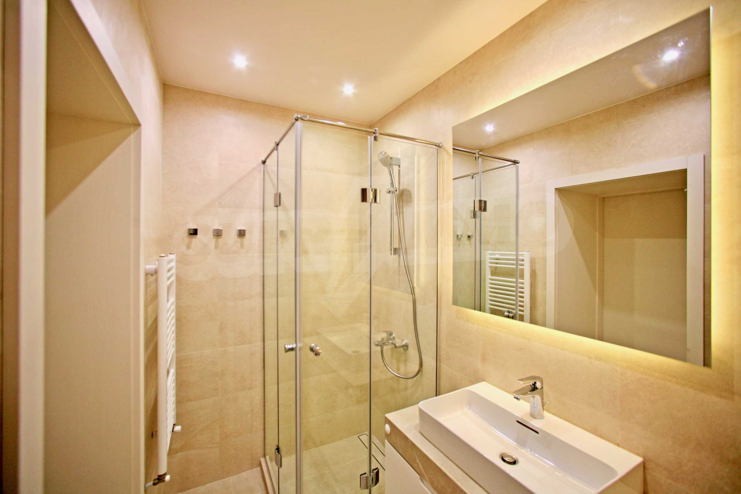 On an area of 114.62 m2. there are two bedrooms, a kitchen, a dining room, a living room, two bathrooms with toilets, two terraces (with northern and southern exposure) and a closet / closet. The kitchen is equipped with stove, hob, extractor, refrigerator and large dishwasher. The south-facing terrace has a great view of the city, Vitosha Mountain and the landscaped yard of the complex. According to the plan, the "Green Ring" bike lane will pass right in front of the entrance of the building. The apartment is on central heating, but there is an alternative with inverter air conditioners and electric water heater. The dining room with living room, open type, give the feeling of a spacious and spacious room, and the kitchen is separated by a beautiful wooden partition. The corridor has a large area and has many cabinets for storage. One of the bedrooms is furnished with a large double bed, and the other can be furnished at the choice of future tenants. The floor in the apartment is made of natural wood - oak. The rental price includes two garages with separate doors and a total area of 32.69 m2.