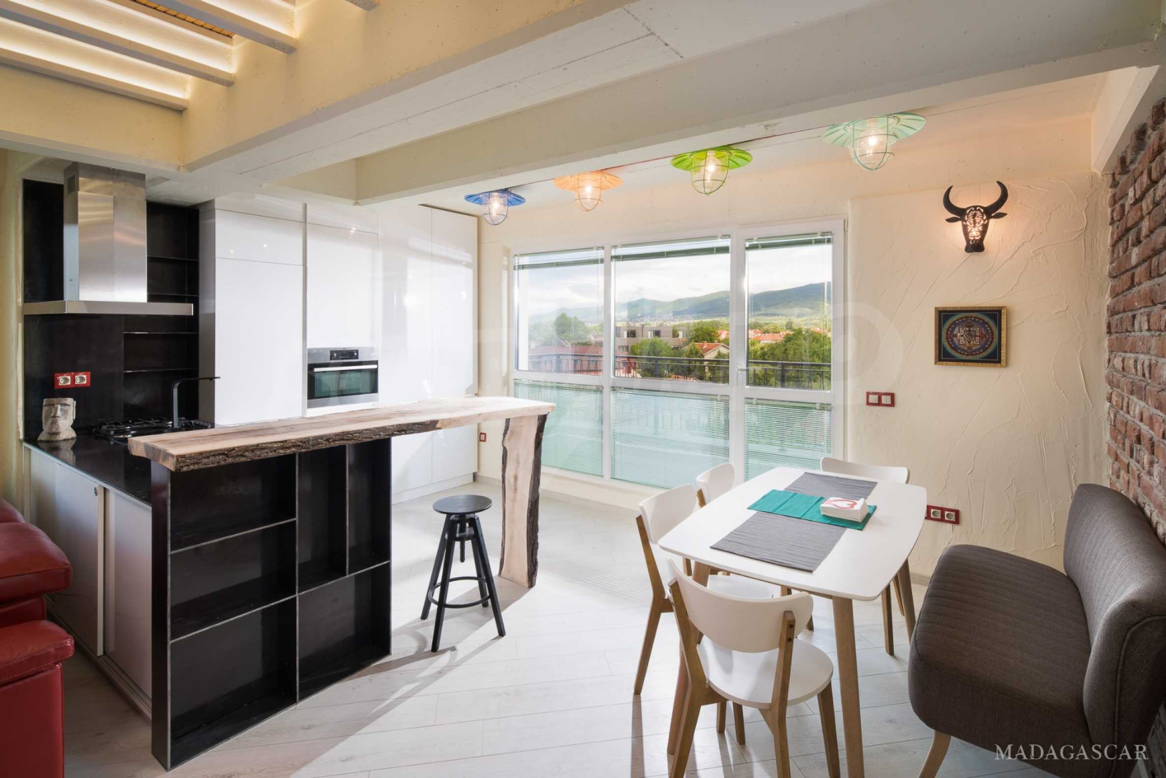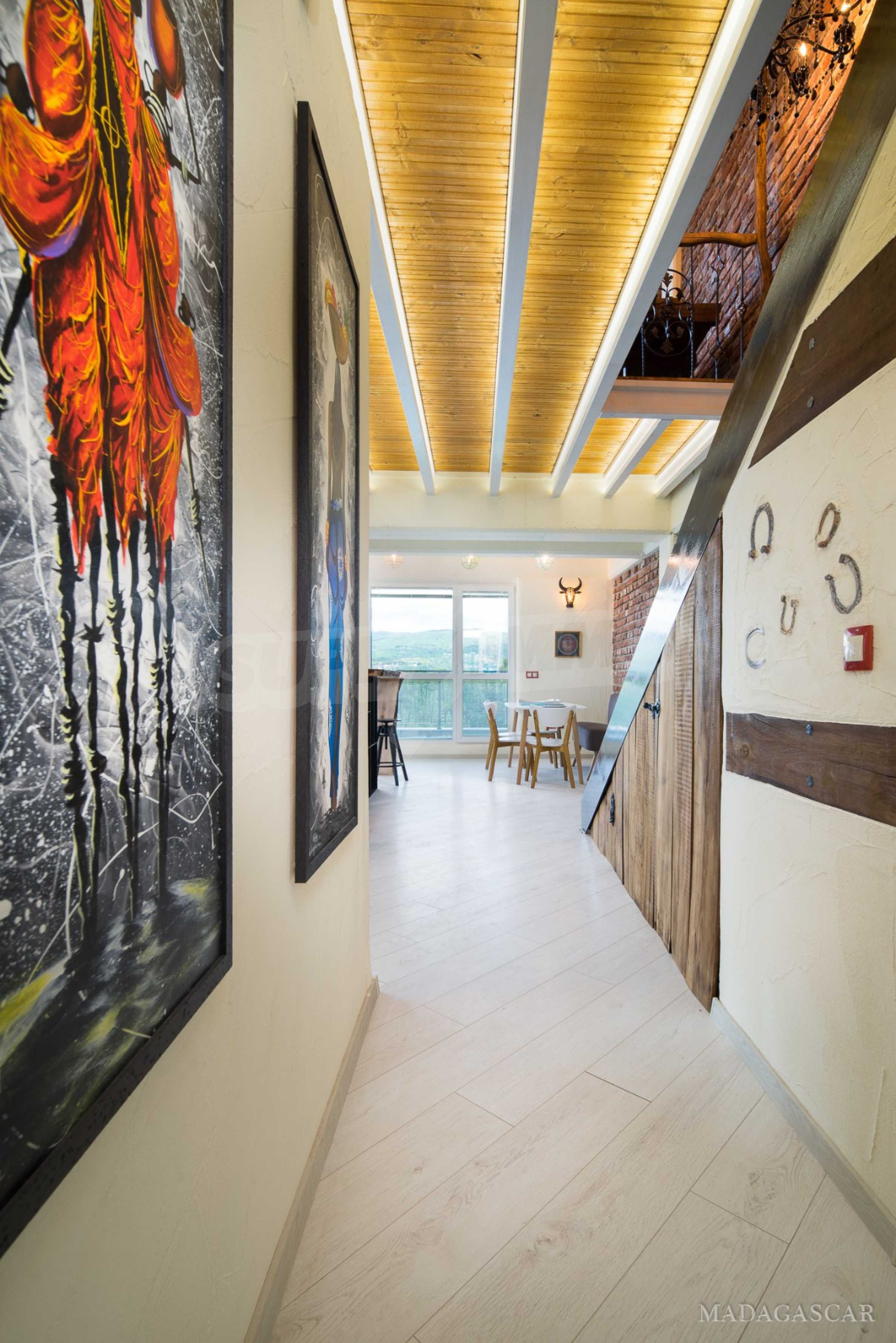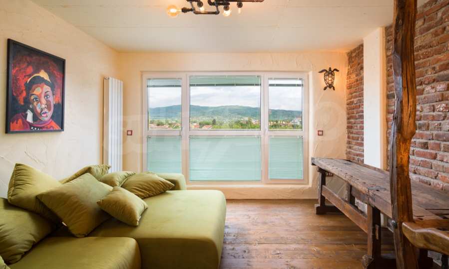 Art, bright, stylish, unique are just some of the things that can be said about this impressive apartment. The apartment is located on the fourth and fifth floor of a five-storey residential building. The exposure of the apartment is south / west / north / east, with beautiful panoramic views of the mountains and the city.