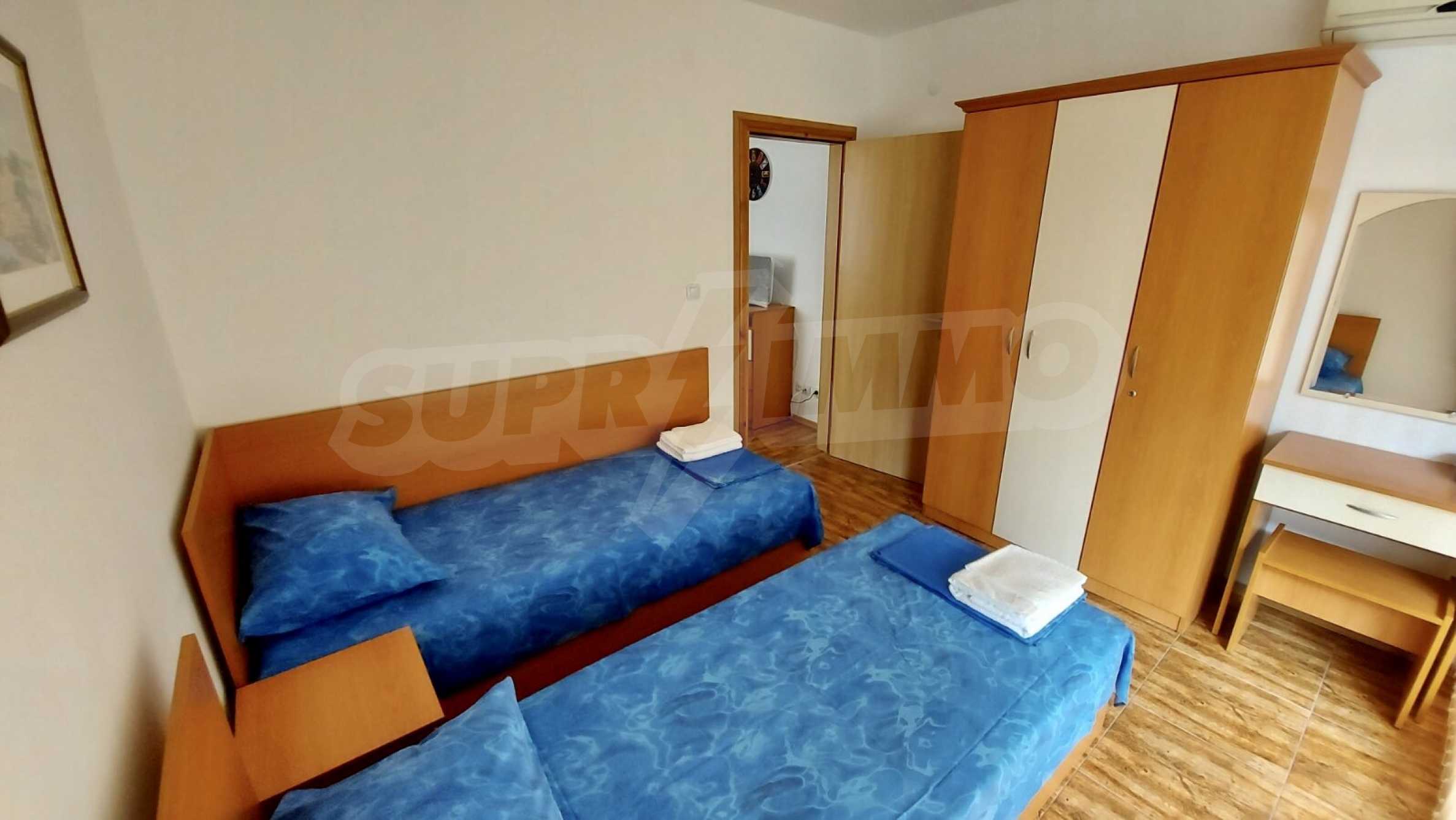 The apartment is for sale fully furnished: kitchen - fully equipped kitchenette, in the living room - double sofa bed, TV, bedroom - air conditioning, two beds, bathroom with shower and instantaneous water heater.