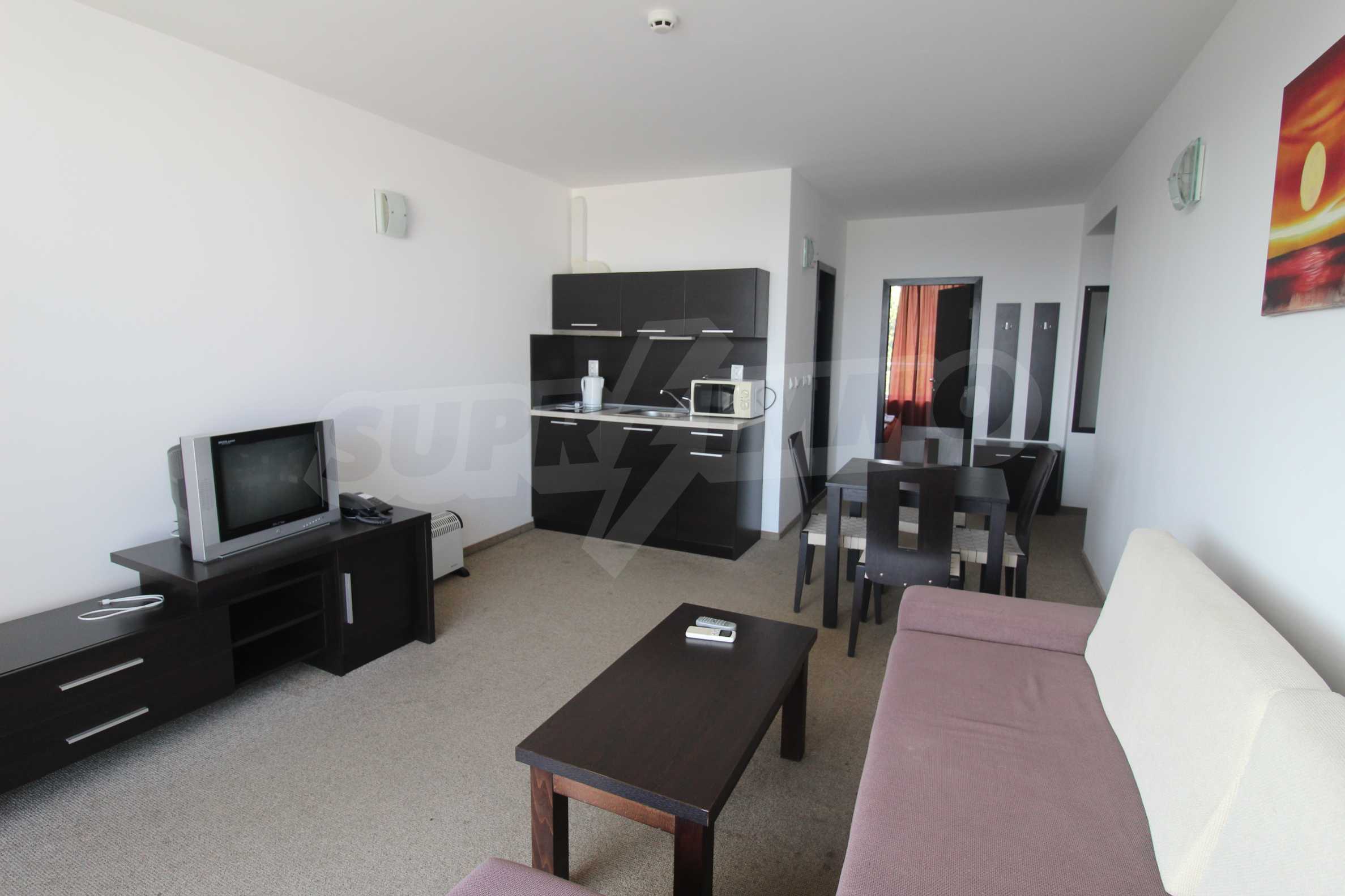 The apartment is located on the 4th floor (with elevator access) and consists of 2 bedrooms, one large room with kitchen-dining area and sofas, bathroom / WC. The apartment has a terrace overlooking the well-landscaped and maintained areas and one of the pools of the complex.