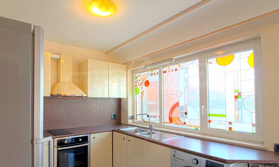The rooms are very bright, with a large chat of windows with beautiful abstract stained glass.