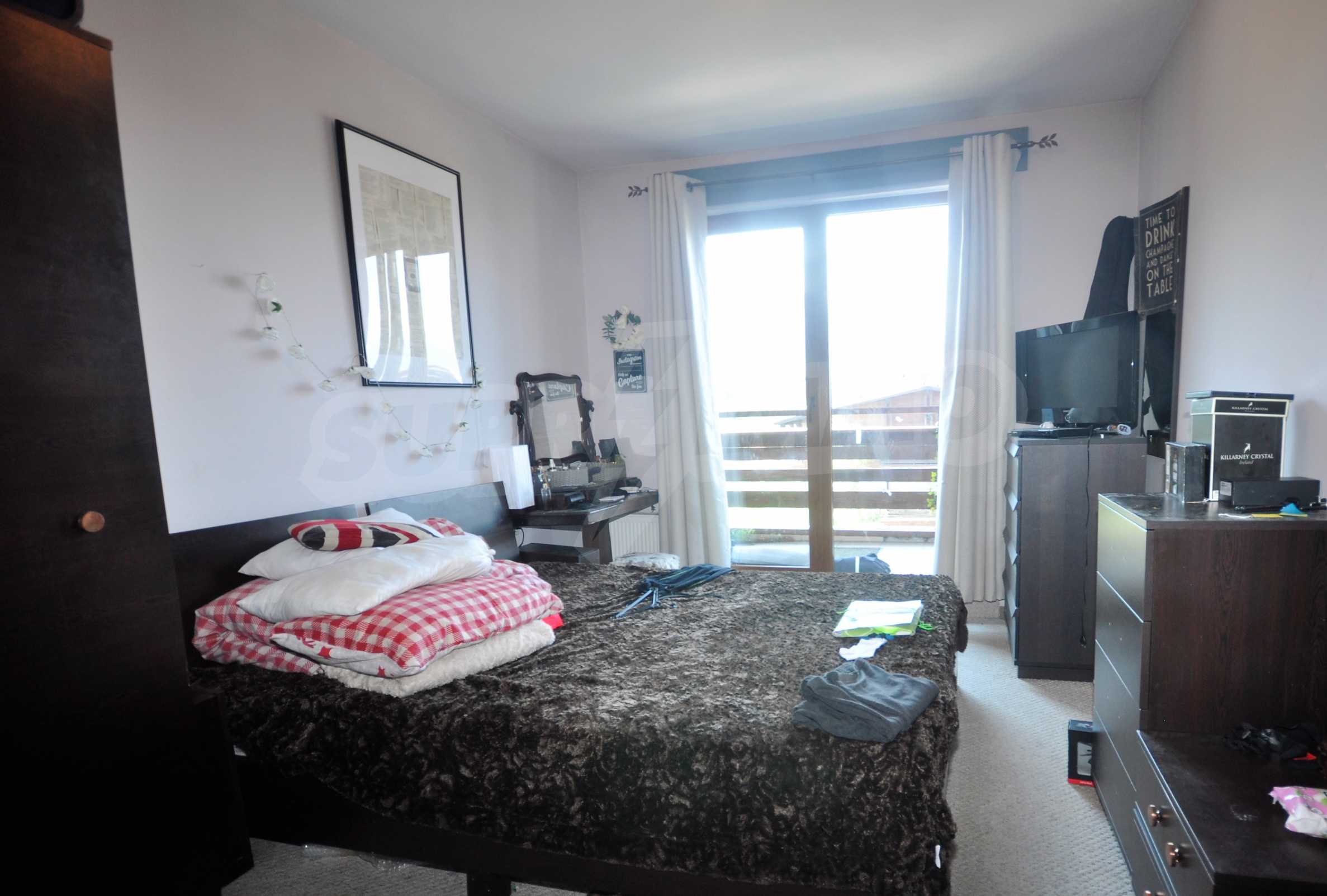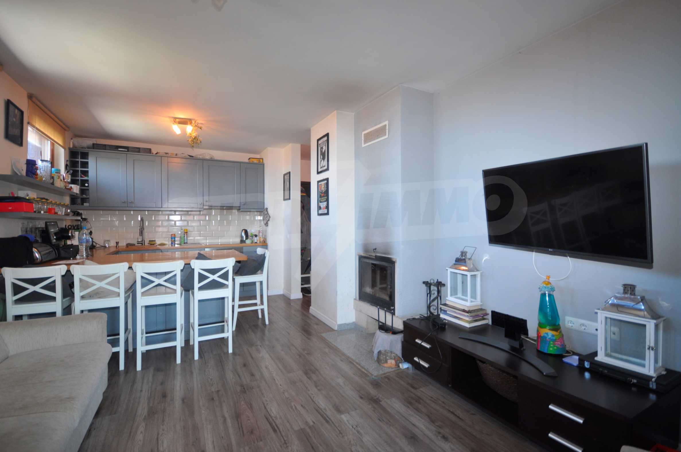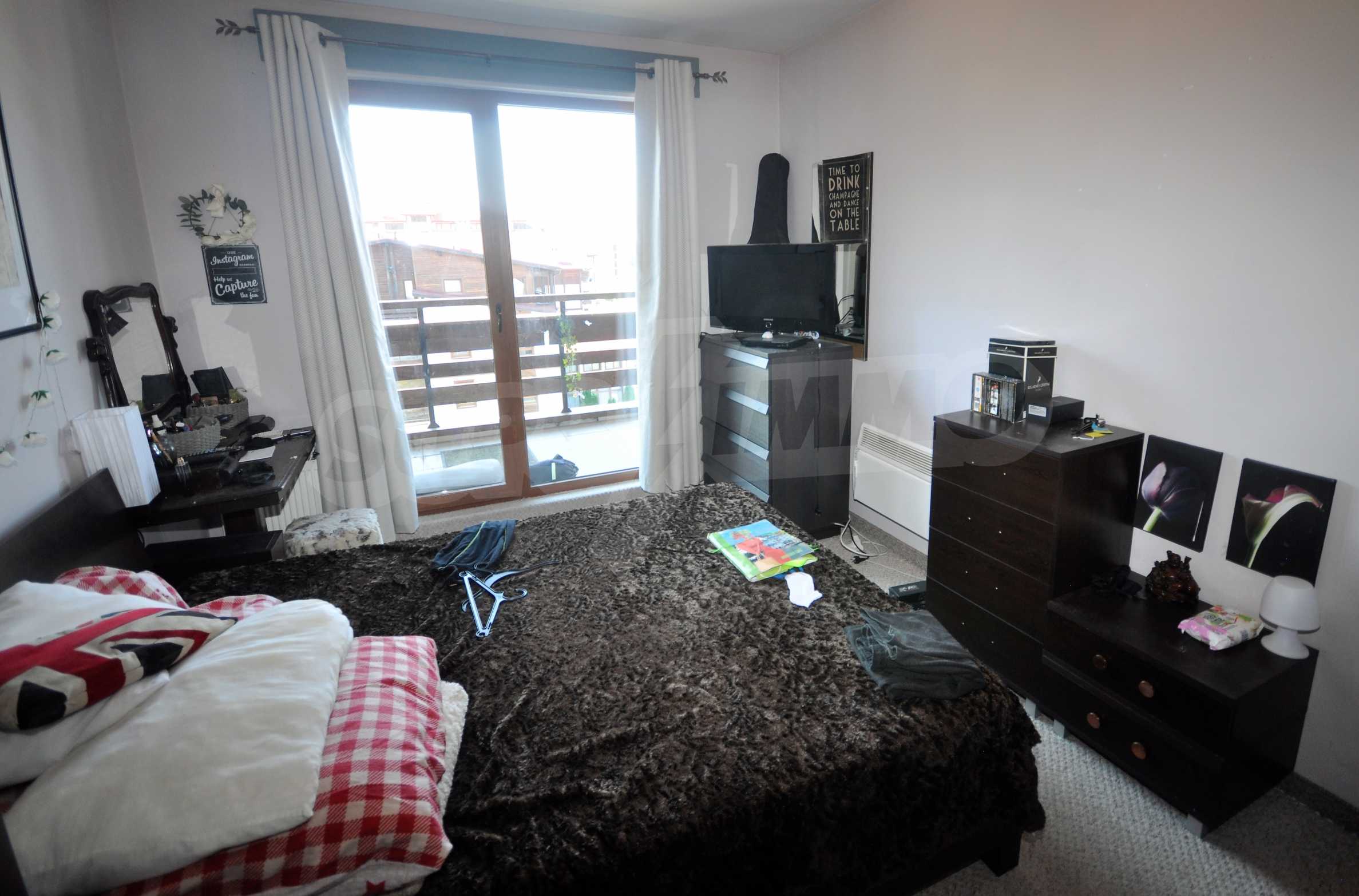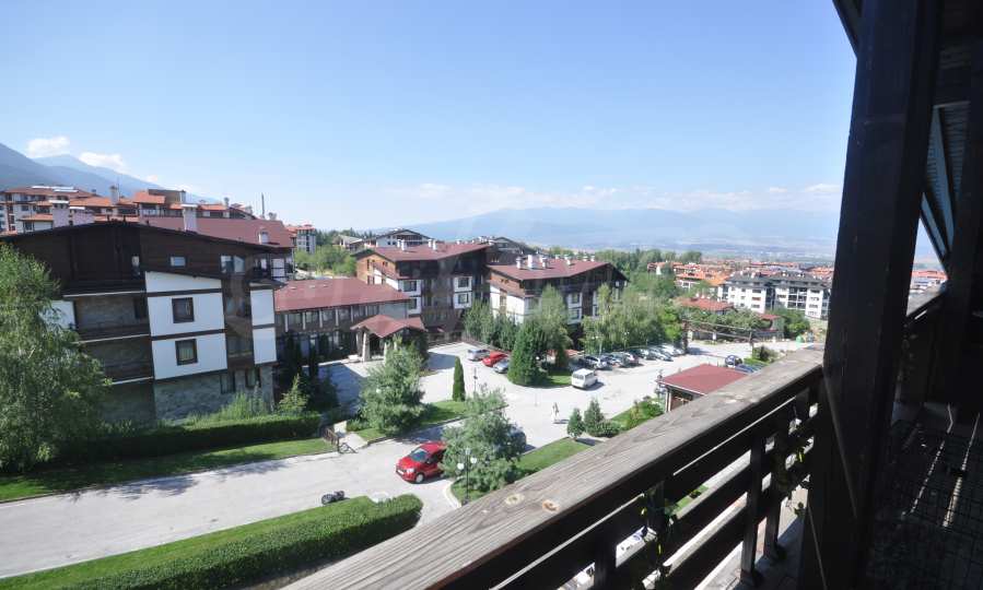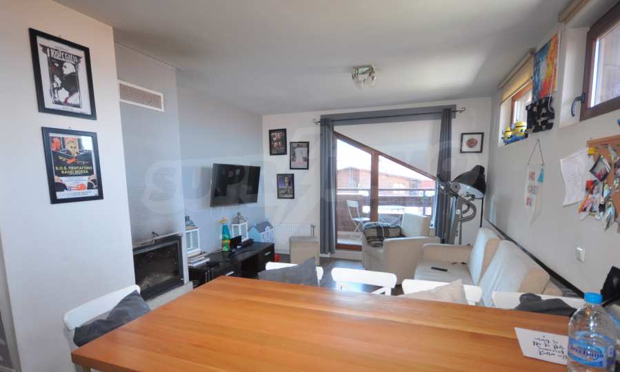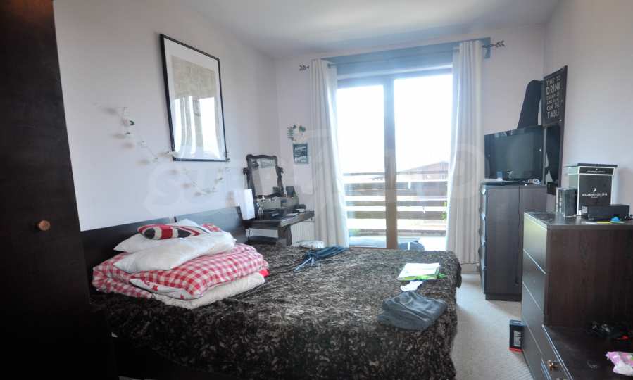 The apartment is facing southwest. It is located on the fifth floor with a total area of 95 m2. The property has a balcony overlooking the surroundings and the mountains, with wiring for telephone, cable TV, internet. The kitchen is furnished and equipped with an oven, a hob with four sockets, an extractor hood, a refrigerator, a sink, cabinets for inventory and utensils, a dining table with four chairs; living room with sofa, coffee table, TV and locker, fireplace; two bedrooms, bathroom with toilet - with shower, sink with mirror. The heating is local heating, fireplace and electric radiators / convectors; The building has a lift and a 24-hour reception.