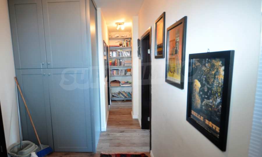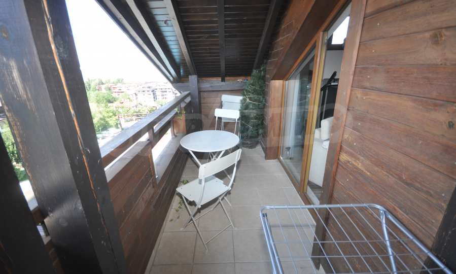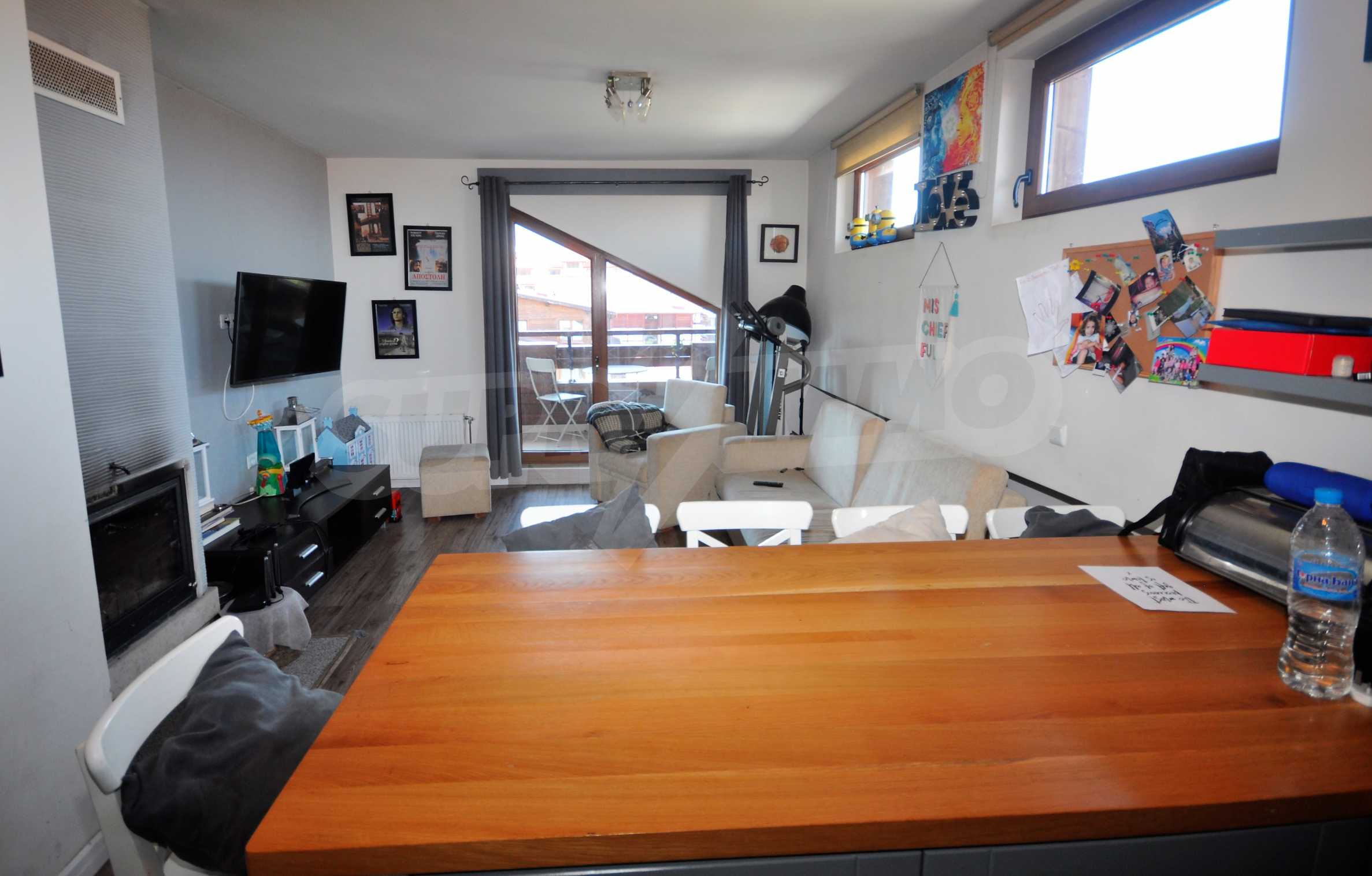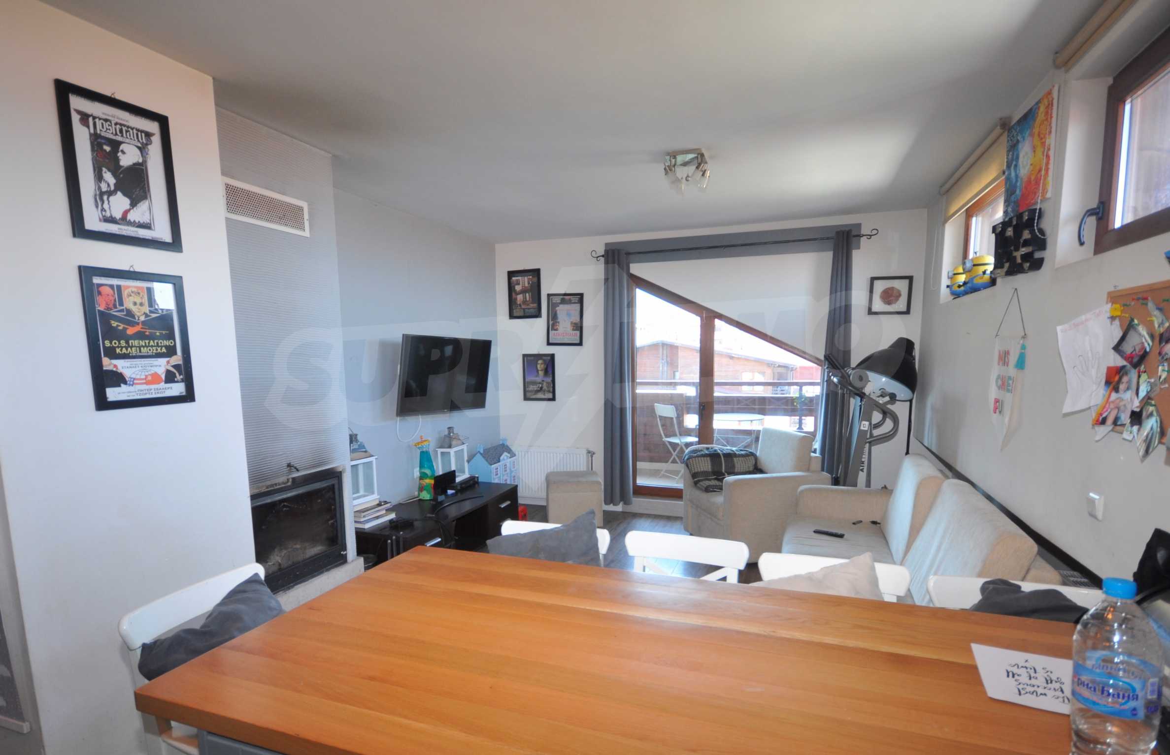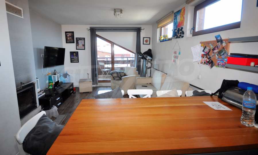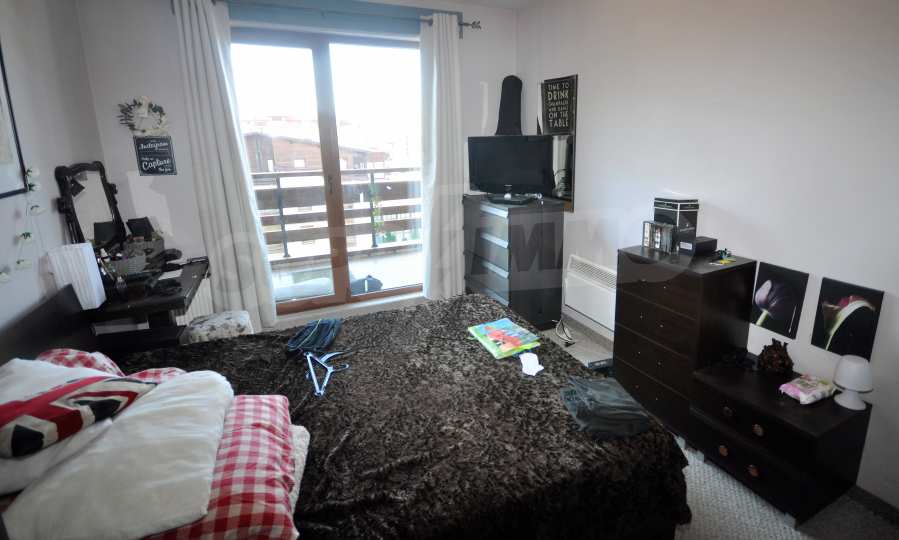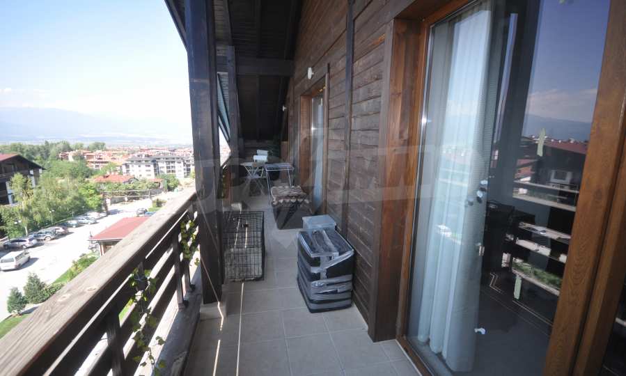 The apartment is facing southwest. It is located on the fifth floor with a total area of 95 m2. The property has a balcony overlooking the surroundings and the mountains, with wiring for telephone, cable TV, internet. The kitchen is furnished and equipped with an oven, a hob with four sockets, an extractor hood, a refrigerator, a sink, cabinets for inventory and utensils, a dining table with four chairs; living room with sofa, coffee table, TV and locker, fireplace; two bedrooms, bathroom with toilet - with shower, sink with mirror. The heating is local heating, fireplace and electric radiators / convectors; The building has a lift and a 24-hour reception.