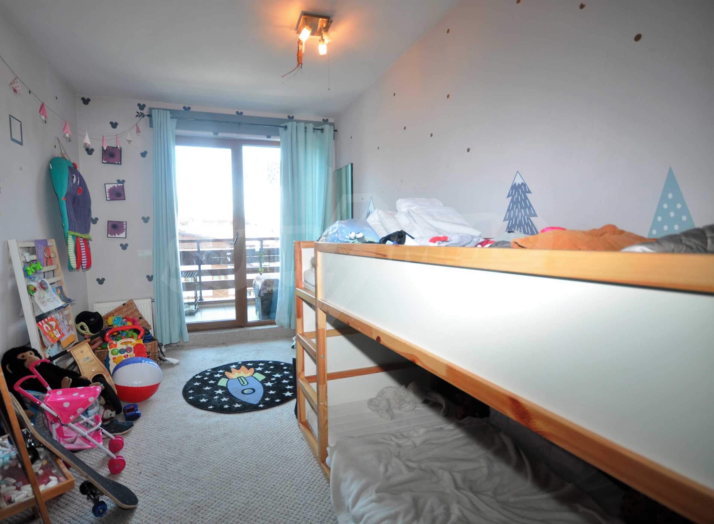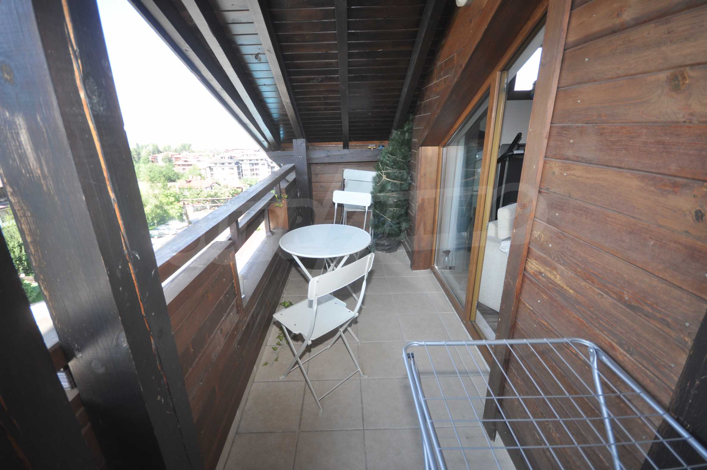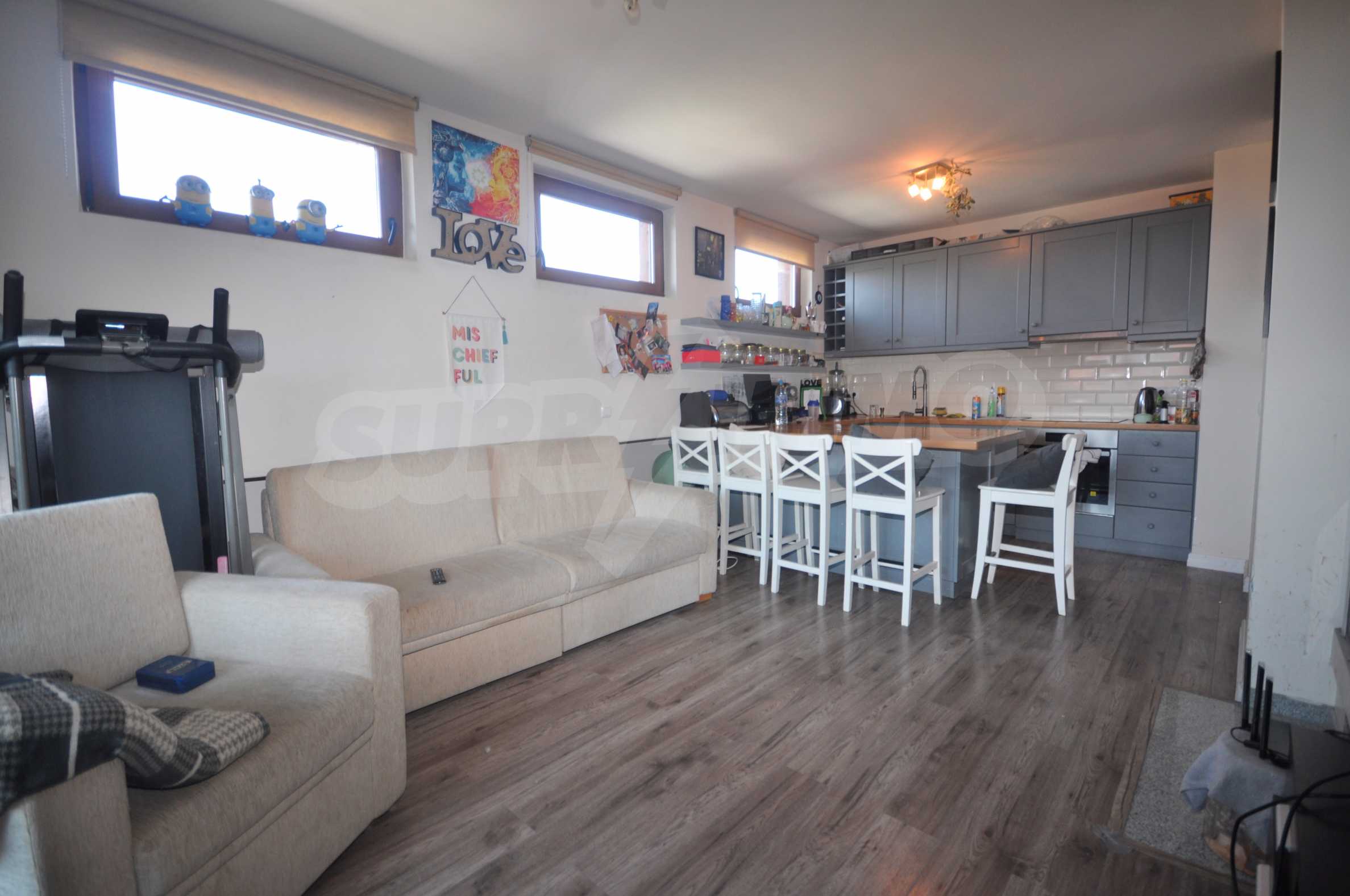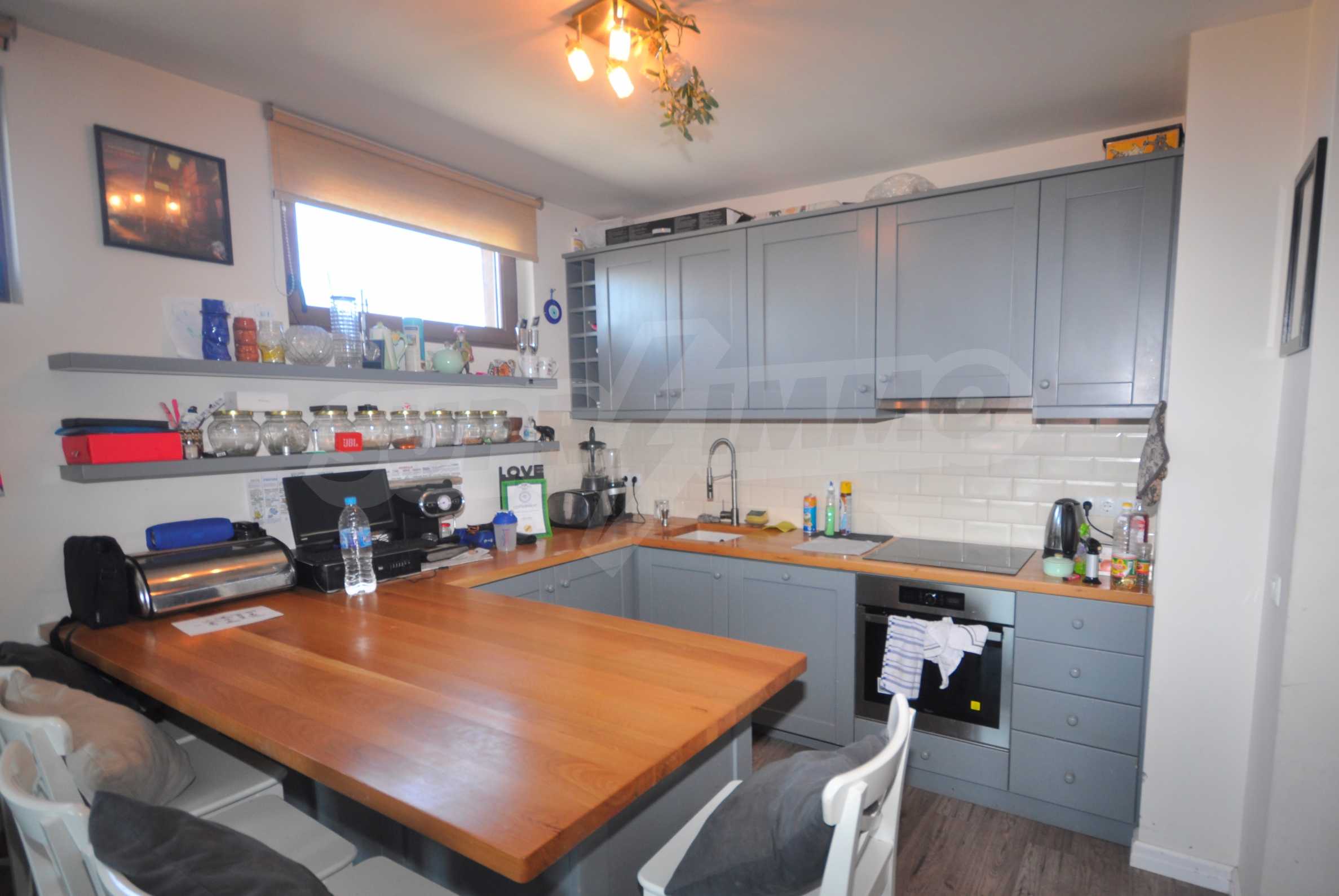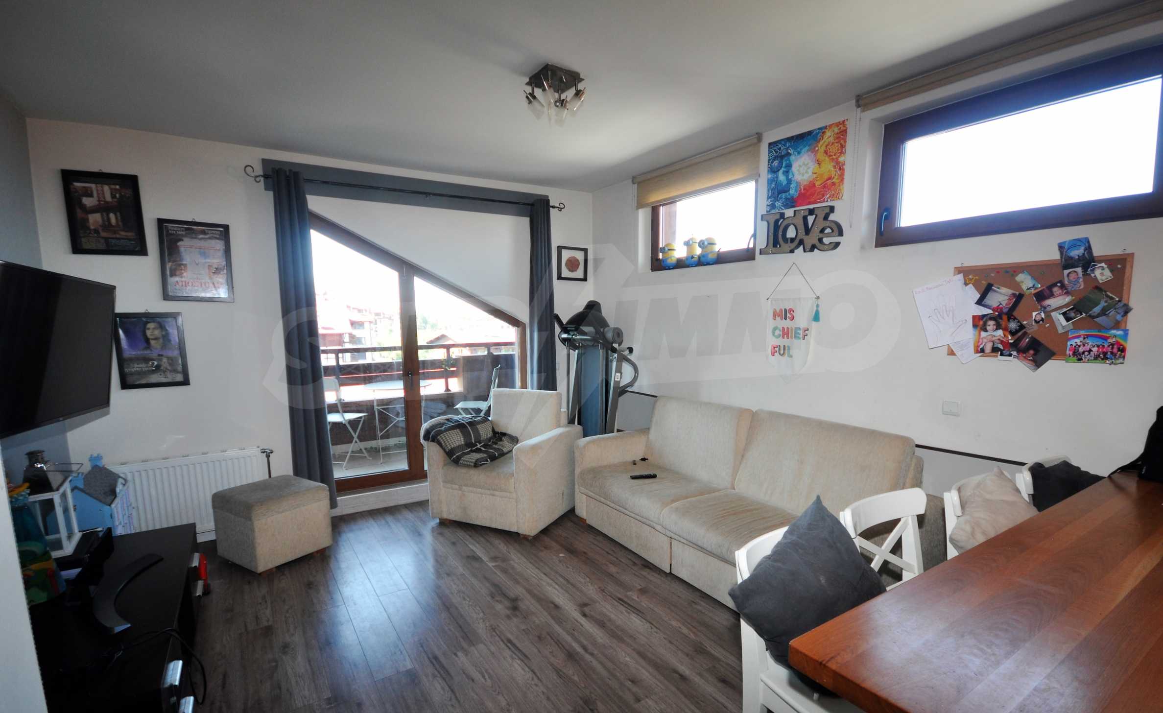 The apartment is facing southwest. It is located on the fifth floor with a total area of 95 m2. The property has a balcony overlooking the surroundings and the mountains, with wiring for telephone, cable TV, internet. The kitchen is furnished and equipped with an oven, a hob with four sockets, an extractor hood, a refrigerator, a sink, cabinets for inventory and utensils, a dining table with four chairs; living room with sofa, coffee table, TV and locker, fireplace; two bedrooms, bathroom with toilet - with shower, sink with mirror. The heating is local heating, fireplace and electric radiators / convectors; The building has a lift and a 24-hour reception.