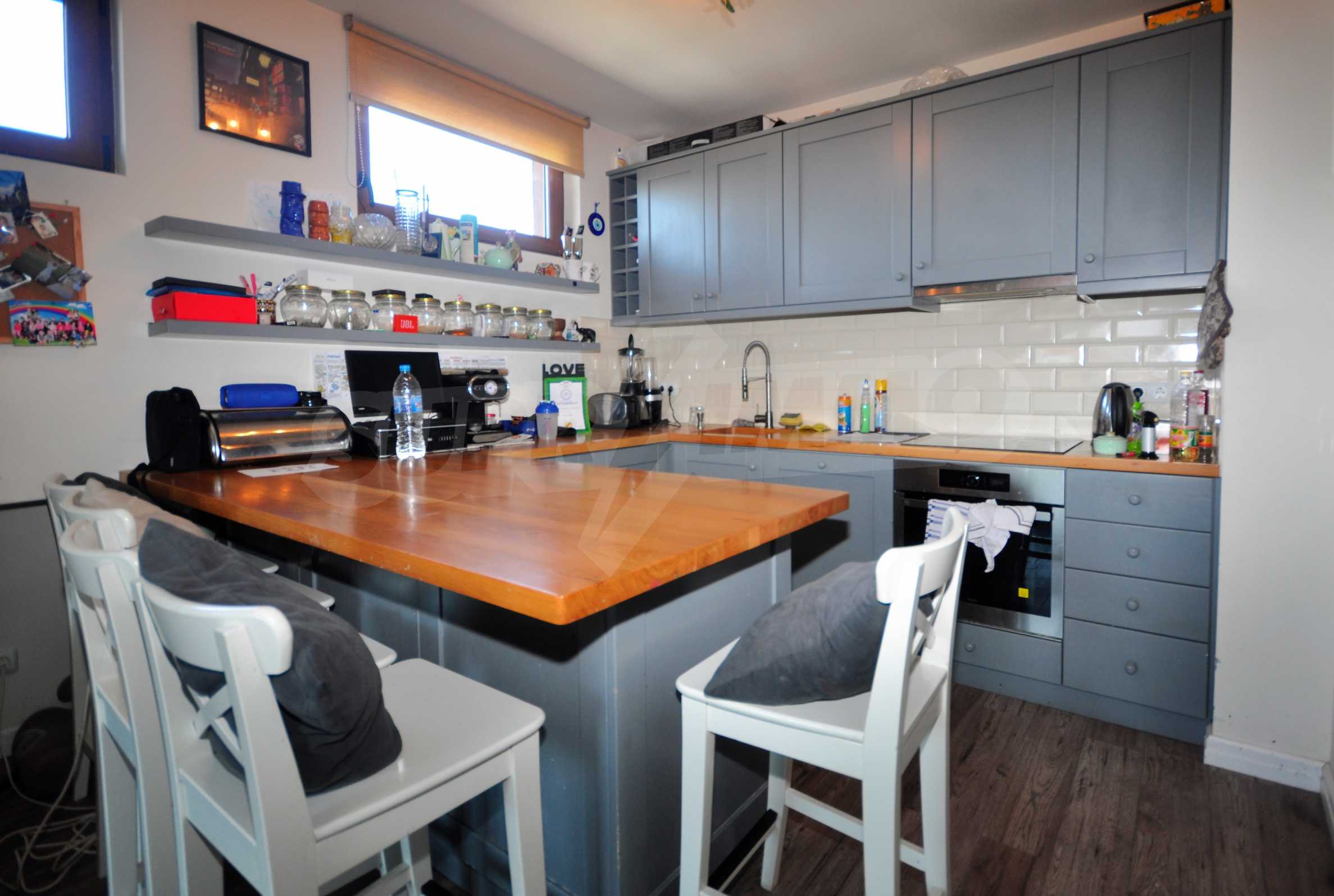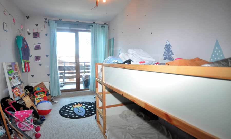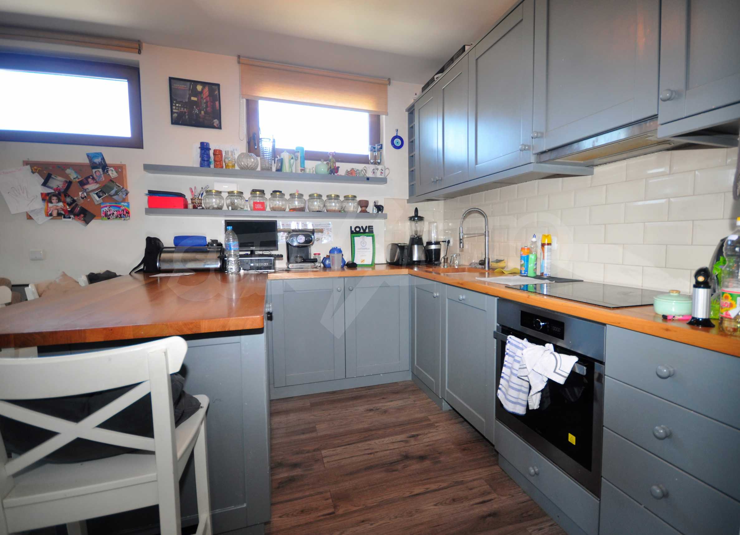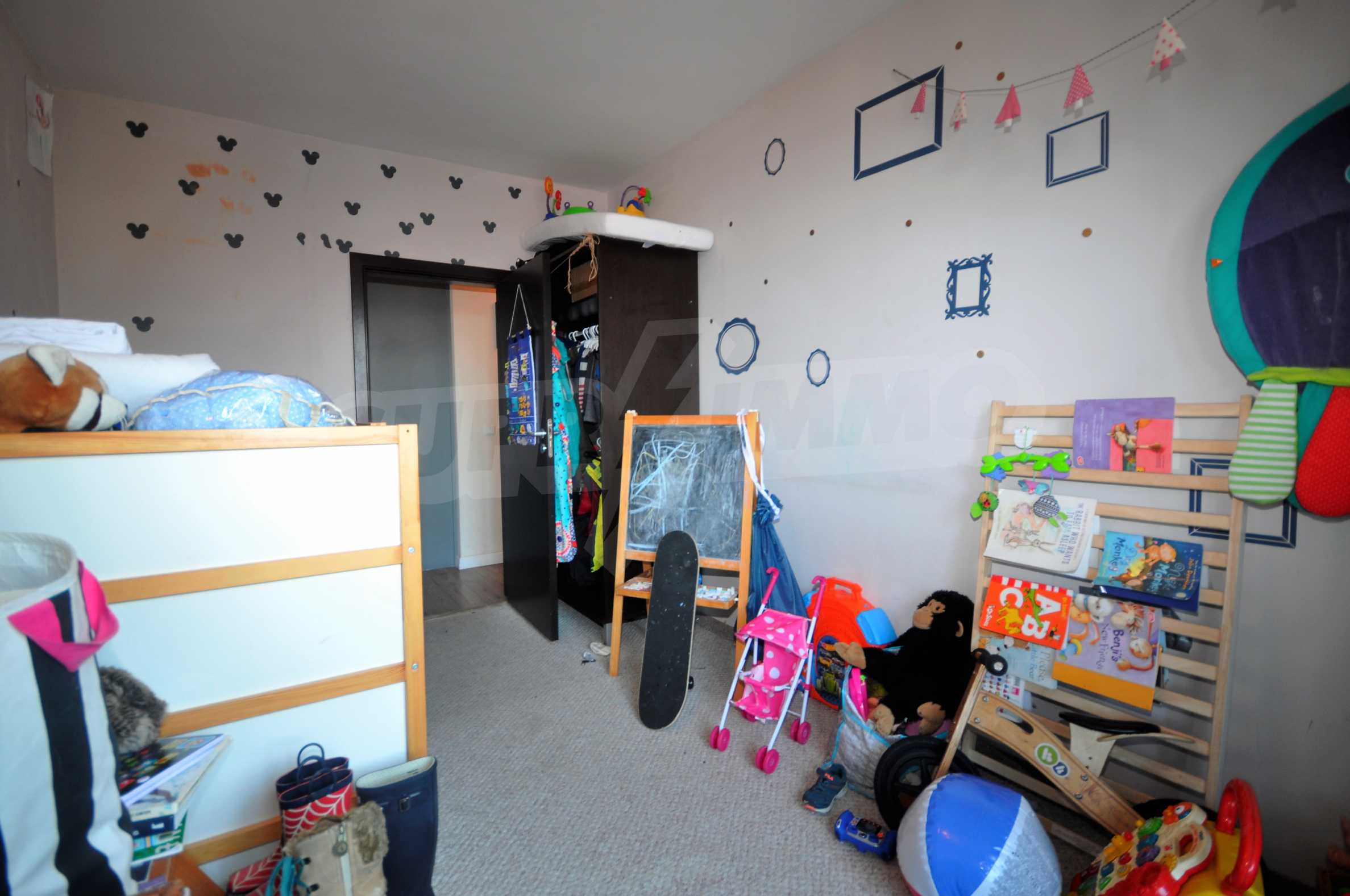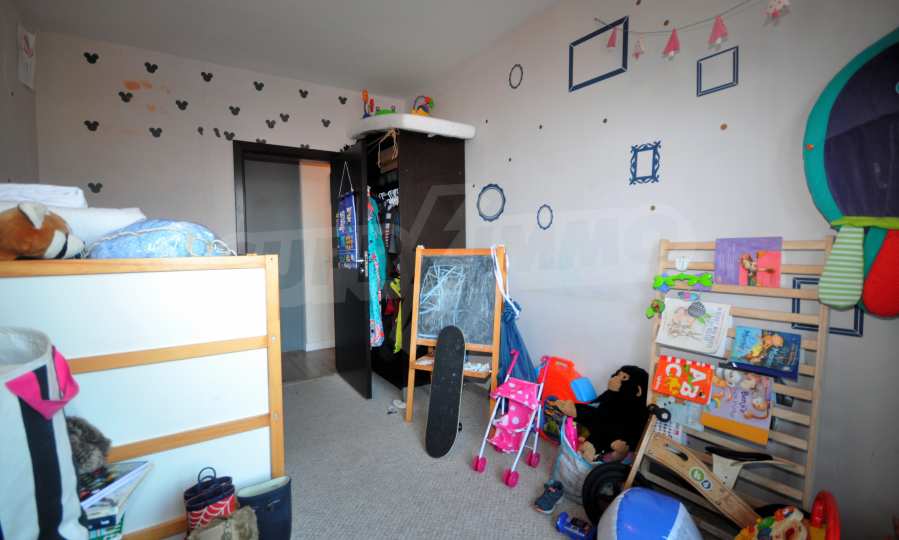 The apartment is facing southwest. It is located on the fifth floor with a total area of 95 m2. The property has a balcony overlooking the surroundings and the mountains, with wiring for telephone, cable TV, internet. The kitchen is furnished and equipped with an oven, a hob with four sockets, an extractor hood, a refrigerator, a sink, cabinets for inventory and utensils, a dining table with four chairs; living room with sofa, coffee table, TV and locker, fireplace; two bedrooms, bathroom with toilet - with shower, sink with mirror. The heating is local heating, fireplace and electric radiators / convectors; The building has a lift and a 24-hour reception.