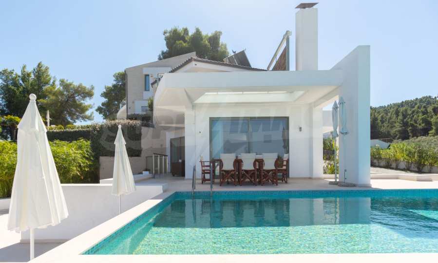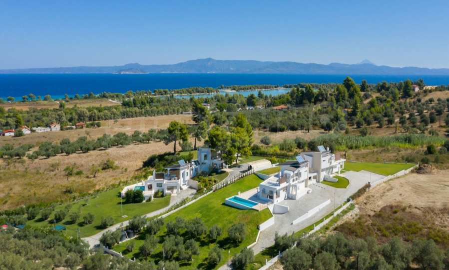 Newly - built complex of 4 luxurious villas in Kassandra, Halkidiki, with a wonderful view of the Toronaios bay. The complex is consisted of 4 living rooms connected with the dining rooms with a kitchen, 19 bedrooms, 14 bathrooms, 4 wc and 4 storage rooms. The plot is 8 acres and each villa has a private pool and three parking spaces. It is perfect for professional exploitation.