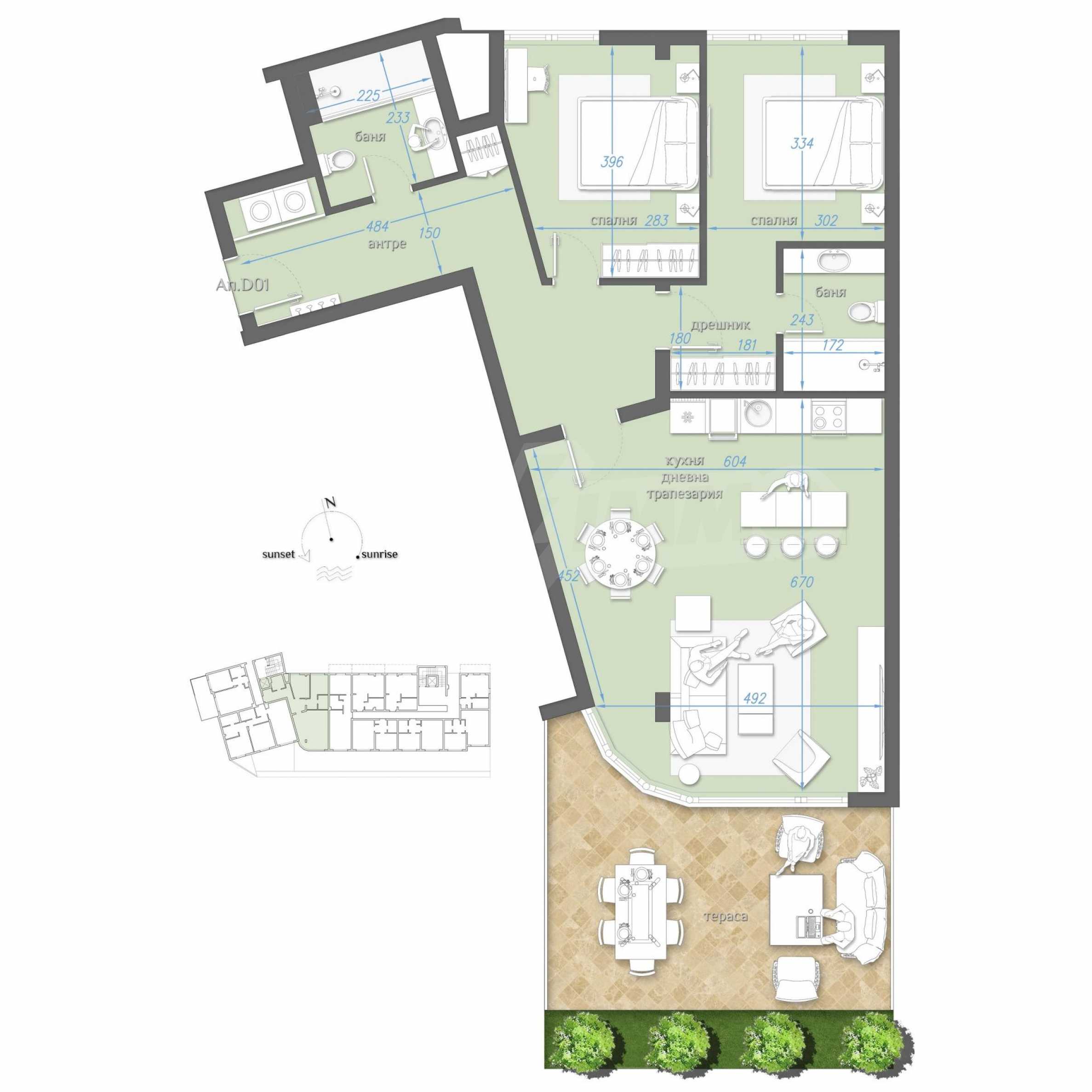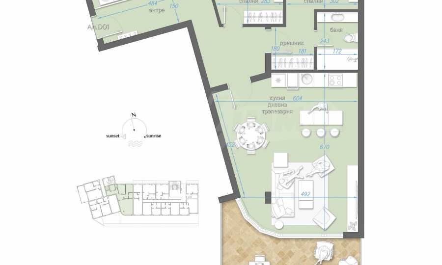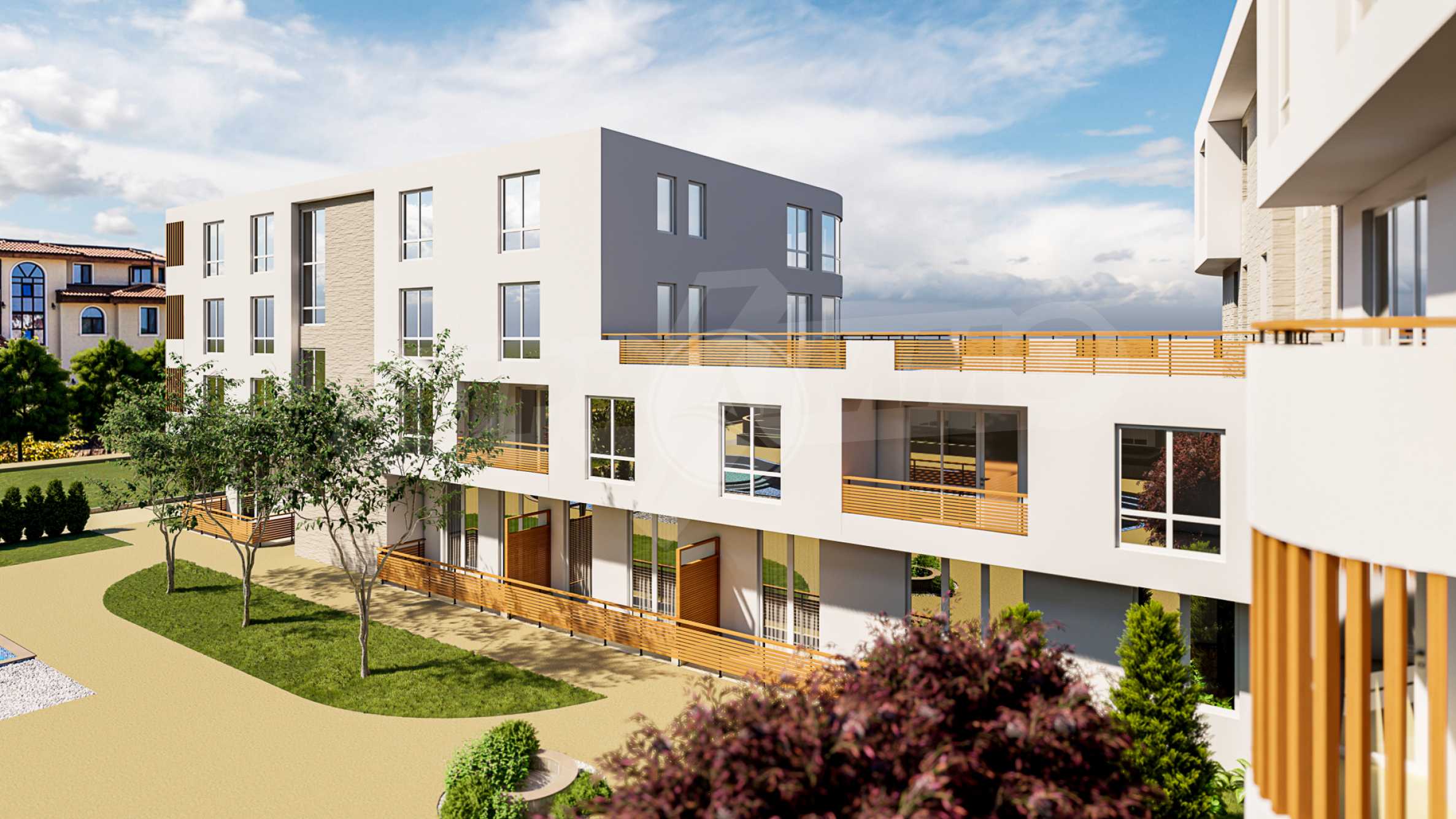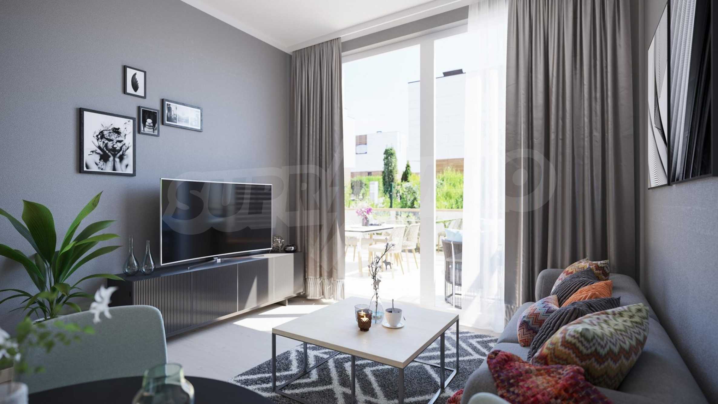 The concept of the complex in which this two-bedroom property is located is "the home of dreams, where coziness meets comfort in order to create the unique atmosphere of the Mediterranean". The idea of the architectural solution of the complex is inspired by the Mediterranean style - a composition of white tones and natural materials - stone and wood. Professionals call it a model of modern Mediterranean style.
