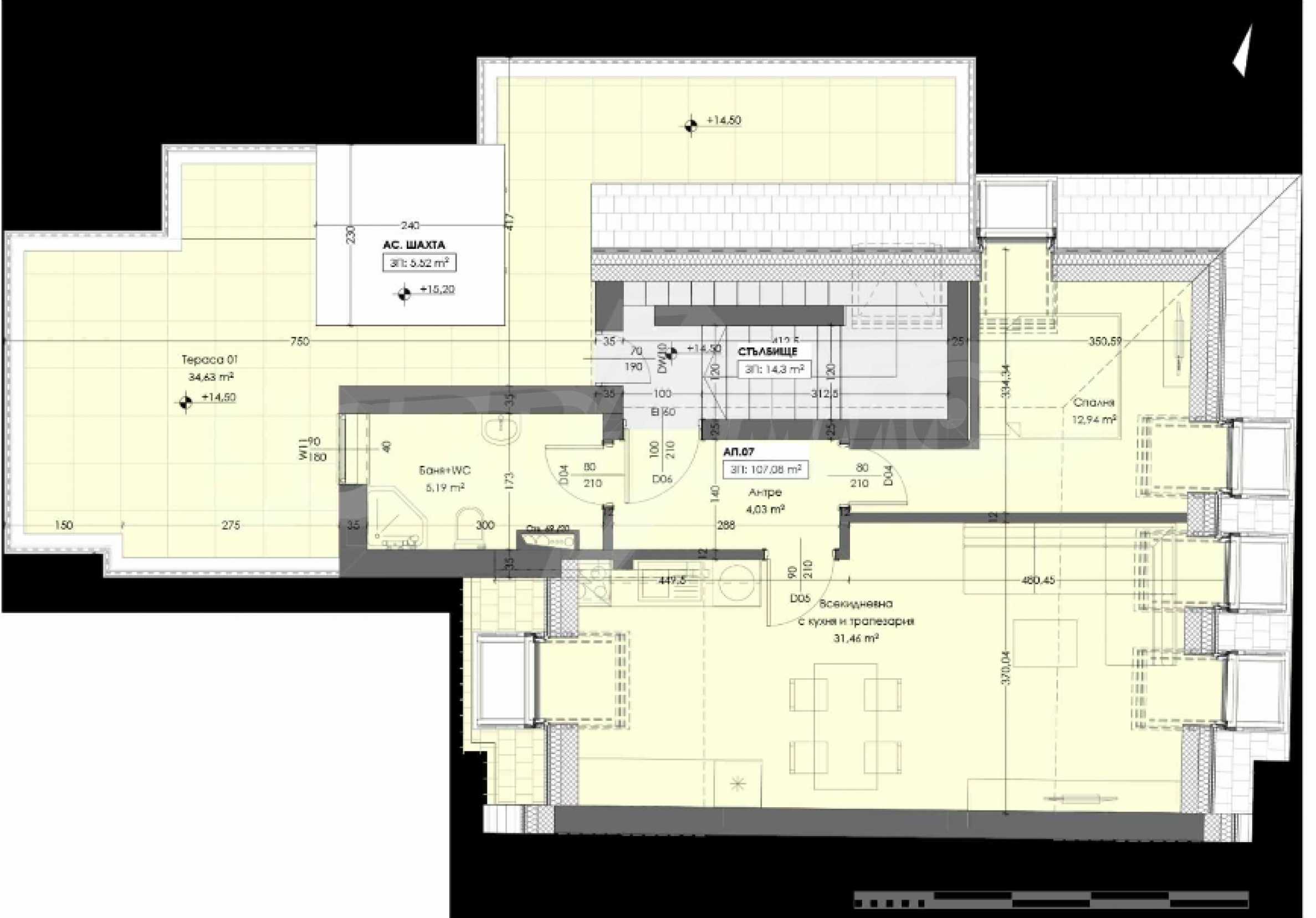 Distribution: 1 bedroom, living room with open-plan kitchen, bathroom with toilet, terrace (34.63 m2), total size 116.86 m2. (net area 107.08 m2. + common parts 9.78 m2.)