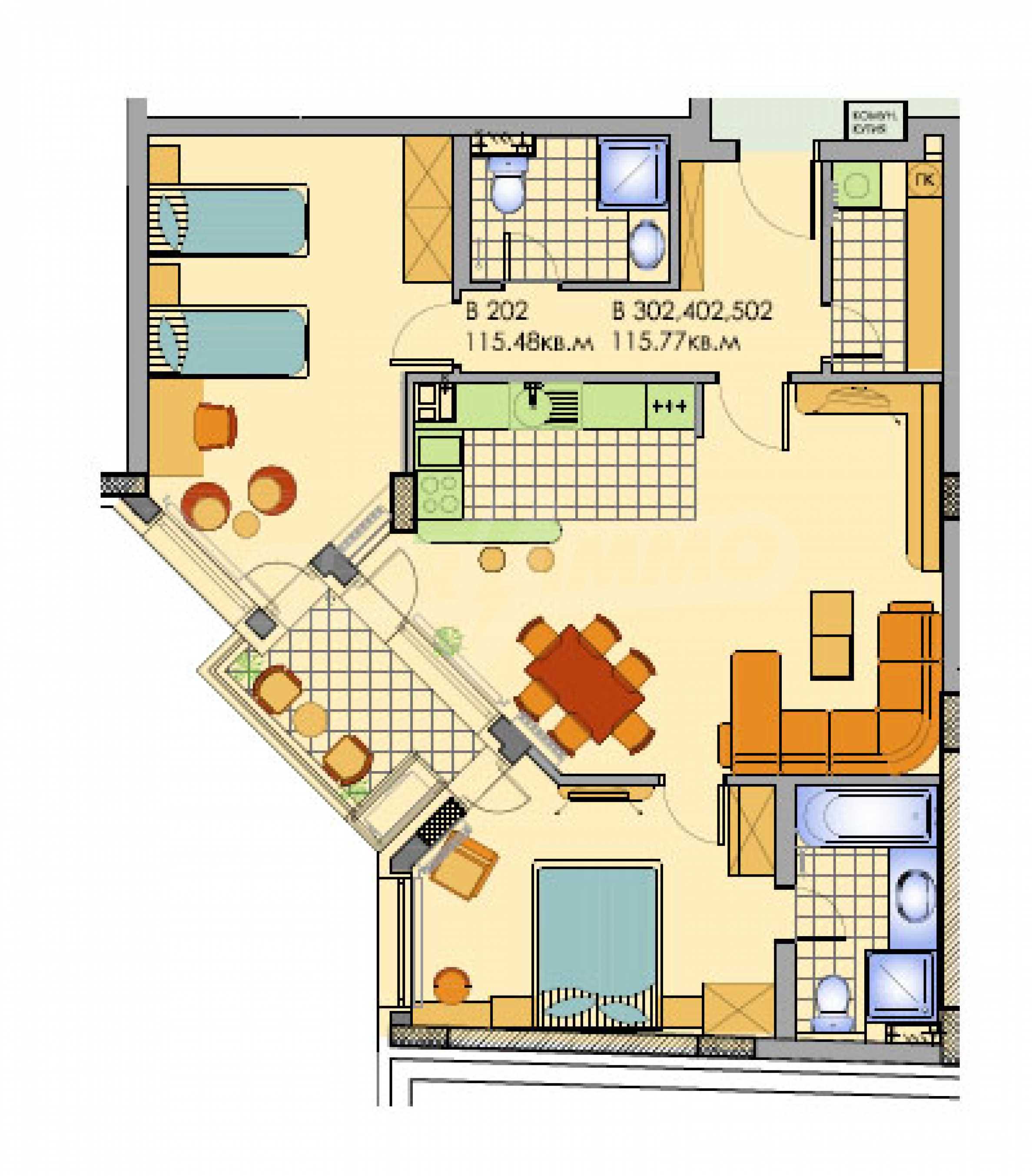 The two-bedroom apartment is located on the 2nd floor and has a total area of 115.48 m2 (net area: 101.44 m2 + ideal parts: 14.14 m2).