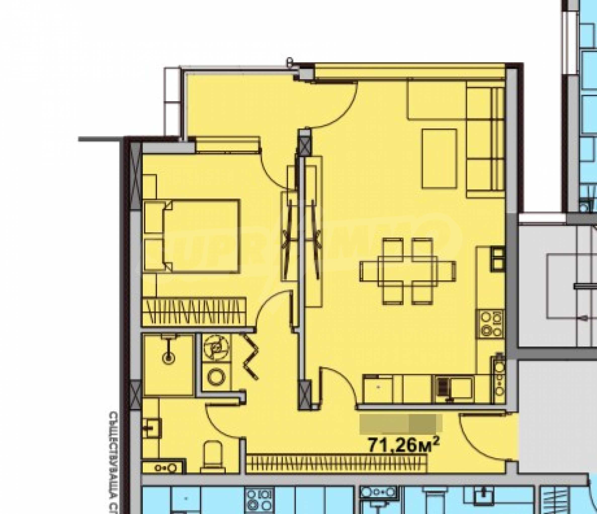 The apartment is rented finished according to the Bulgarian Standard (plastered walls and floors with screed, joinery, communication outlets).
