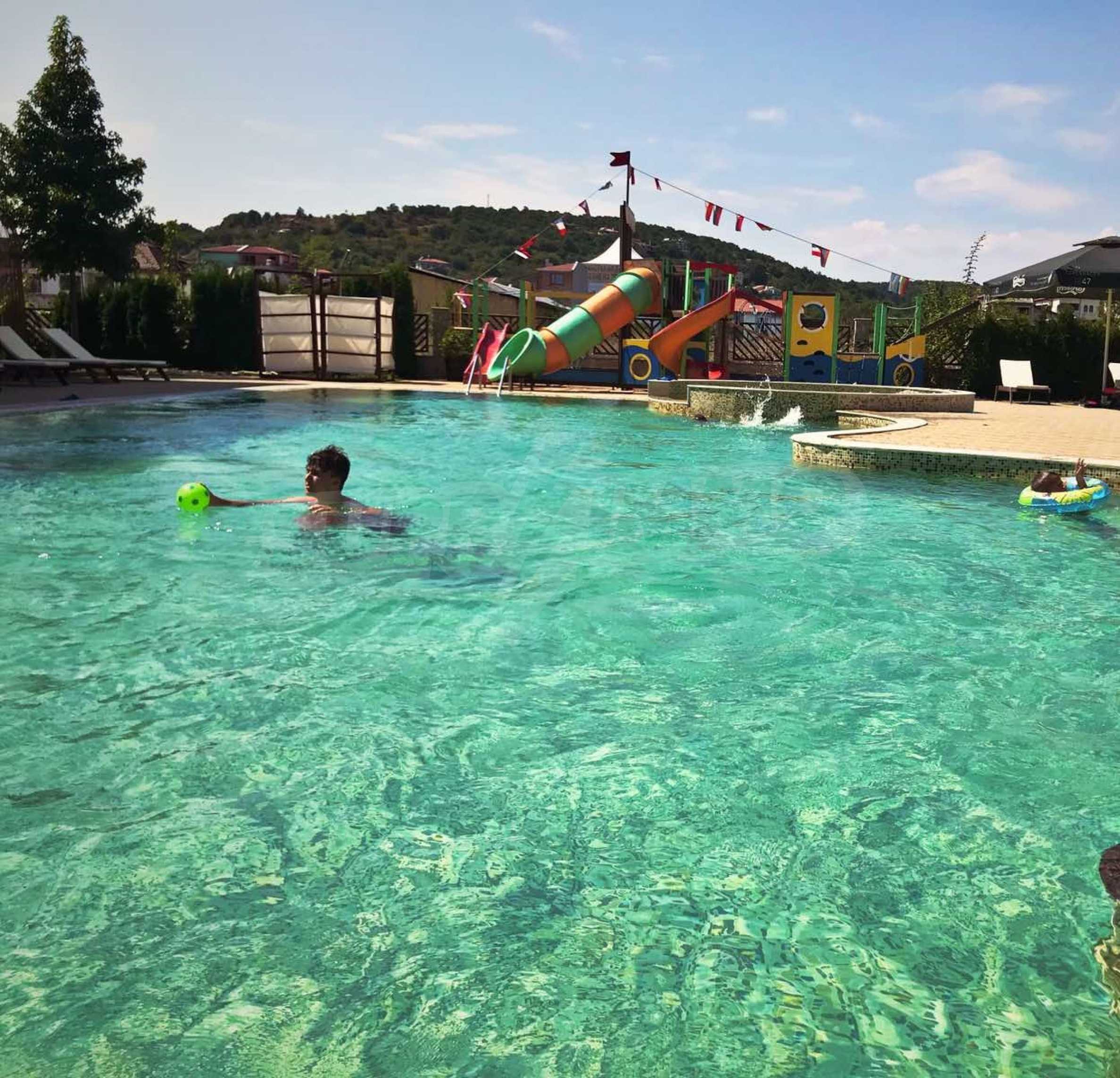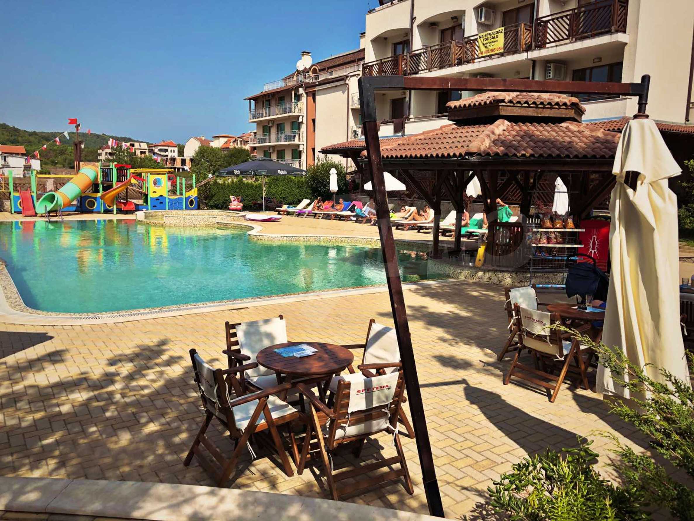 The complex has parking, swimming pool, jacuzzi, outdoor bar, restaurant and shops, spa with Turkish bath, massage and fitness. The Main Bus Station is 150 meters away, and Primorsko Aquapark is a 5-minute walk away.