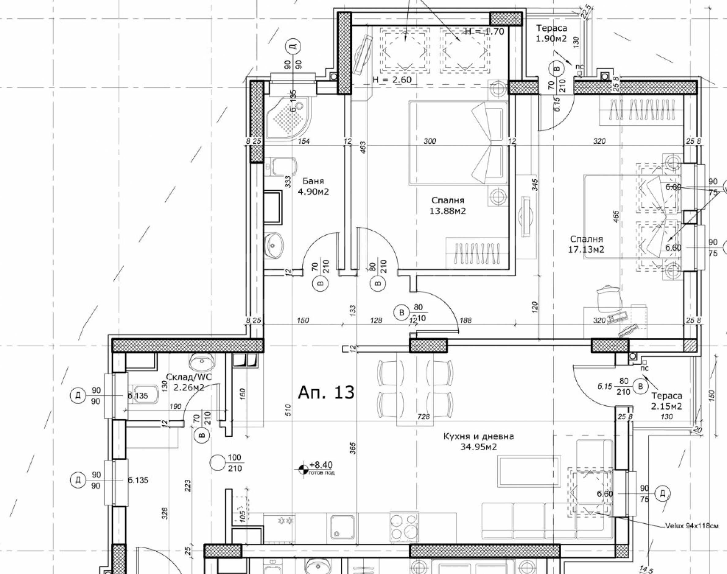 The two-bedroom apartment is located on the 4th floor and has a total area of 111.79 m2. (net area 95.12 m2. + common parts 16.67 m2.).