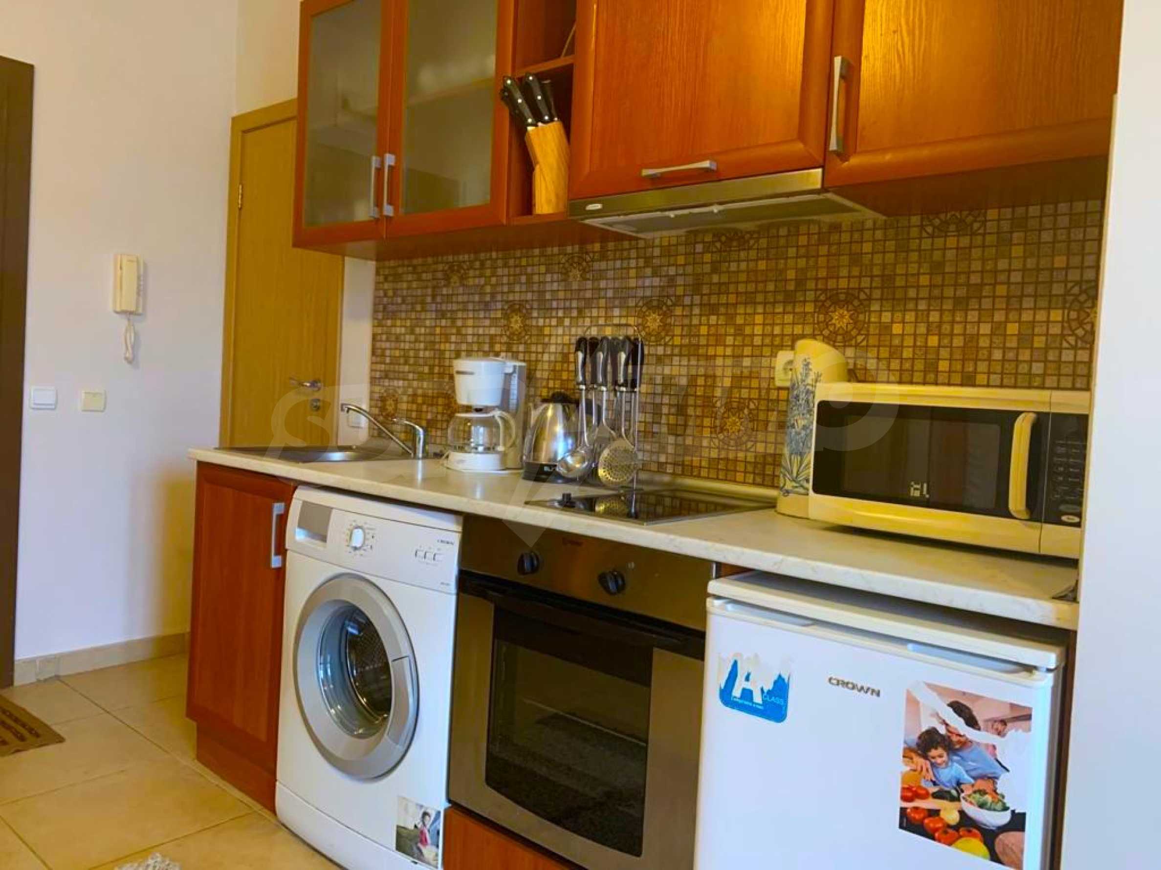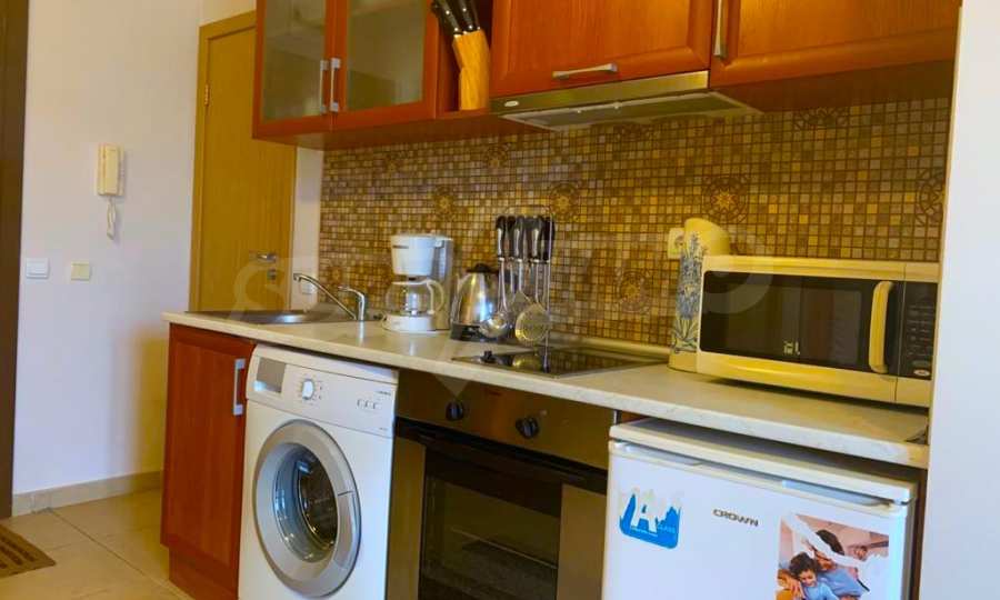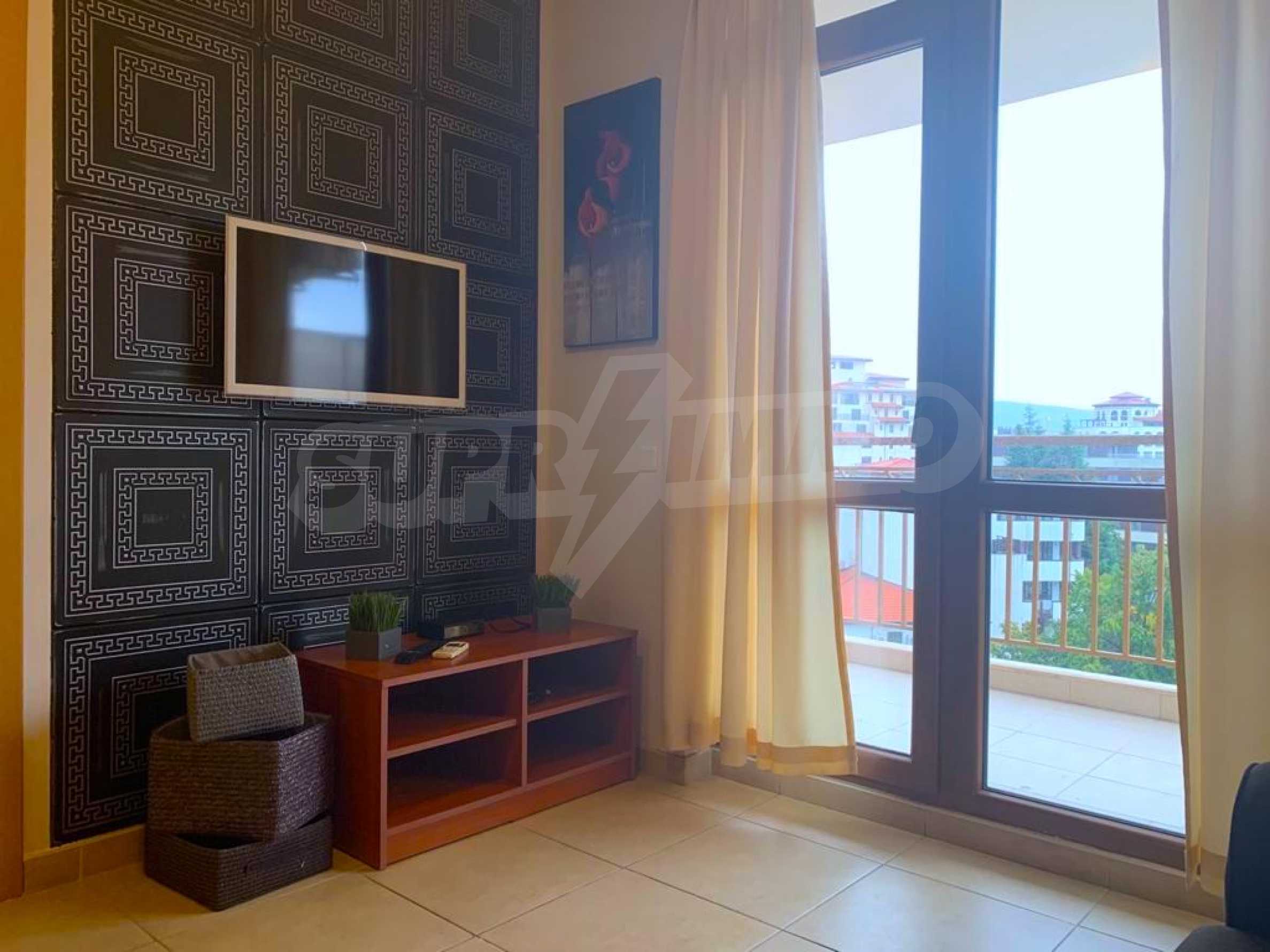 The property is located on the 5th floor and consists of 2 bathrooms, living room with kitchenette, large terrace overlooking the complex and the hills. The apartment is furnished and fully equipped with appliances, ideal for rent and year-round use.