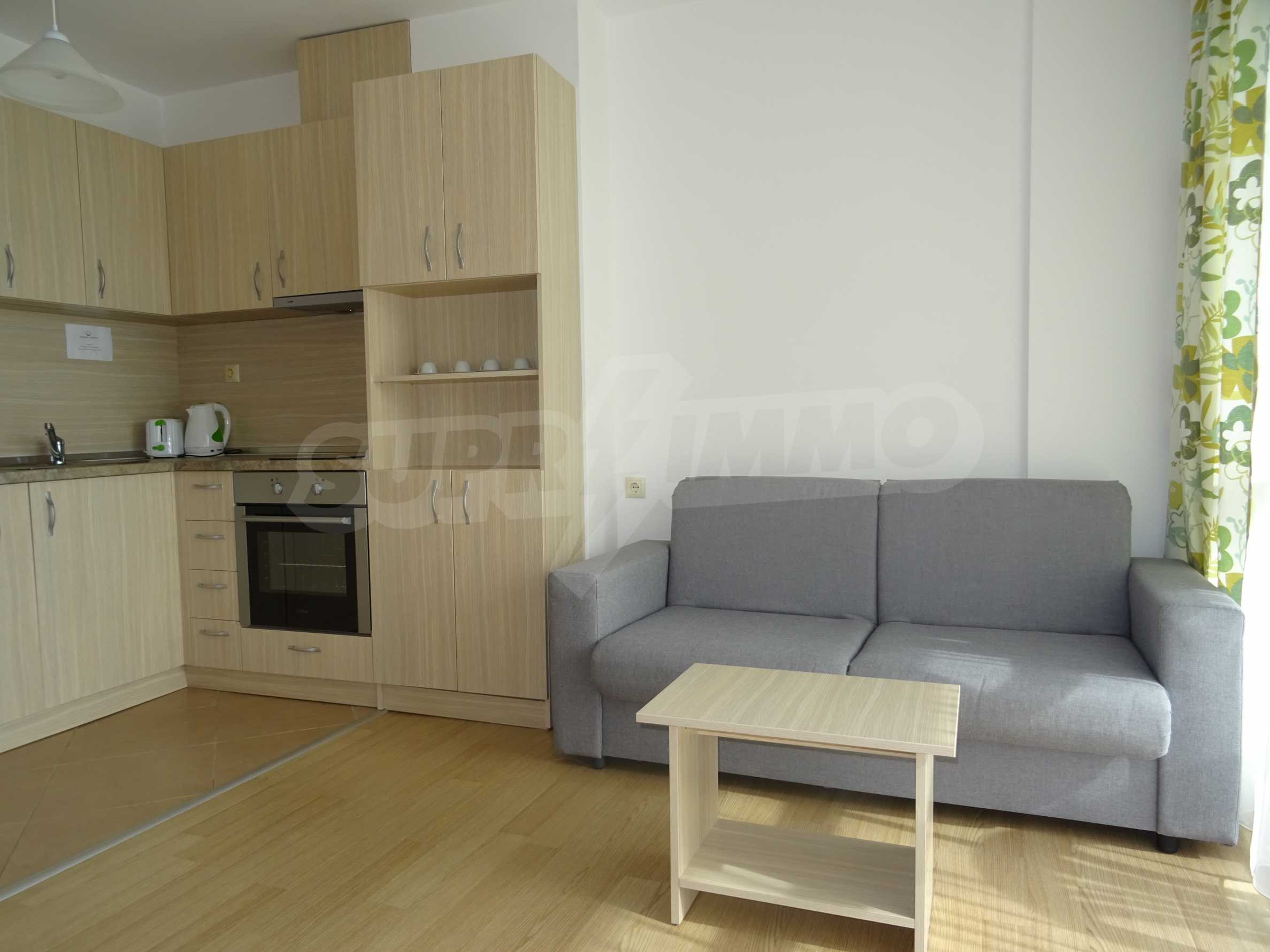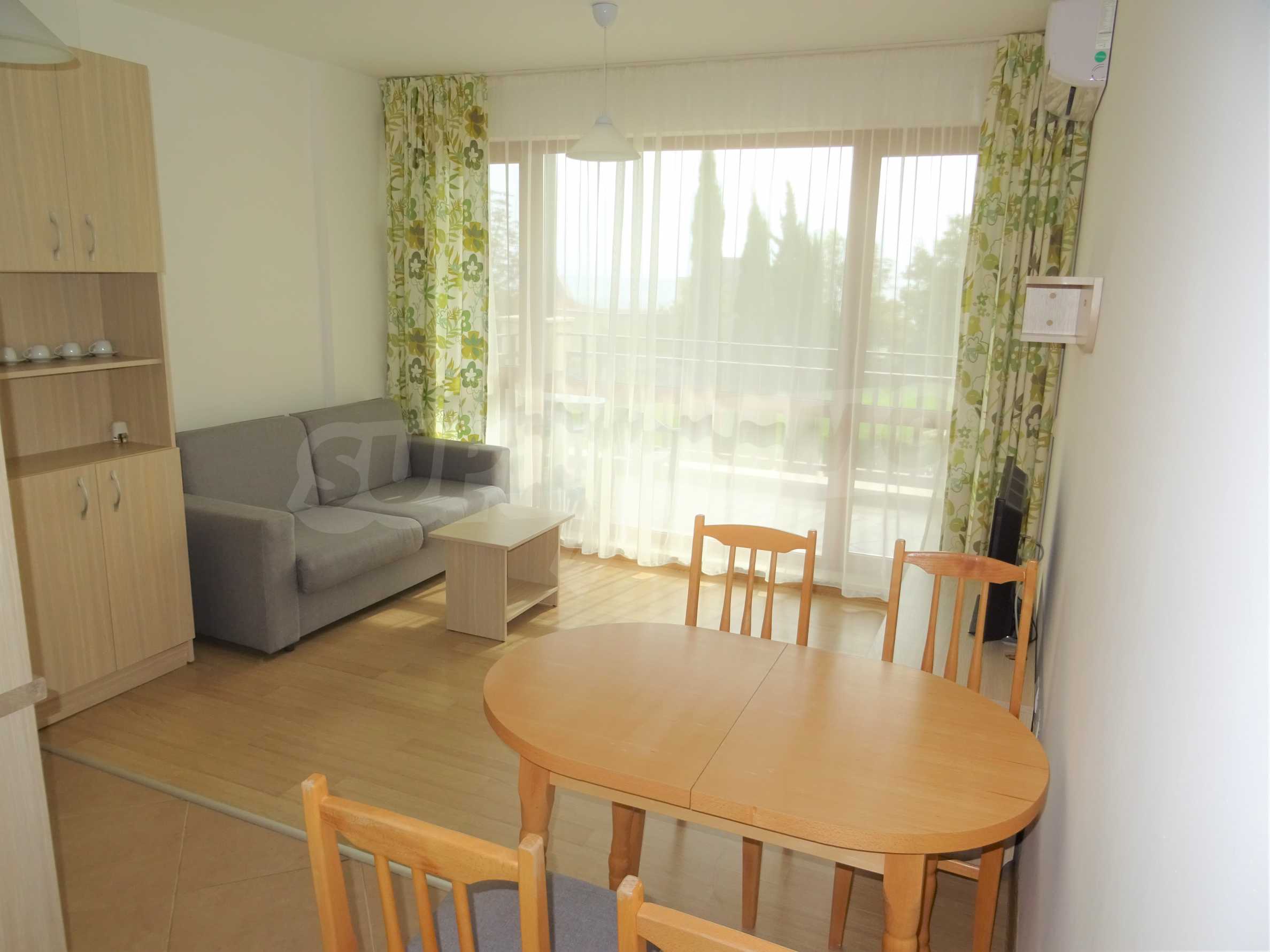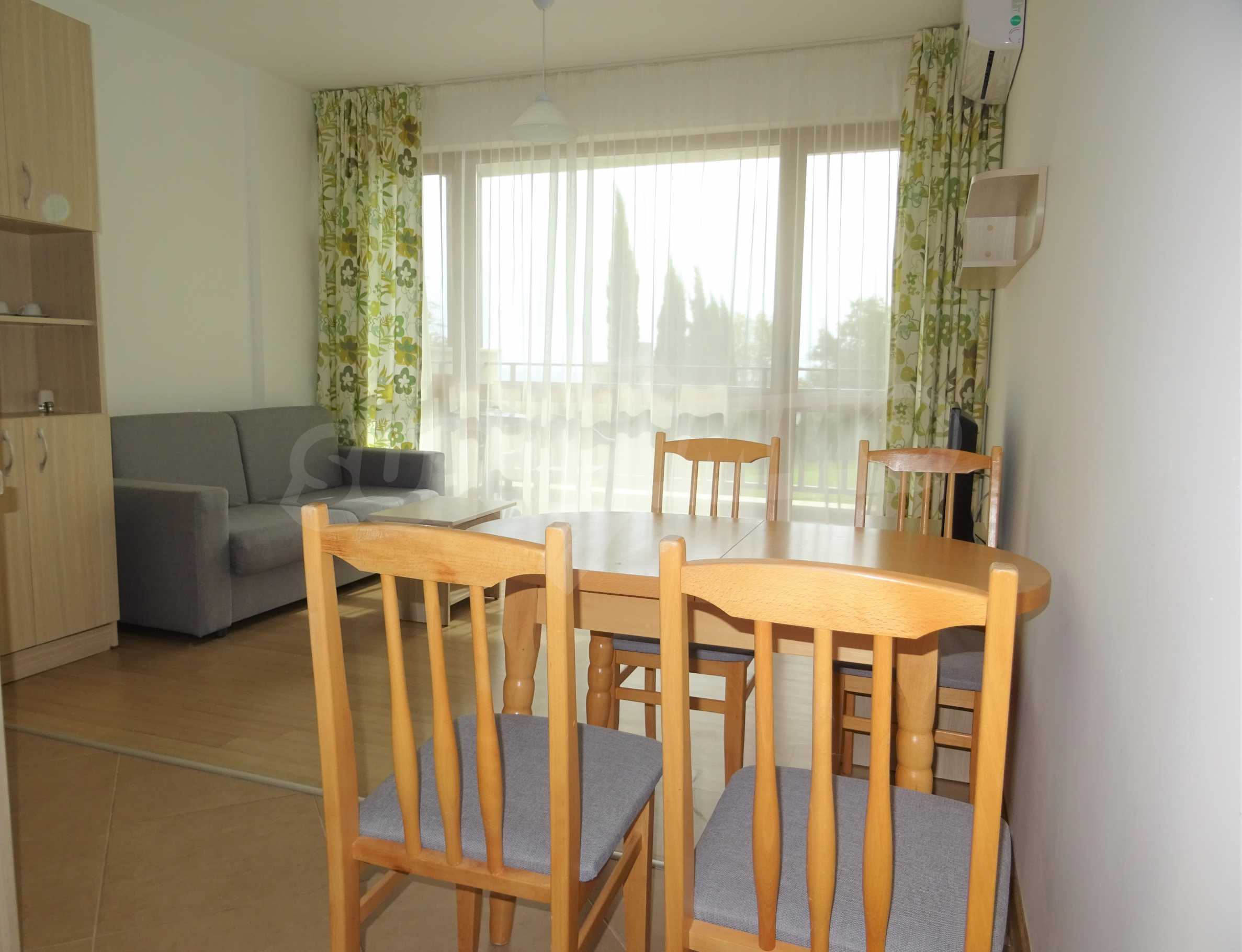 The property is part of an attractive gated complex with year-round maintenance. The apartment is located on the first (not ground floor) and consists of entrance hall, living room, comfortable bedroom, bathroom and toilet in one. Sold fully furnished, with everything you need for a modern household.