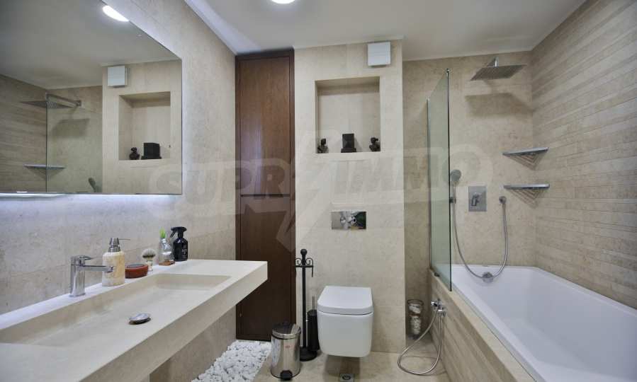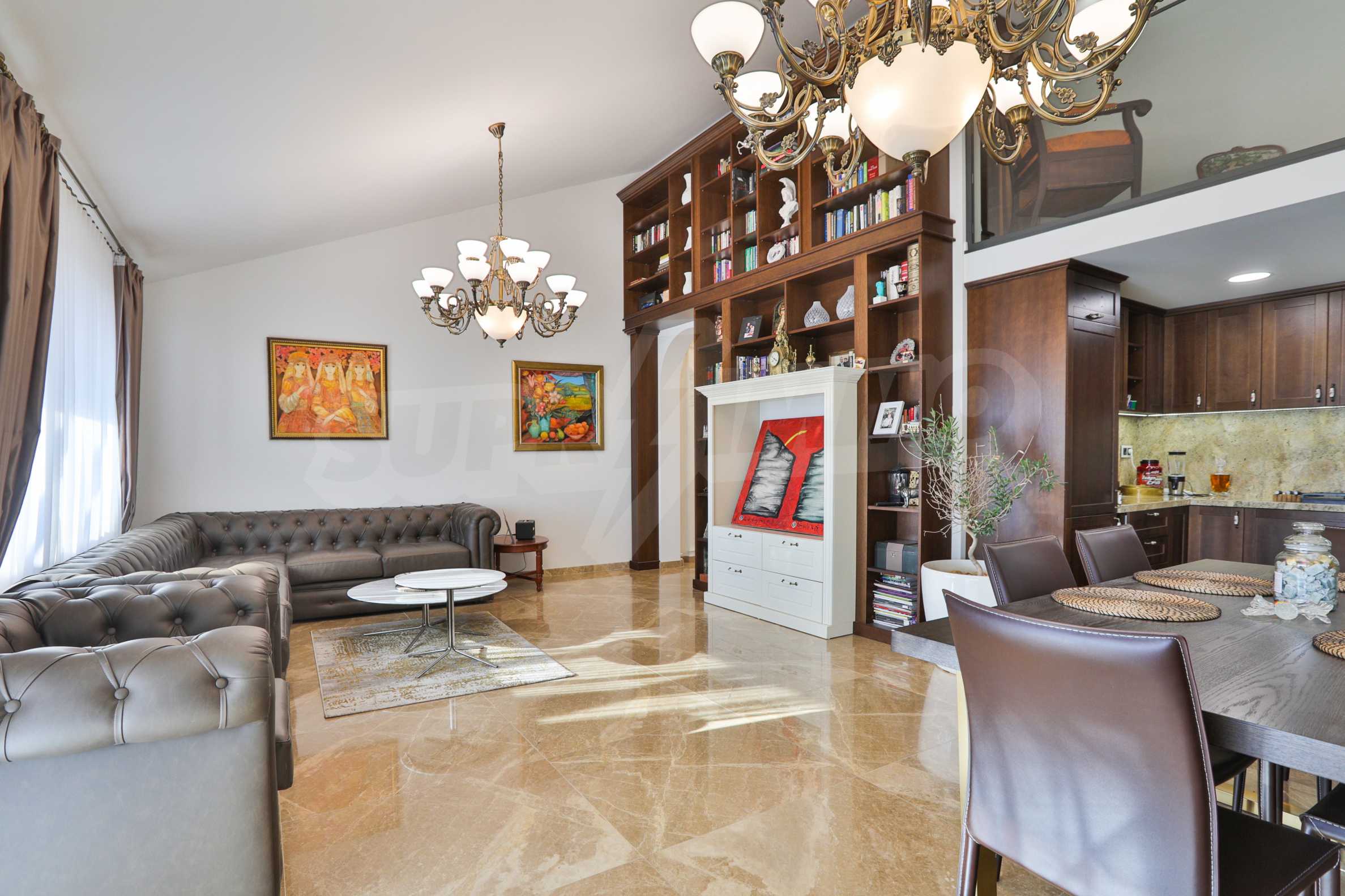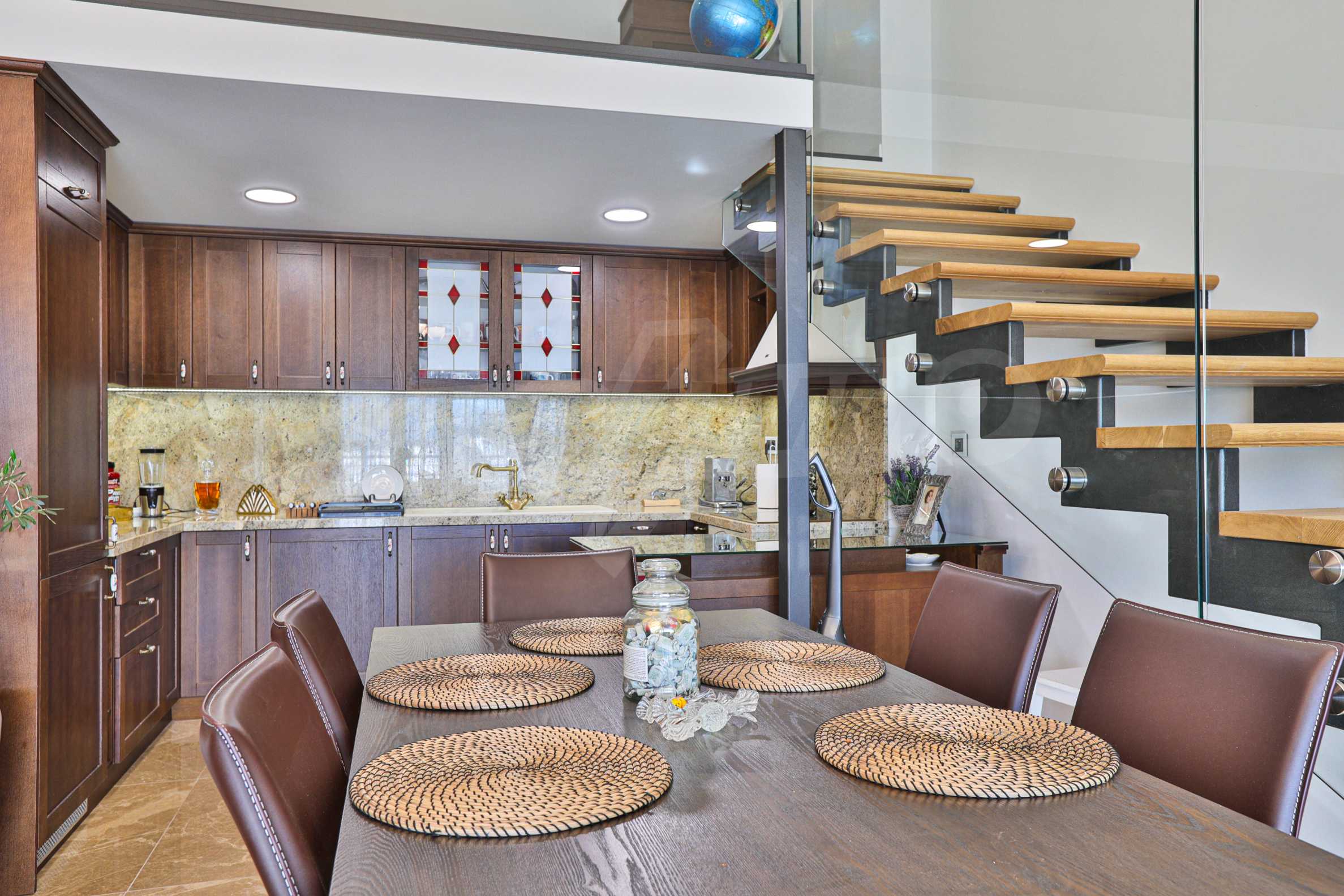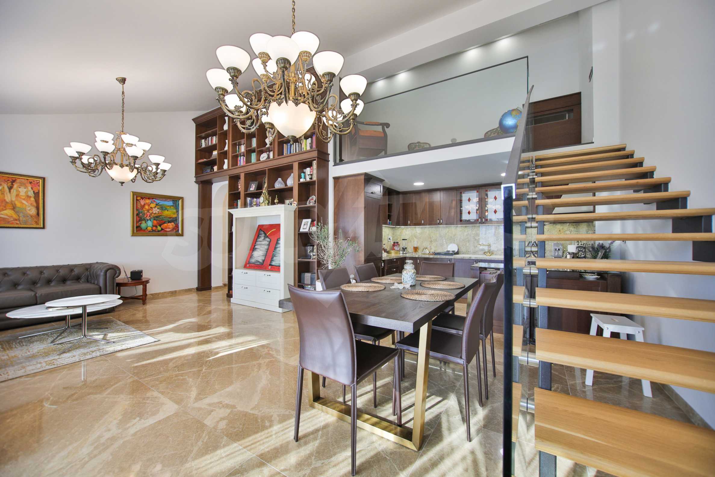 The apartment consists of a large entrance hall with ceilings over five meters, three spacious and bright bedrooms - luxuriously furnished, sunny living room with dining area and kitchen, fully equipped with high class appliances of the brands Faber and Eurolux, kitchen countertop - granite and all solid wood elements. An internal staircase in the living room leads to the office above the kitchen, which is an area with separate ventilation, the apartment has two spacious bathrooms with toilets - luxuriously executed by Martinelli, marble and granite. All lighting fixtures in the apartment are BRUSSARDI brand.