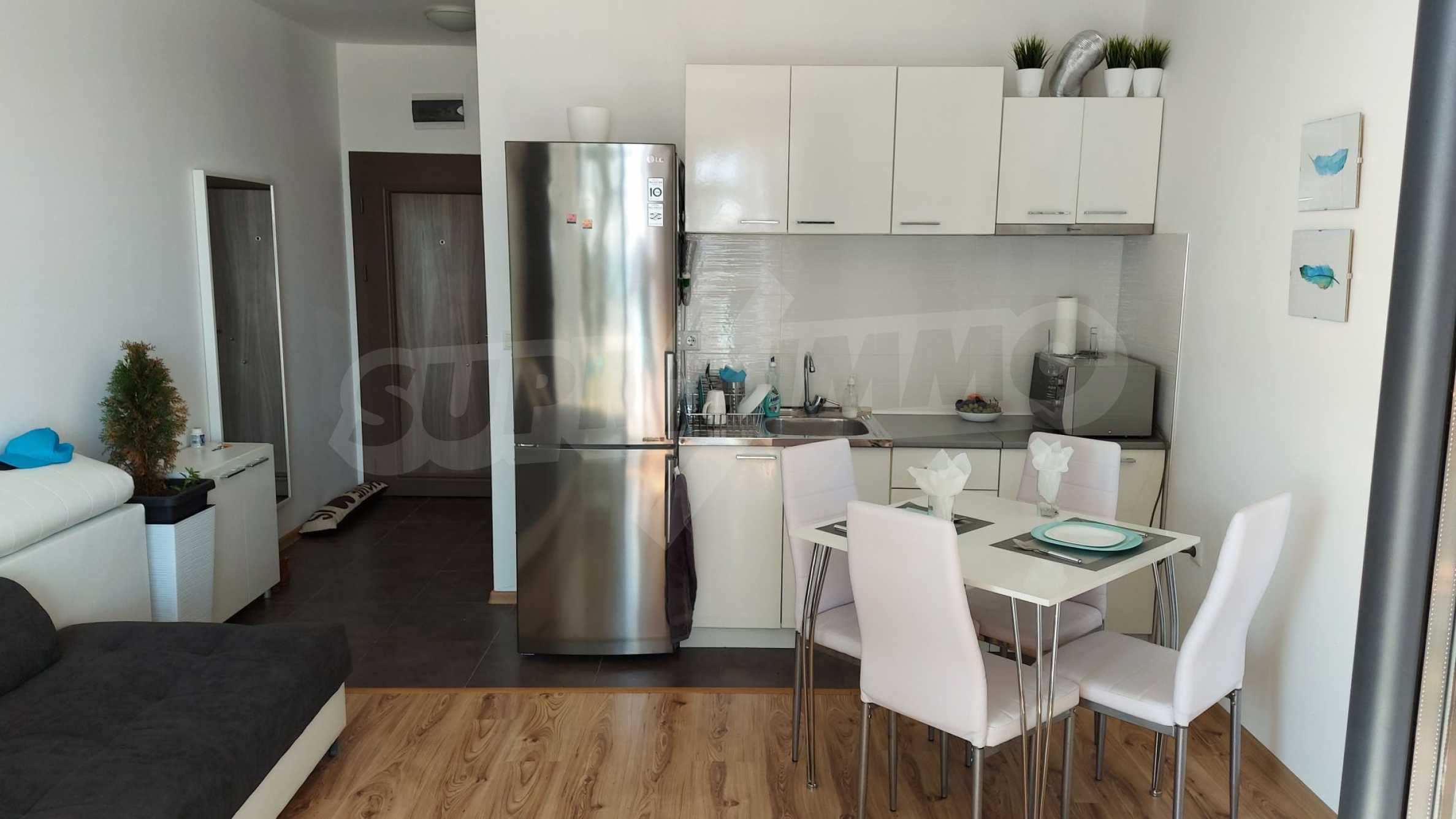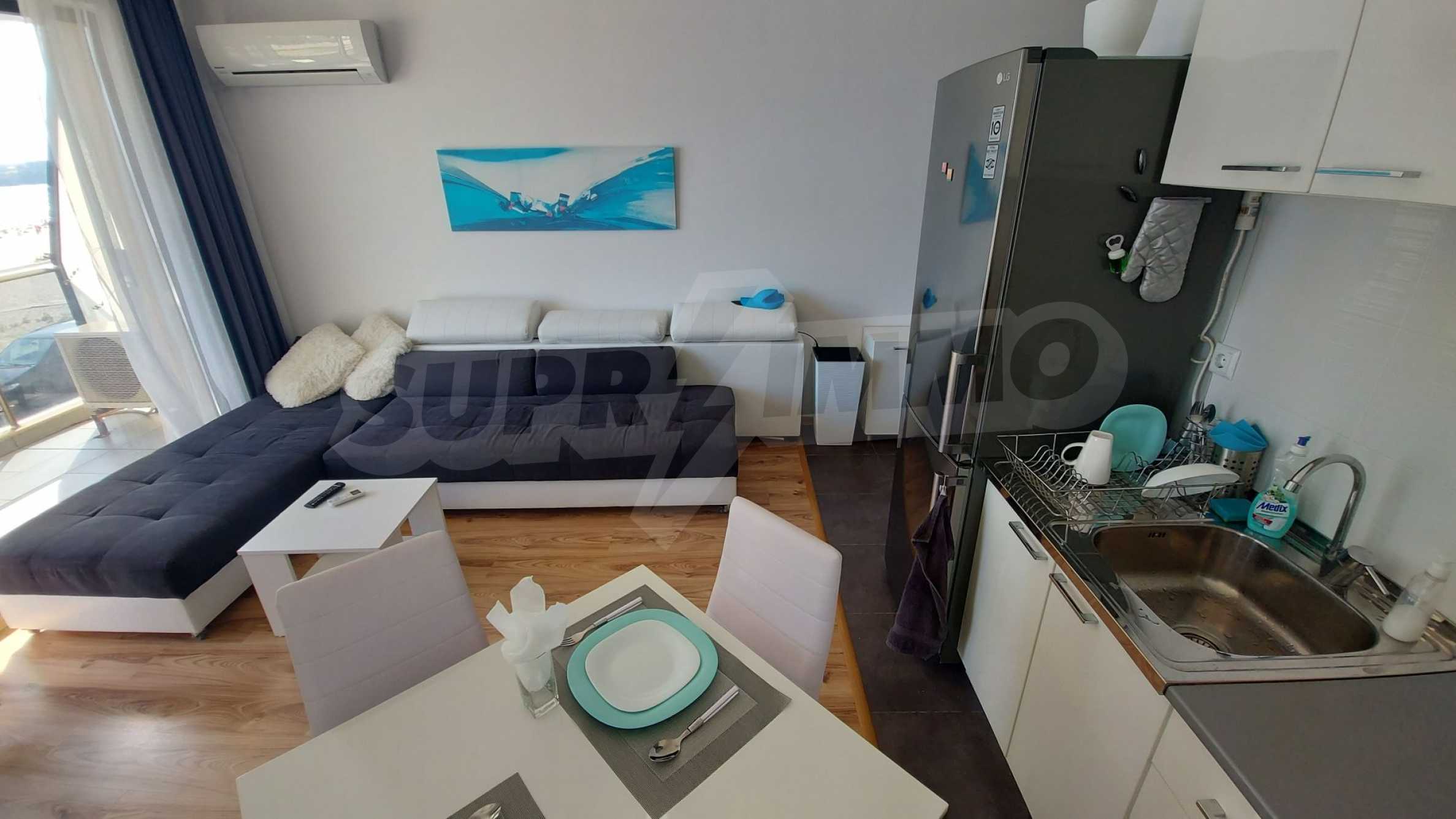 The apartment is well and stylishly equipped, with a nice sea design and bright kitchen, cozy furniture and a finished bathroom.