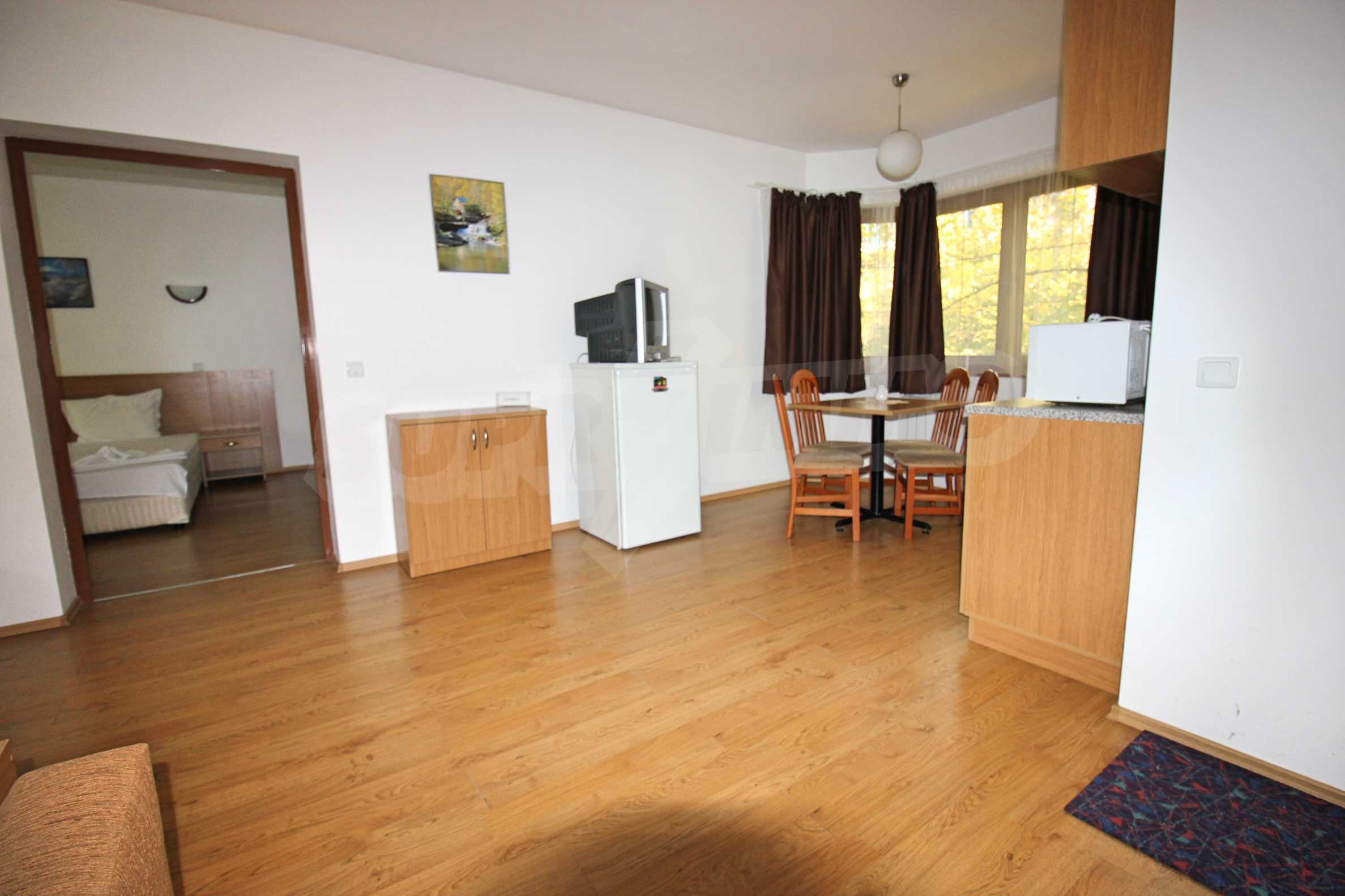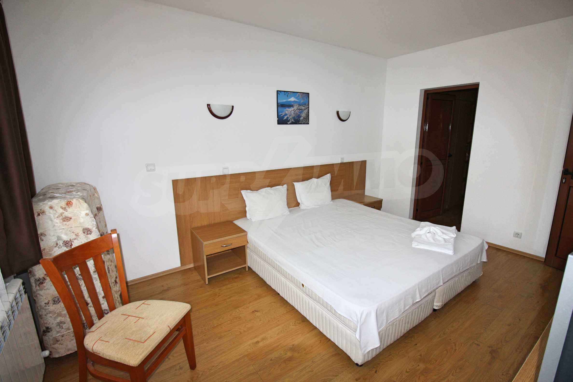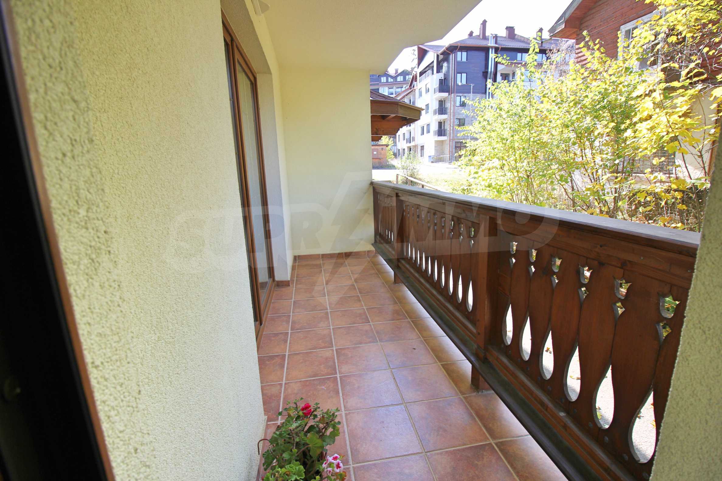 We are glad to present this one-bedroom apartment on the first floor in a gated complex in Borovets. The apartment has a total area of 84 sq.m, with western and northern exposure and the following distribution: entrance hall, kitchenette with dining area, bedroom, bathroom/wc, and balcony. The floors are granite and laminate, the walls are latex, the windows are with PVC window frames. Heating and hot water are provided by an individual boiler and Italian aluminum radiators.
