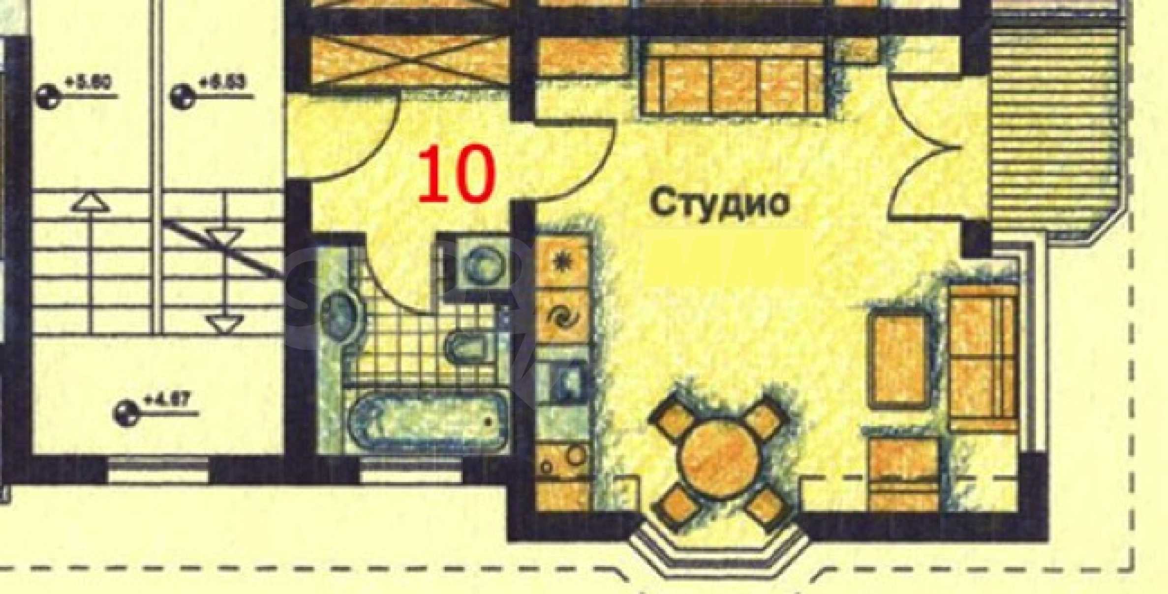 We are glad to present this studio on the third floor in a gated complex in Borovets. The apartment has a total area of 54 square meters, with southeastern exposure and the following distribution: entrance hall, kitchenette with dining area and bedroom, bathroom with tub, and balcony. The floors are with ceramic tiles and laminate, the walls are latex, the windows are with PVC window frames. Heating and hot water are provided by an individual boiler and Italian aluminum radiators.