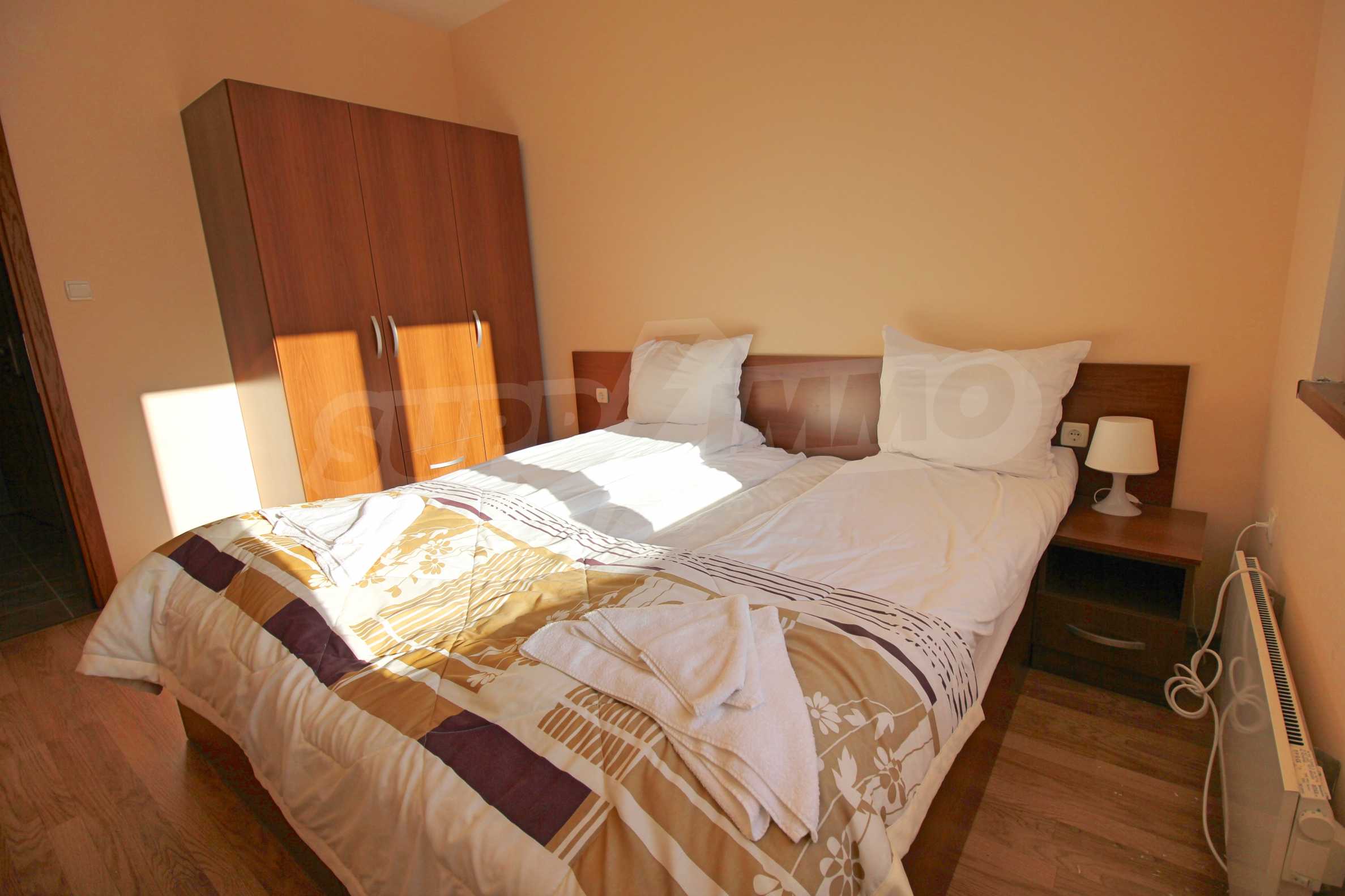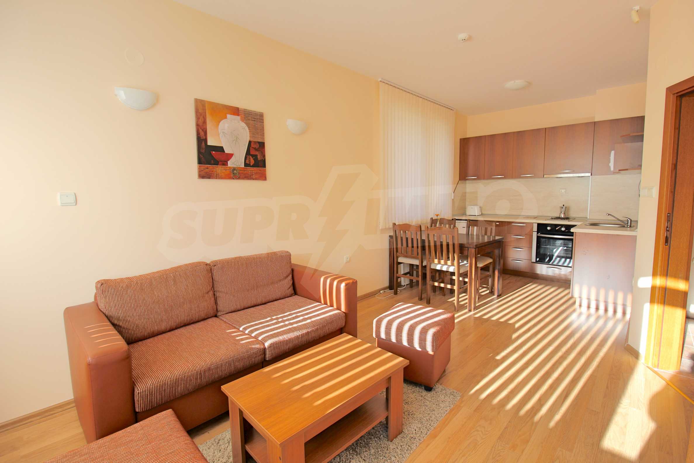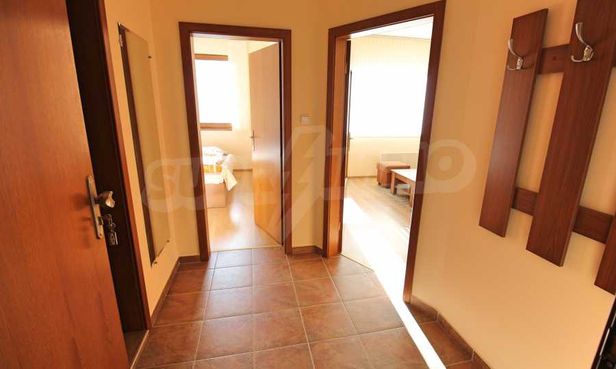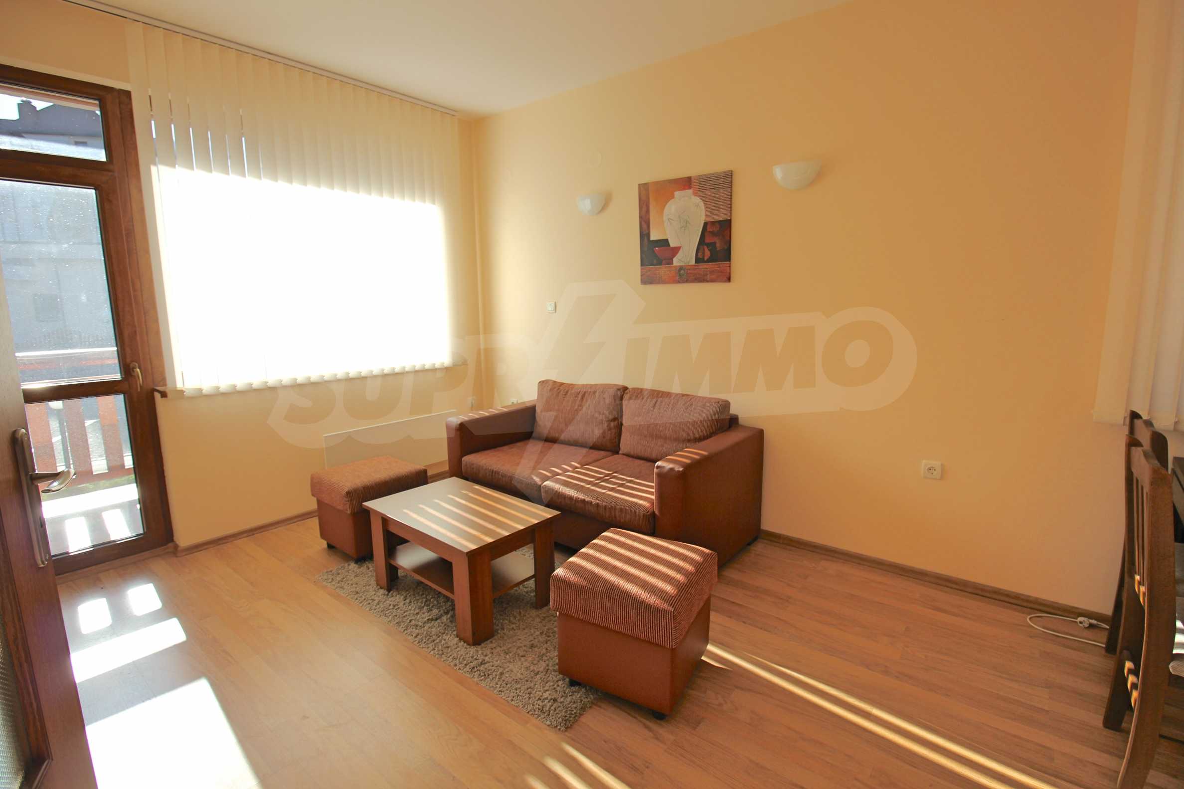 We are glad to present this fully furnished apartment with views of the pine forest and mountains in the ski resort Borovets. The one-bedroom apartment is located on the first floor with a total area of 65.67 sq.m., net area - 50.74 sq.m., distributed between an entrance hall, a living room with a kitchenette, a bedroom, a bathroom with a toilet, and a balcony. The rooms are finished with walls - latex, floor - laminate in the rooms and granite in the hallway, windows - wooden. The furniture and equipment include a sink, cabinets, refrigerator, stove, table with 4 chairs (kitchen); sofa, coffee table, 2 stools, TV, TV cabinet (living room); double bed, two bedside tables, wardrobe (bedroom); bath, sink with mirror (bathroom with toilet). The apartment is wired for internet and cable TV. The heating is with electric convectors. The maintenance fee for the common areas is 12 euros per square meter per year.