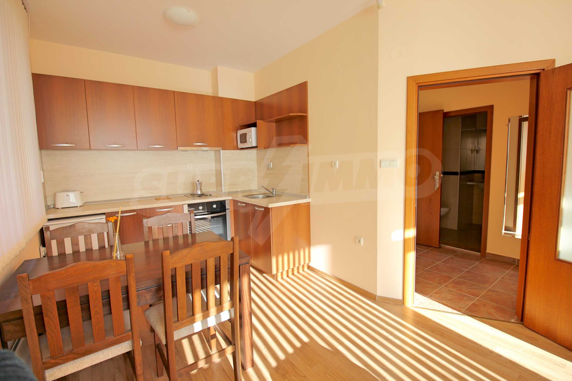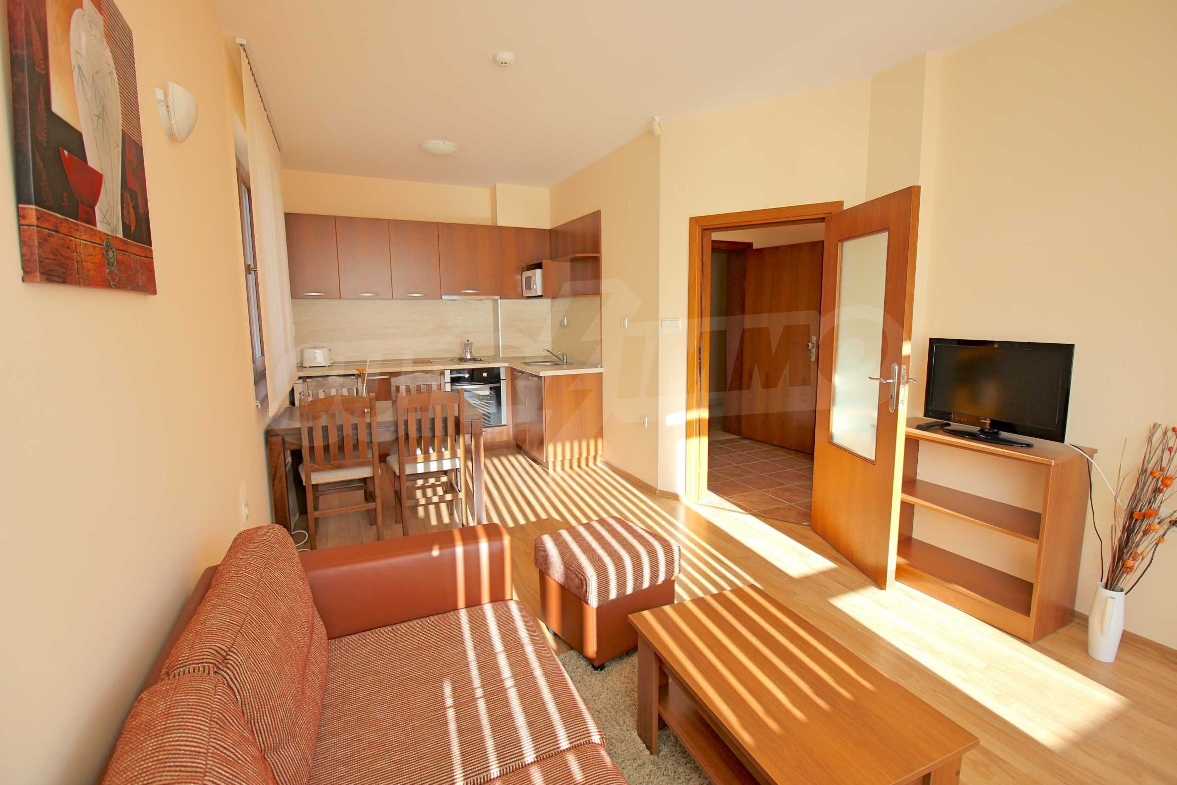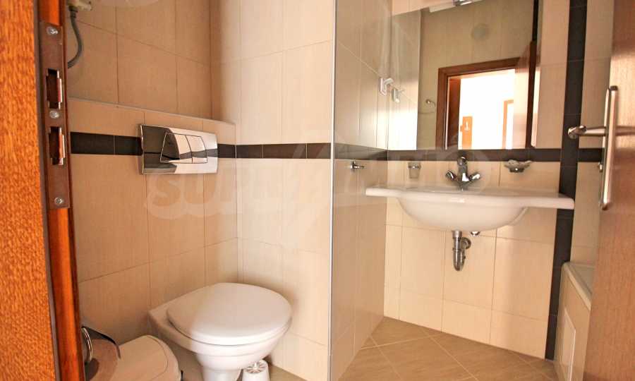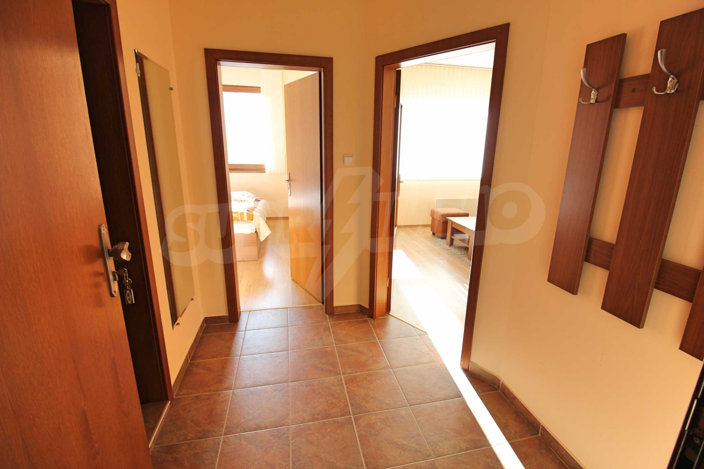 We are glad to present this fully furnished apartment with views of the pine forest and mountains in the ski resort Borovets. The one-bedroom apartment is located on the first floor with a total area of 65.67 sq.m., net area - 50.74 sq.m., distributed between an entrance hall, a living room with a kitchenette, a bedroom, a bathroom with a toilet, and a balcony. The rooms are finished with walls - latex, floor - laminate in the rooms and granite in the hallway, windows - wooden. The furniture and equipment include a sink, cabinets, refrigerator, stove, table with 4 chairs (kitchen); sofa, coffee table, 2 stools, TV, TV cabinet (living room); double bed, two bedside tables, wardrobe (bedroom); bath, sink with mirror (bathroom with toilet). The apartment is wired for internet and cable TV. The heating is with electric convectors. The maintenance fee for the common areas is 12 euros per square meter per year.
