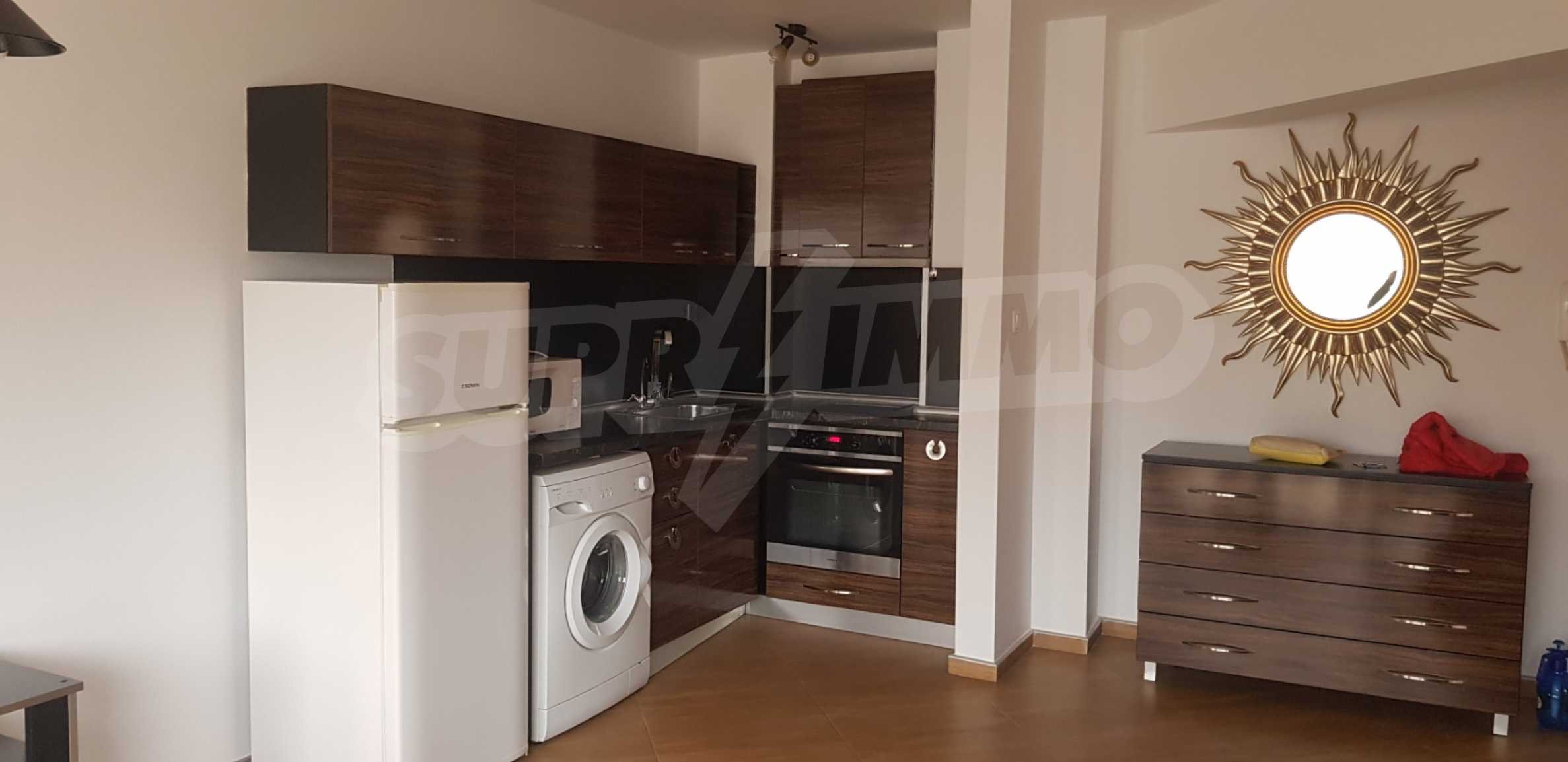 The rooms are comfortably and functionally furnished, and the large windows provide a lot of light. The kitchen and the bathroom are fully equipped and have the necessary appliances for a household. The apartment is heated with air conditioners.