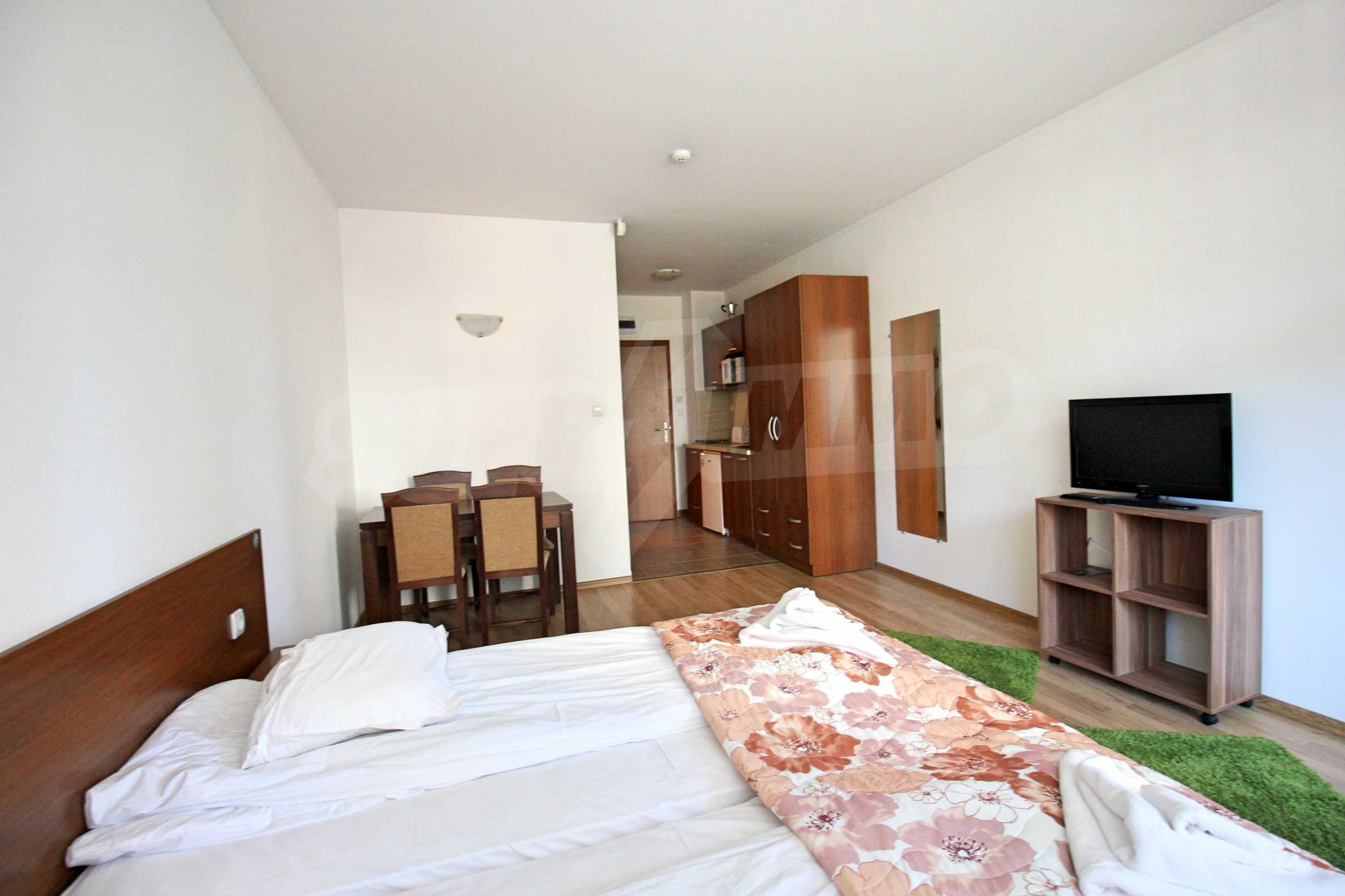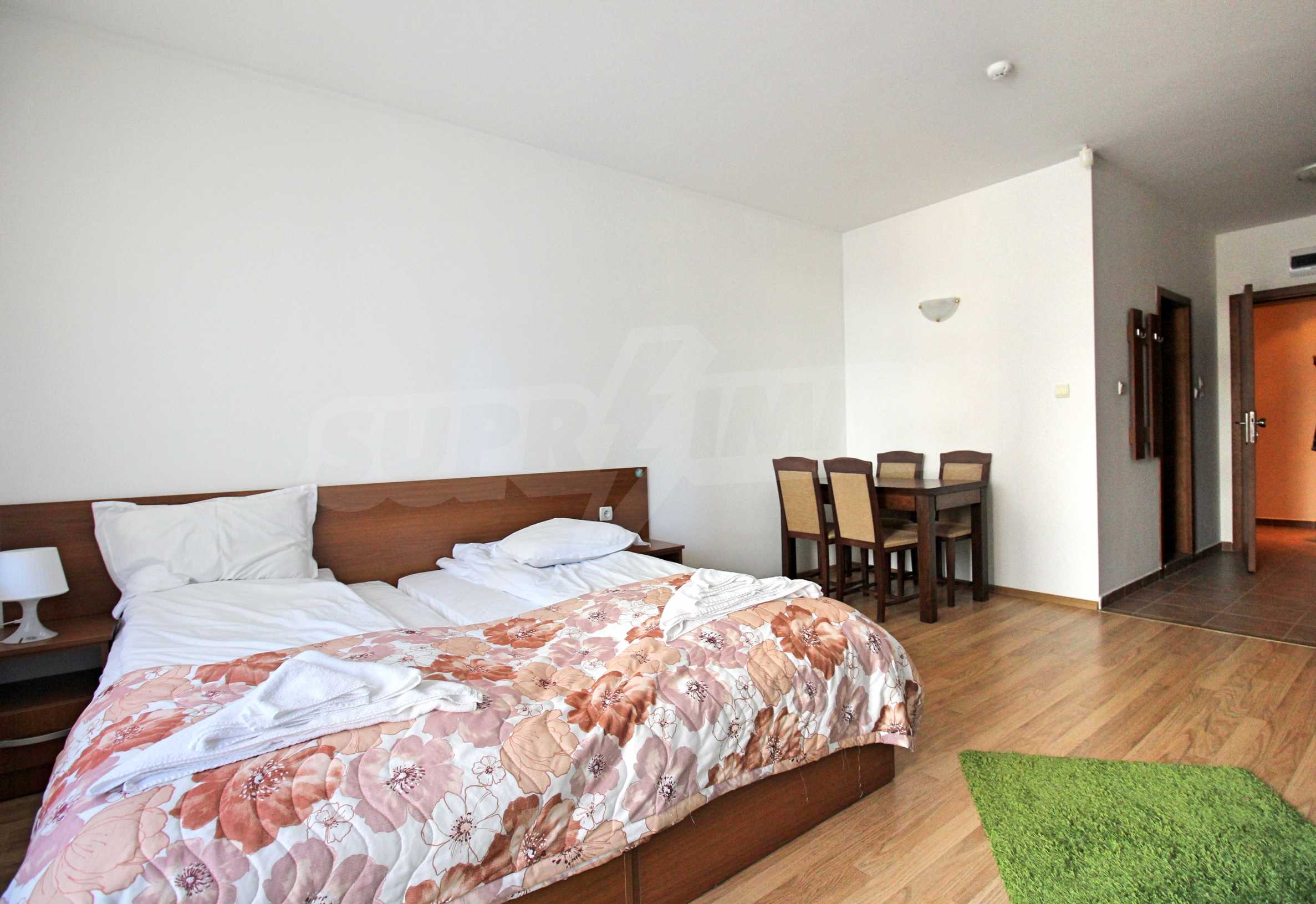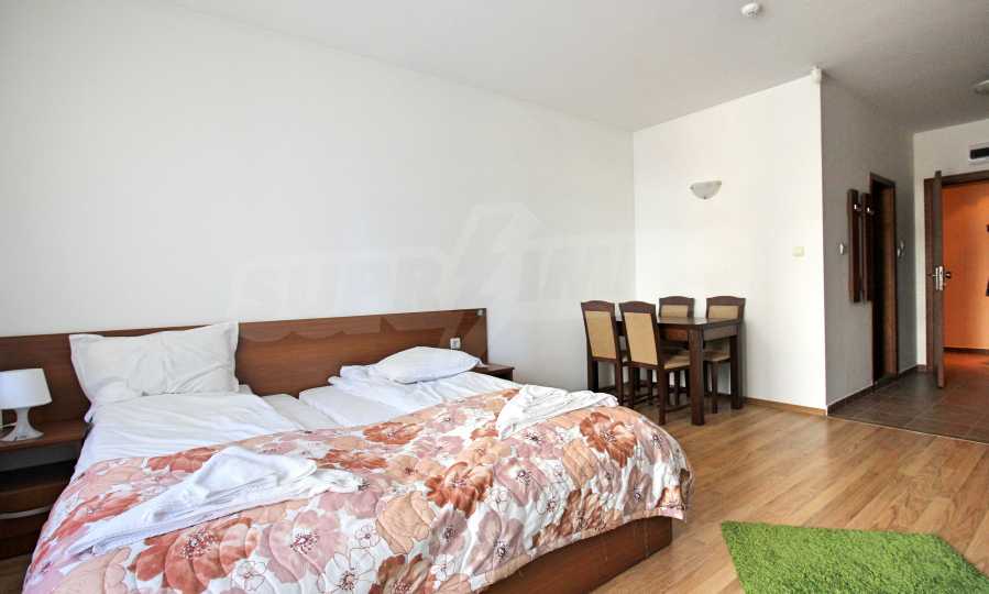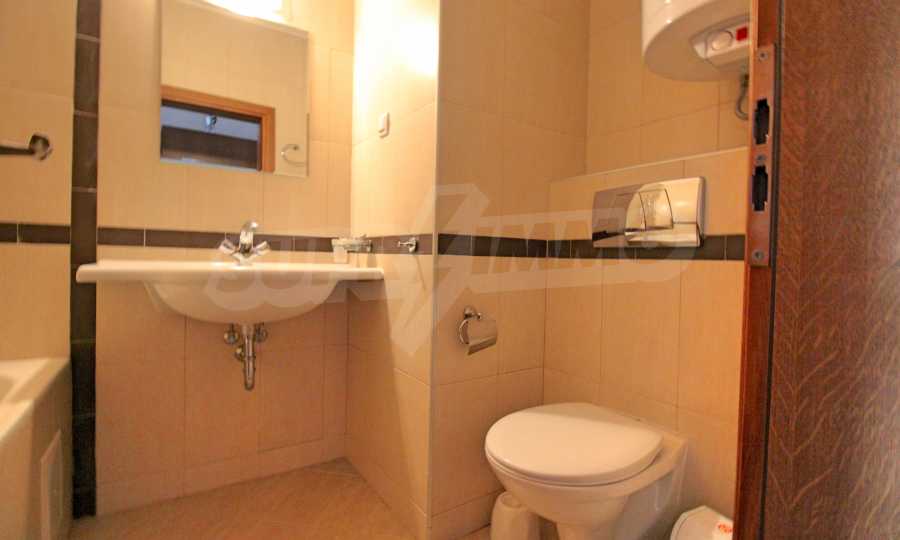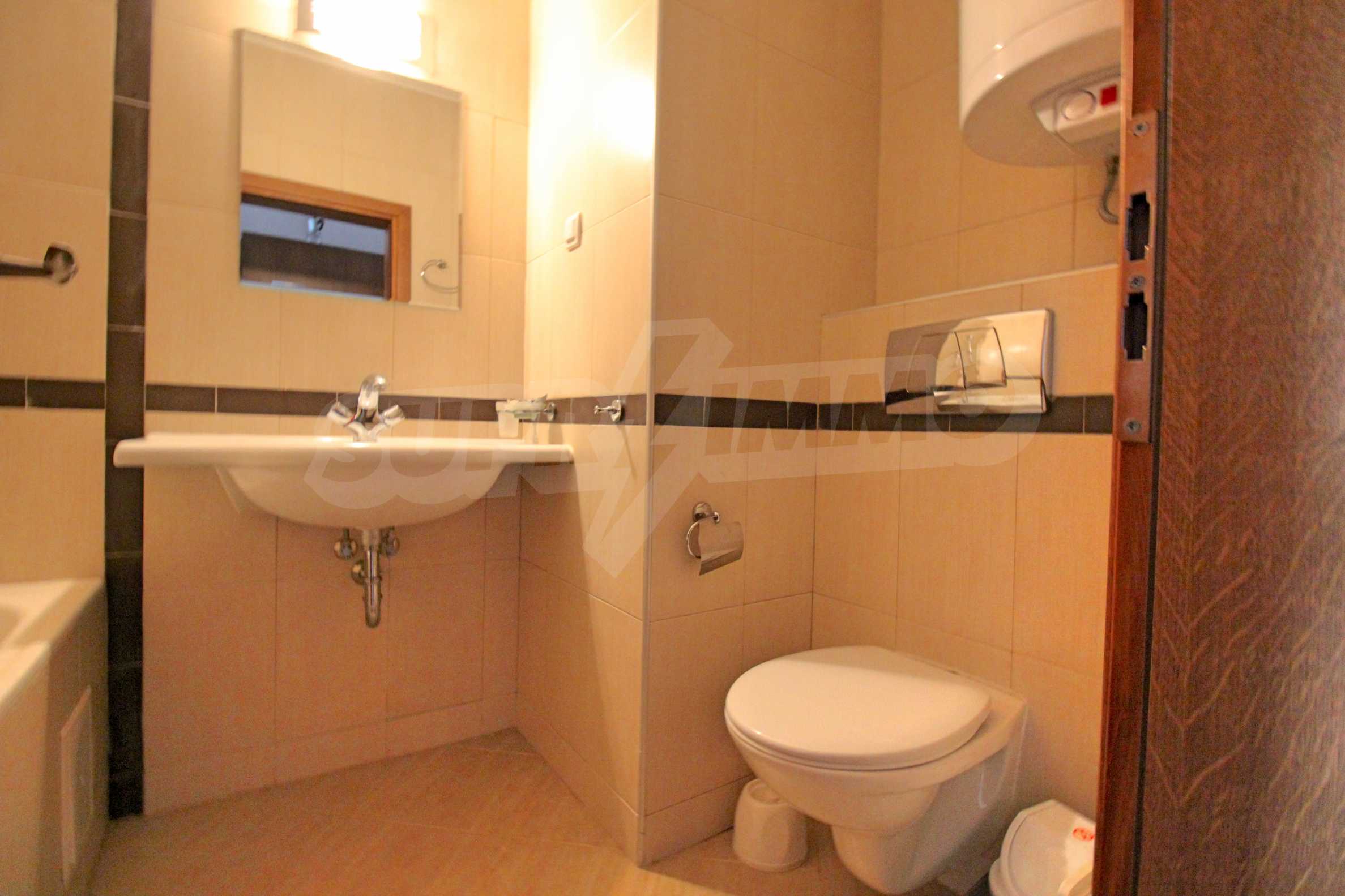 We are glad to present this fully furnished apartment with south-east exposure in the ski resort Borovets. The studio is located on the first floor with a total area of 46.12 sq.m., distributed between an entrance hall, a living room with a kitchenette, and bedroom, a bathroom with a toilet, and a balcony. The rooms are finished with walls - latex, floor - laminate in the rooms and granite in the hallway, windows - wooden. The furniture and equipment include a sink, cabinets, refrigerator, stove, table with 4 chairs (kitchen); sofa, coffee table, 2 stools, TV, TV cabinet (living room); double bed, two bedside tables, wardrobe (bedroom); bath, sink with mirror (bathroom with toilet). The apartment is wired for internet and cable TV. The heating is with electric convectors.