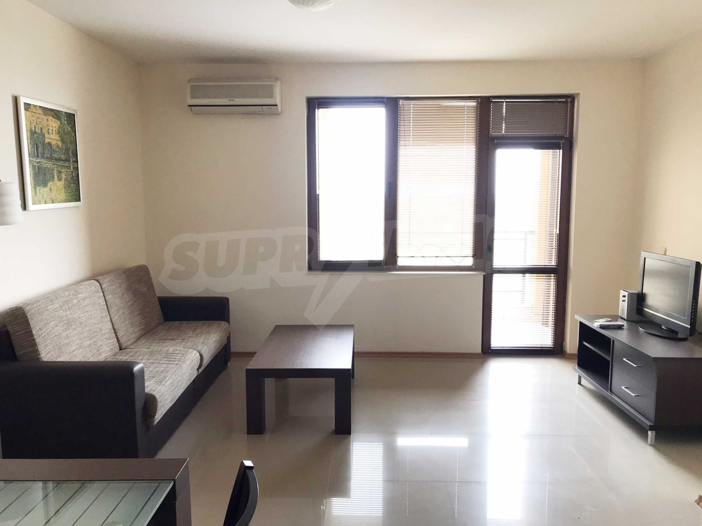 The one-bedroom apartment is located on the 4th floor, with an area of 66.75 m2 and consists of a bedroom, a kitchen with a dining room and a living room, a bathroom with a toilet, which are fully furnished, with everything you need for a holiday property. With a pleasant view of the greenery of the golf course, this apartment is the perfect choice for your personal vacation in Bulgaria.