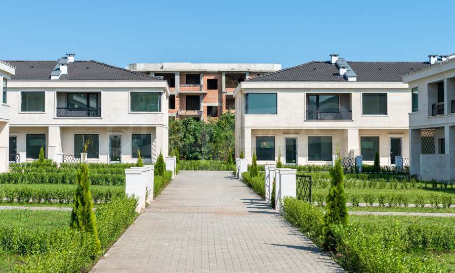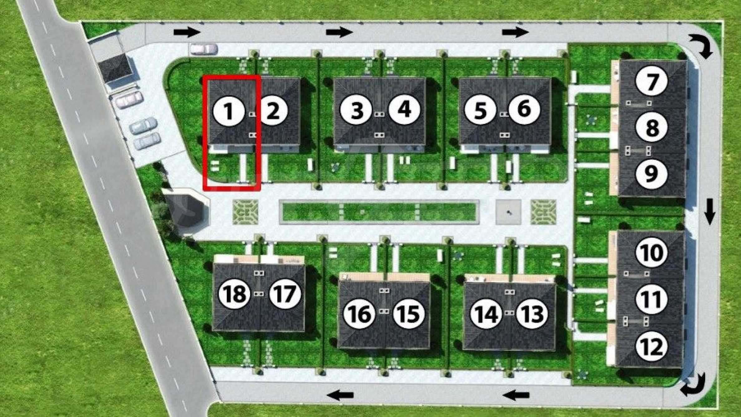 - Vertical planning and cleaned construction site with surrounding space - according to the project, hedges between the houses, ryegrass, paving with concrete pavers on the paths and lighting;