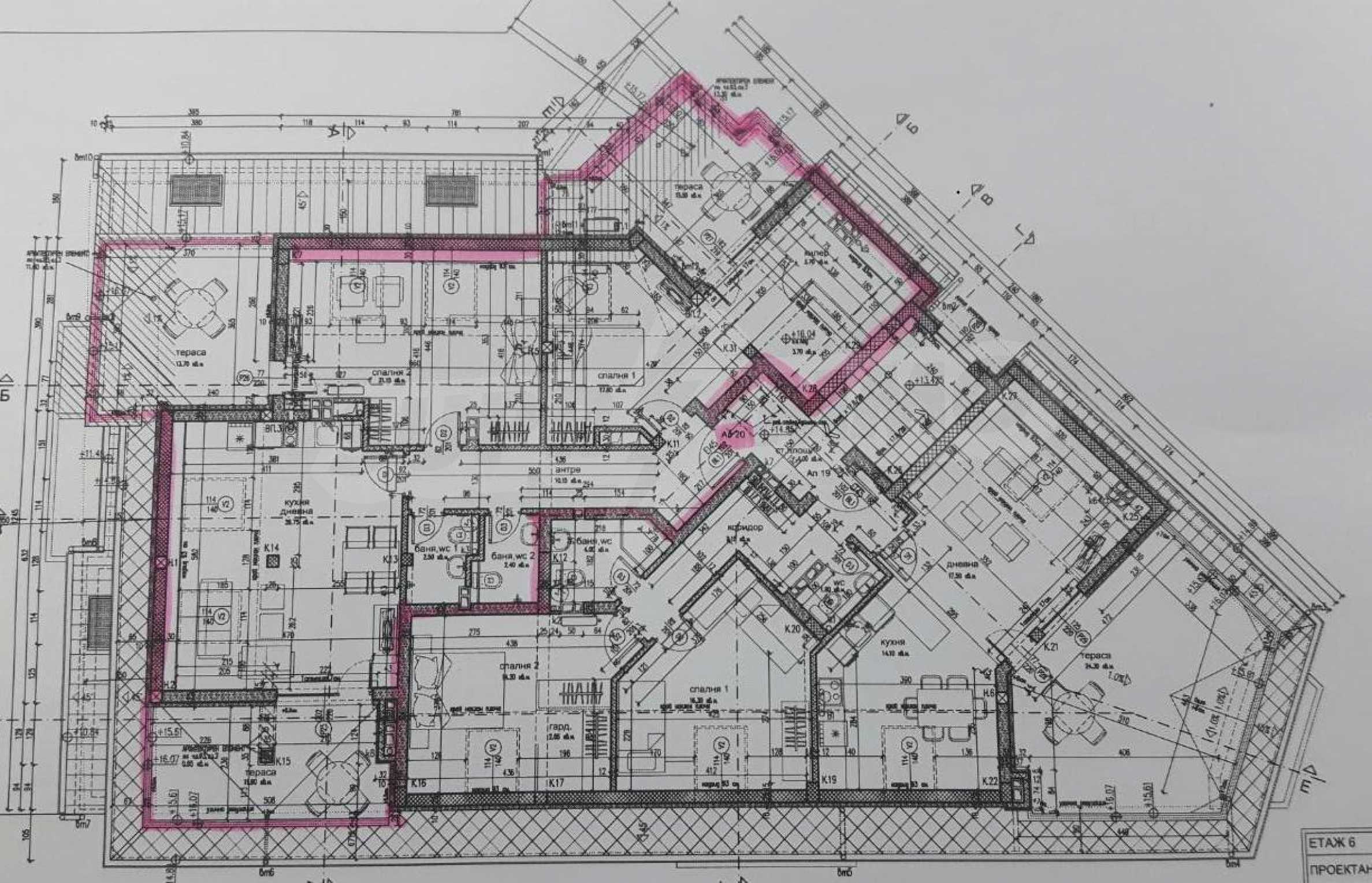 The apartment is on the 6th, top floor, the total area is 185.5 m2 and the net area is 159.55 m2.