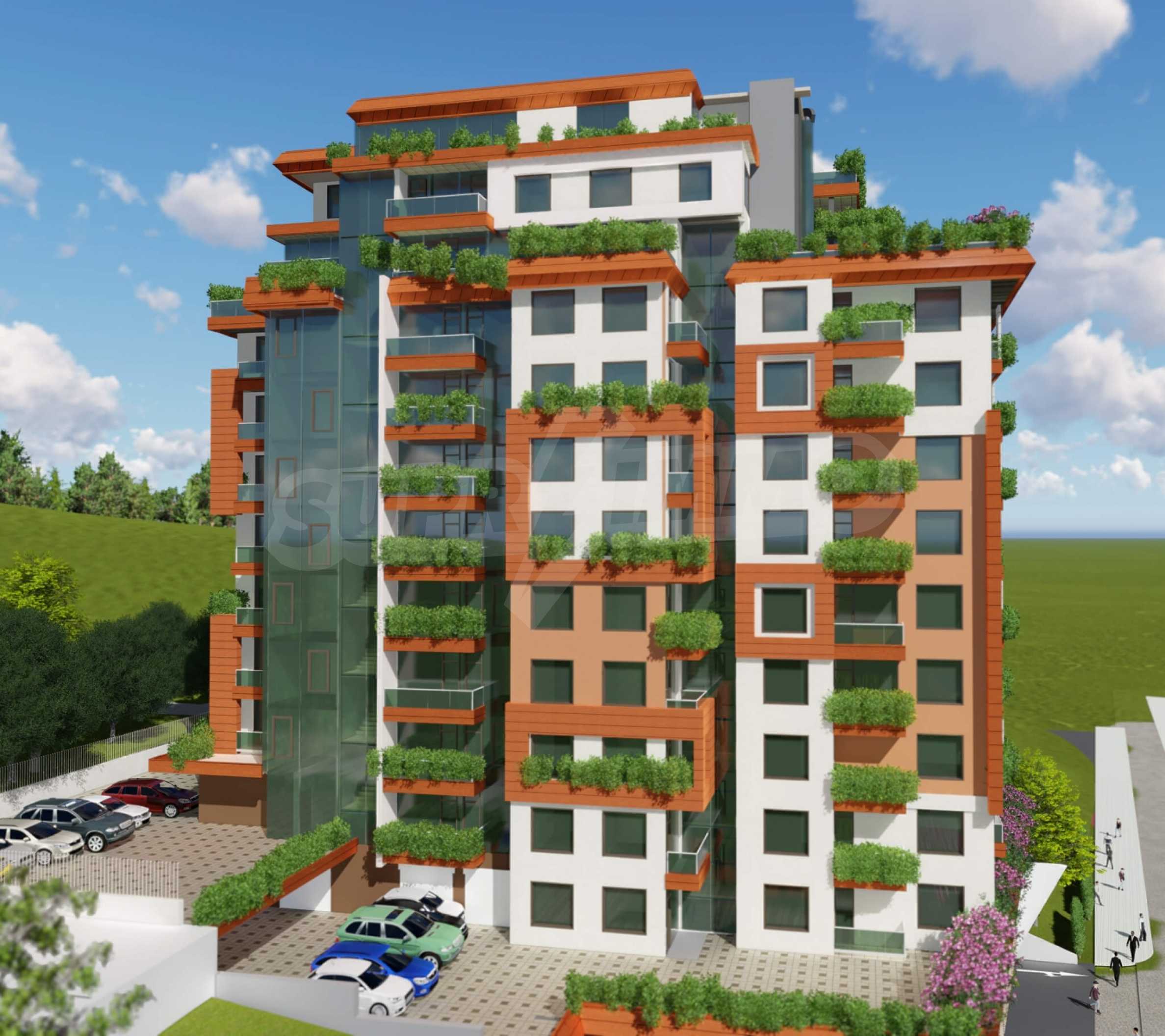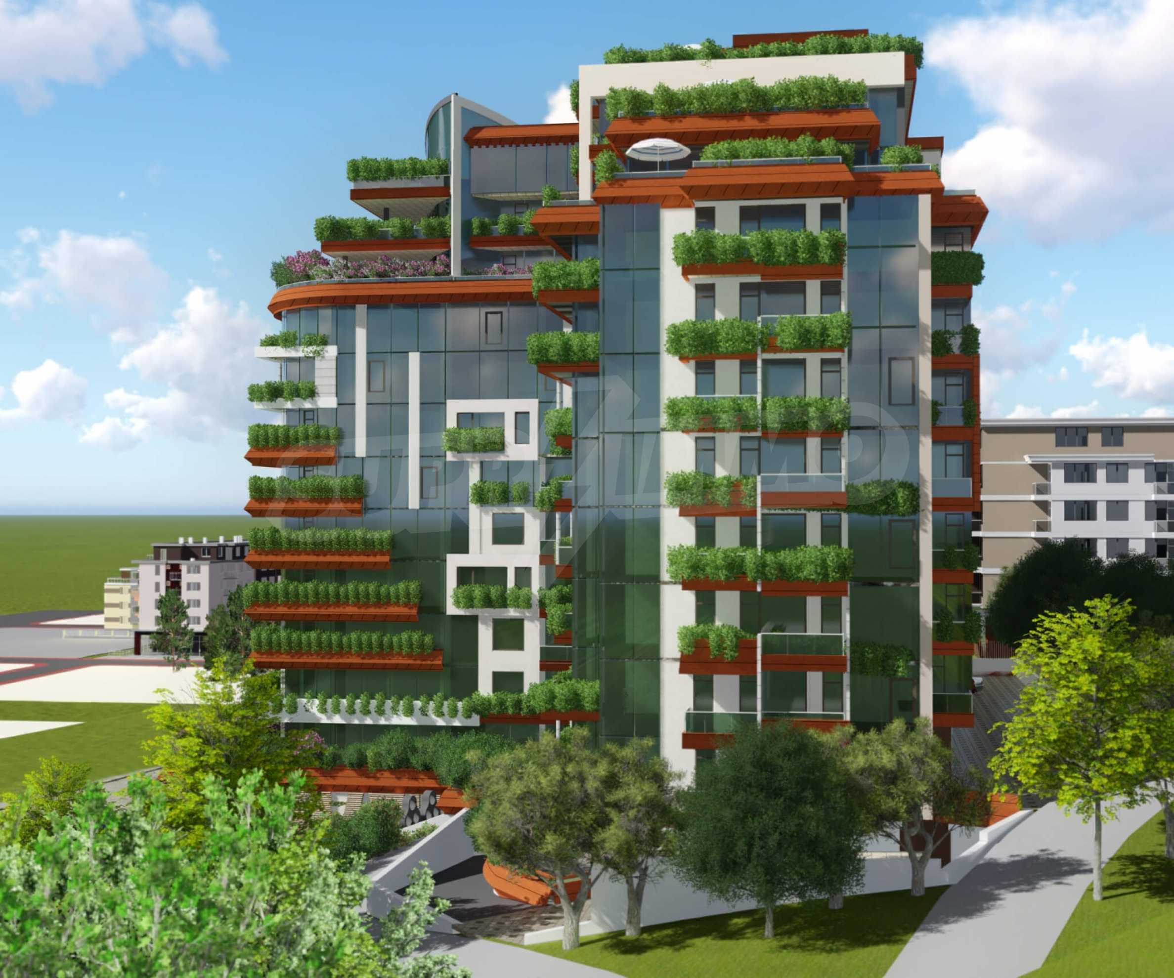 The building includes 3 entrances with 5 high-speed elevators, with beautiful panoramic views of the sea and the whole city. The architecture is modern, fully consistent with the park environment in which the building will be located.