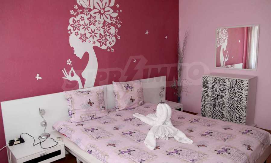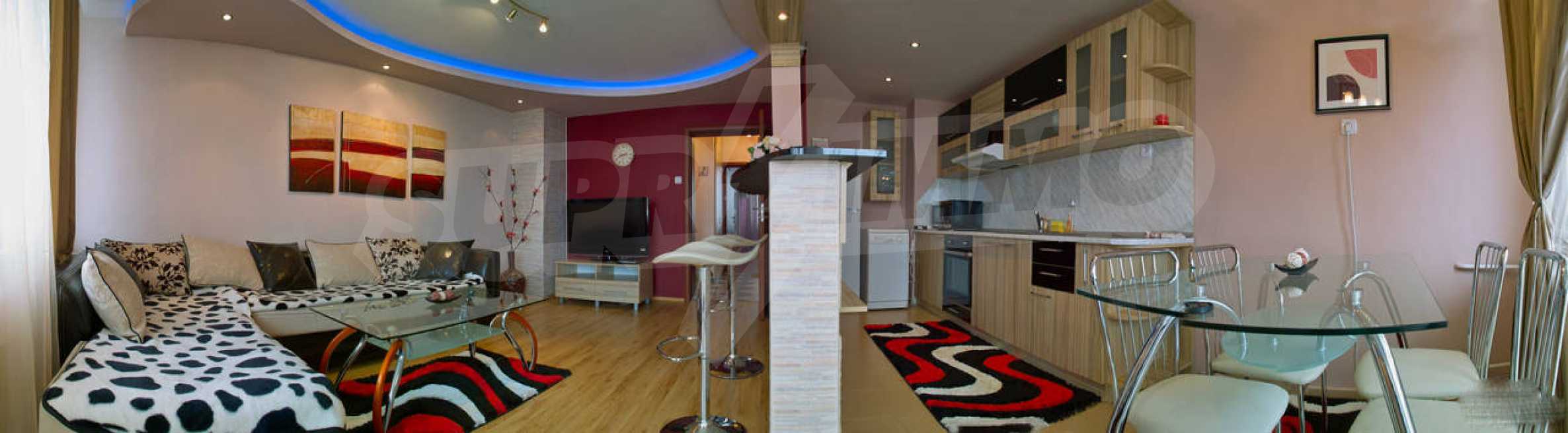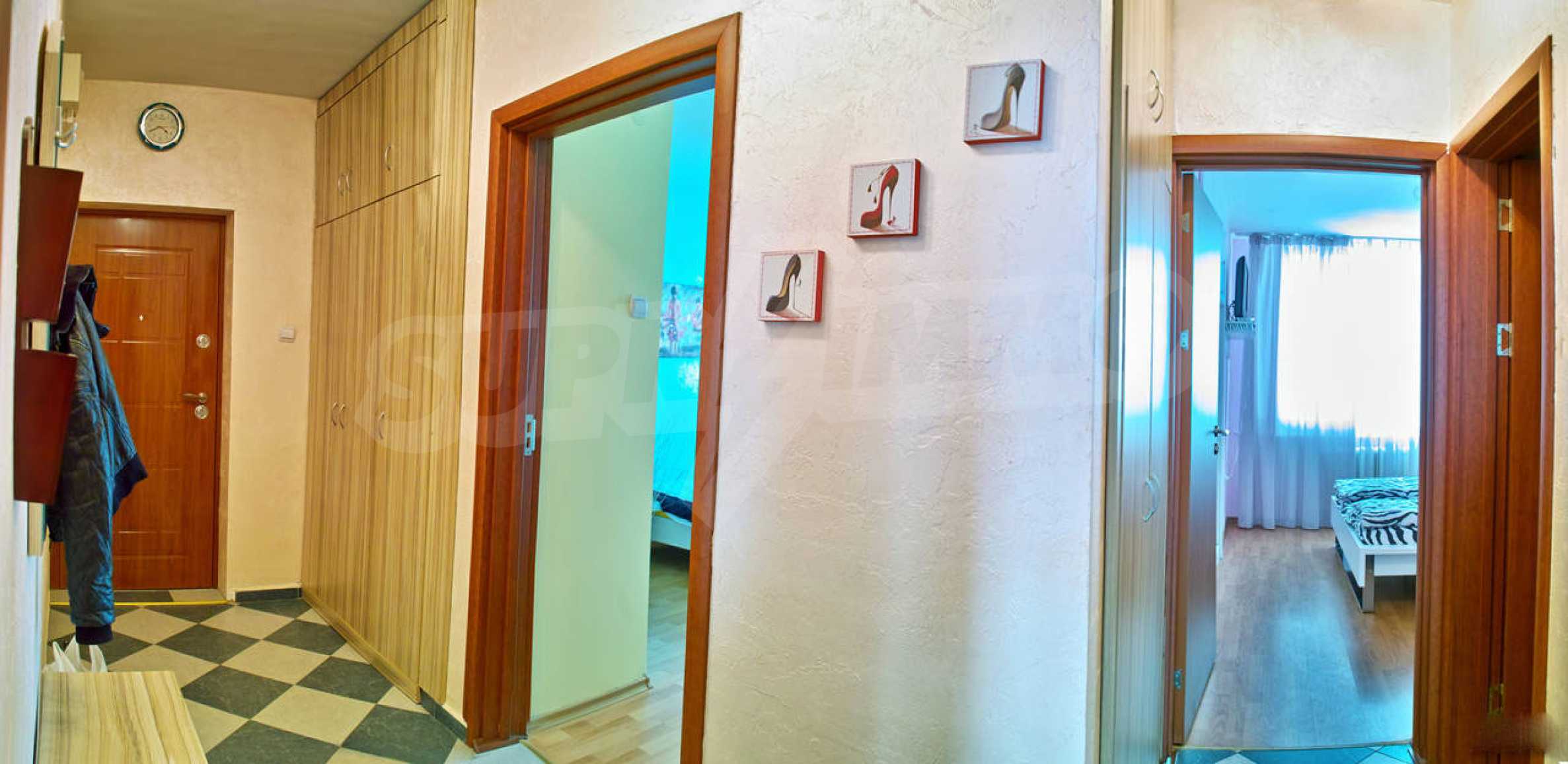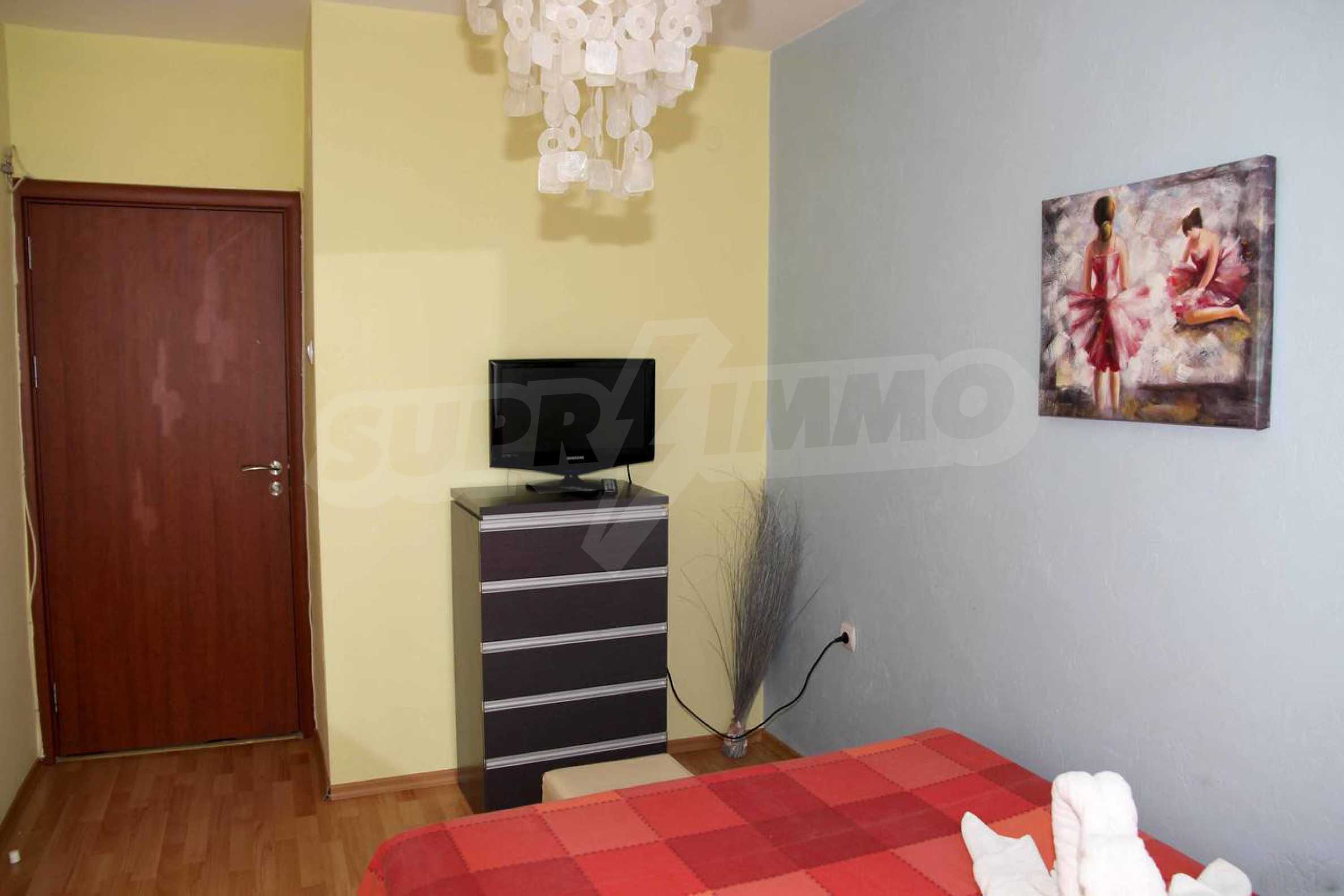 The apartment is fully furnished with all necessary furniture and appliances and has the following layout: living room with kitchenette and dining area, two bedrooms, bathroom with toilet. It has two air conditioners, microwave, two TVs, washing machine, refrigerator, bathtub.