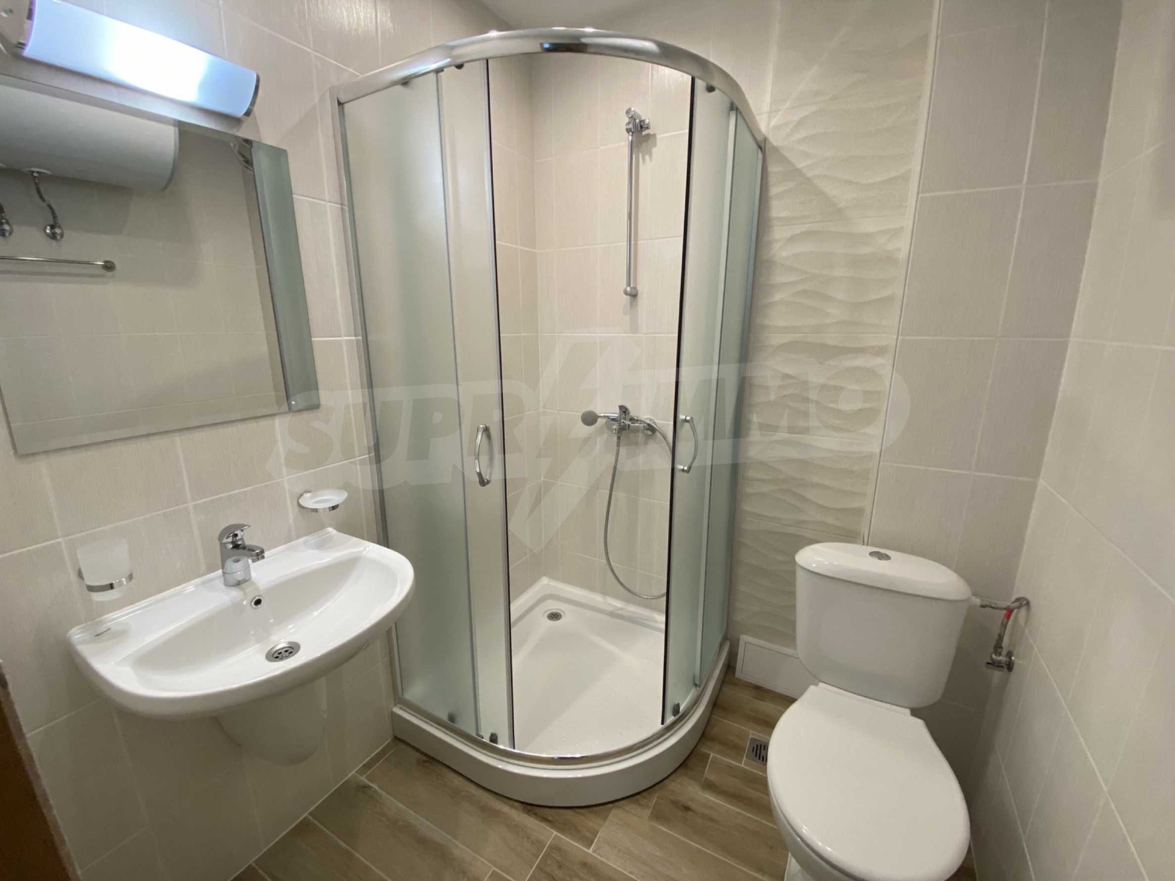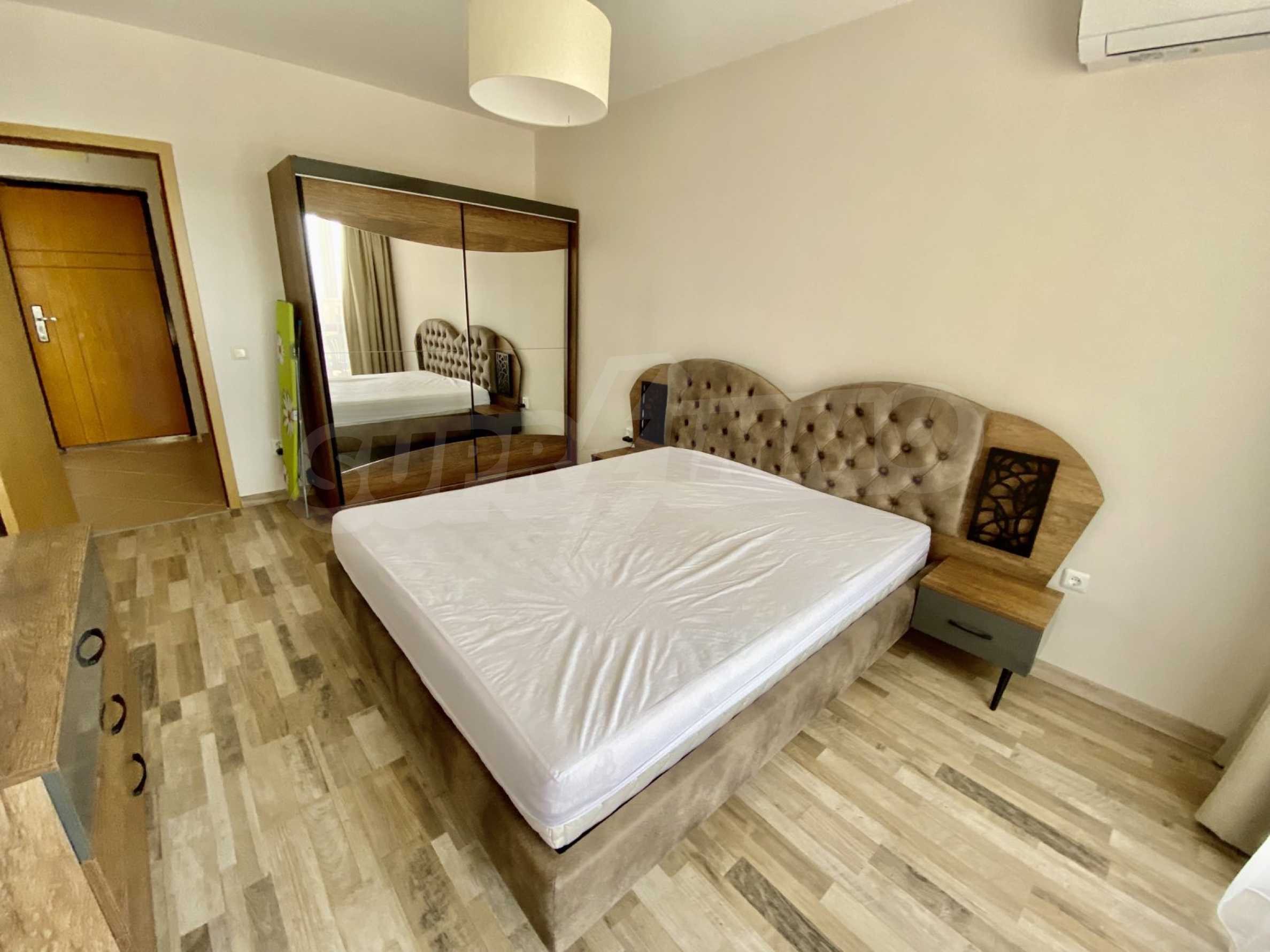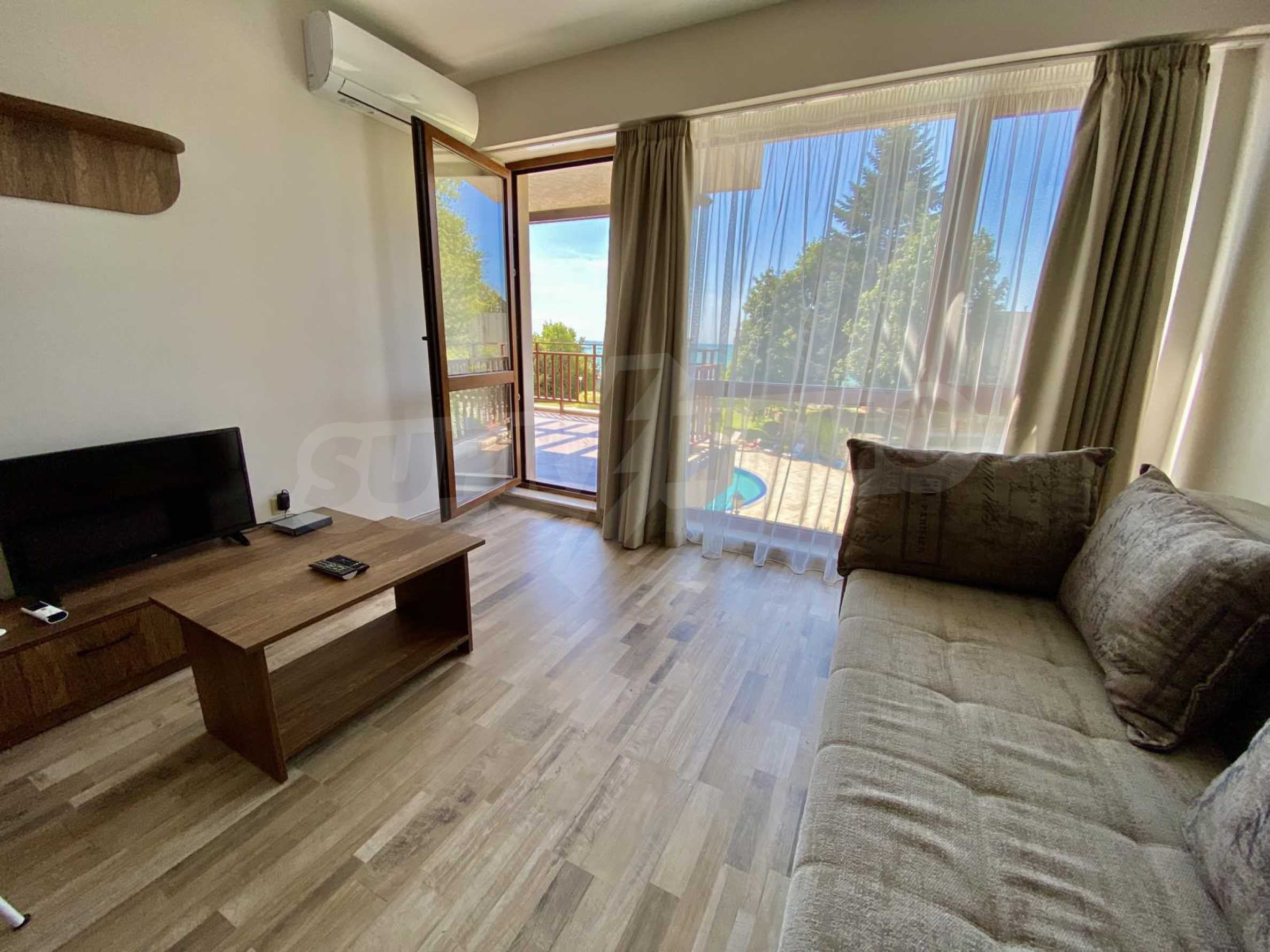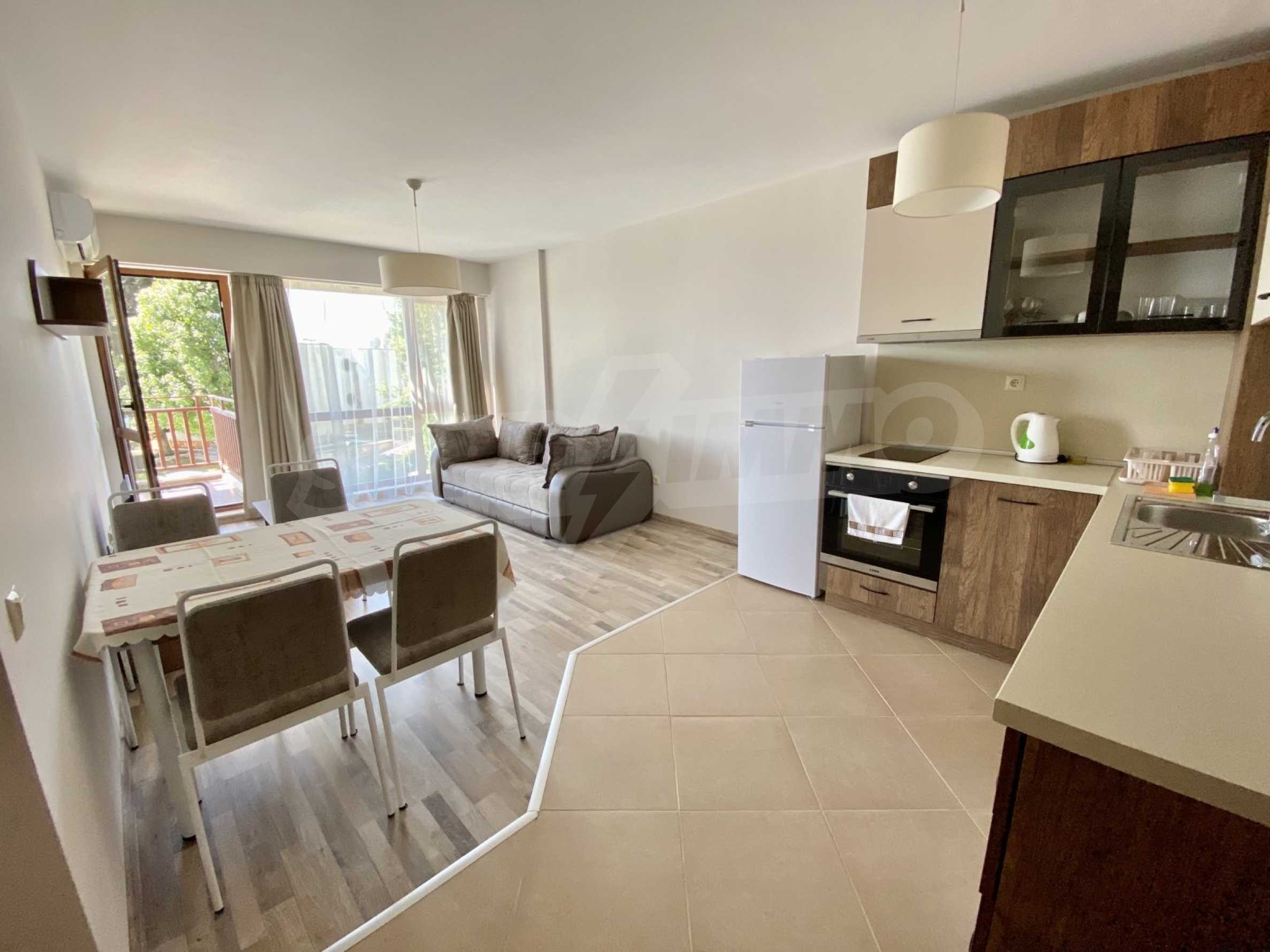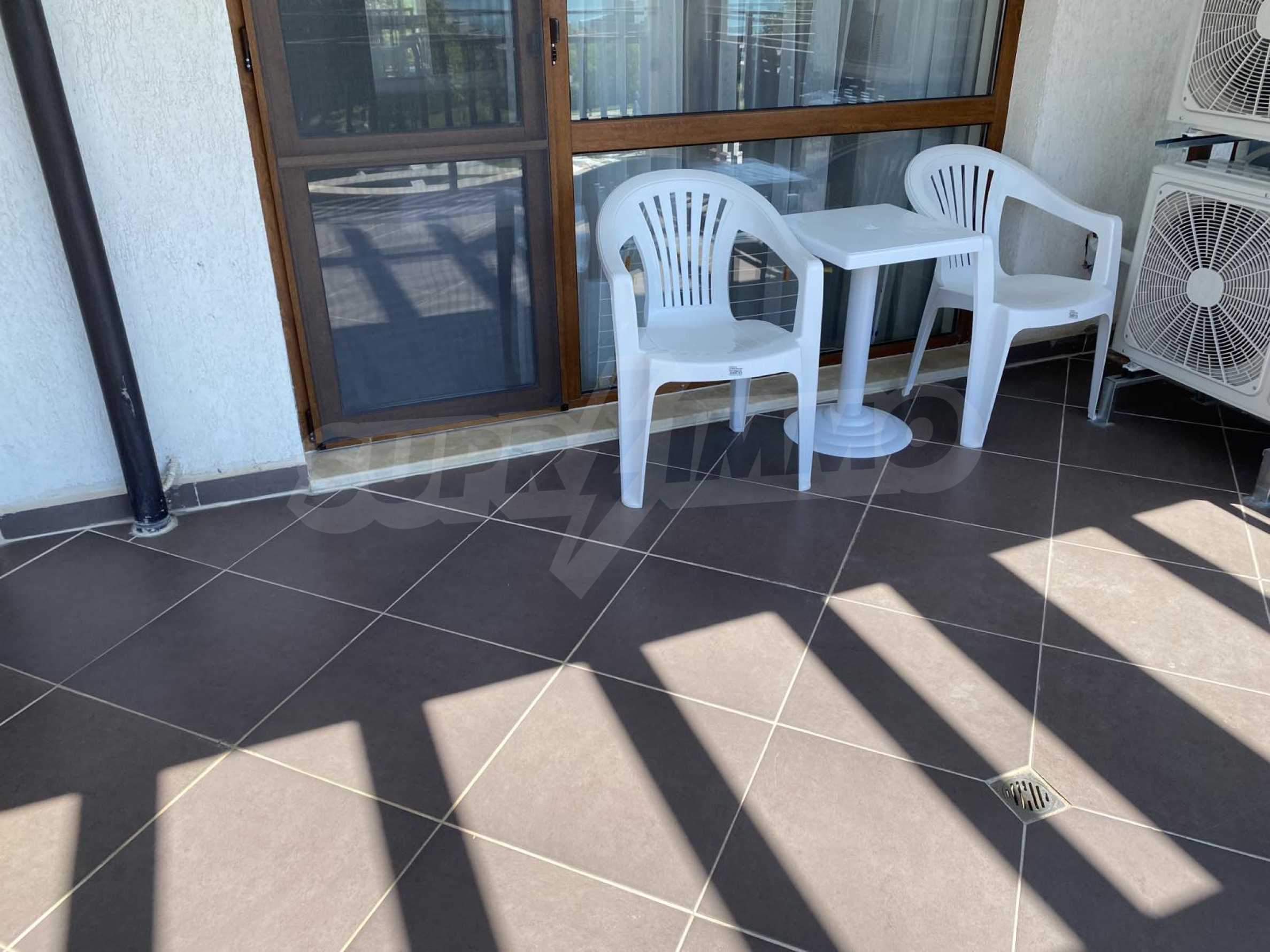 The complex is located meters from the sea and the pedestrian promenade in Balchik, with excellent amenities and extremely well maintained common areas and green areas. It also has a swimming pool and a children's playground. The building has free garages for purchase at an additional cost. The apartment is offered at this price furnished and ready to move in.