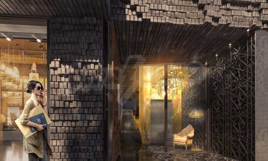 The common areas of the building are extremely luxuriously finished, with a perfectly designed lobby of expensive marble. The elevator is clad in onyx, with a mirrored ceiling and a designer chandelier.