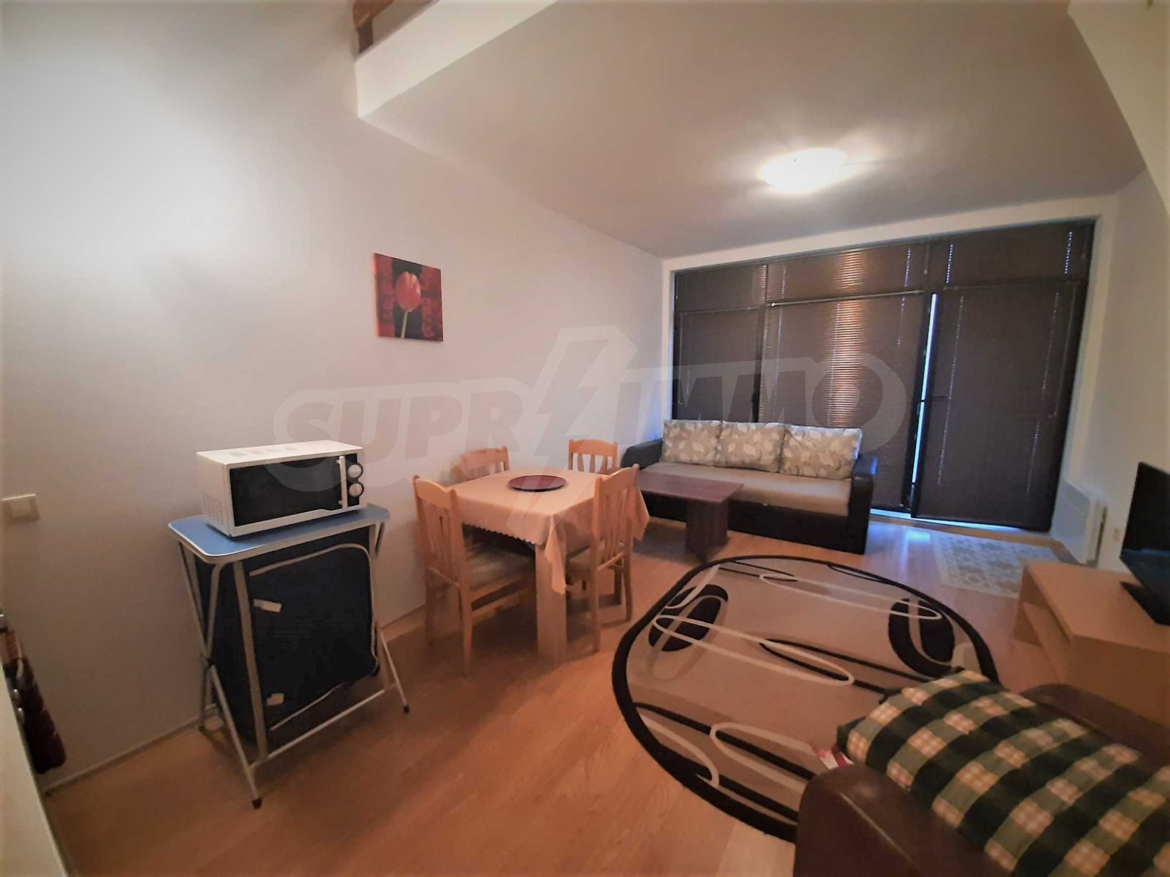 Maisonette for sale in a gated complex Aspen Valley. The property has an area of 64 m2. and is located on the fifth floor. The apartment has a bedroom, an equipped kitchen, a terrace and a bathroom with a toilet. The terrace offers an incredible view of the pool. Heating is provided by electric convectors. The apartment is suitable for living, renting and holiday property.