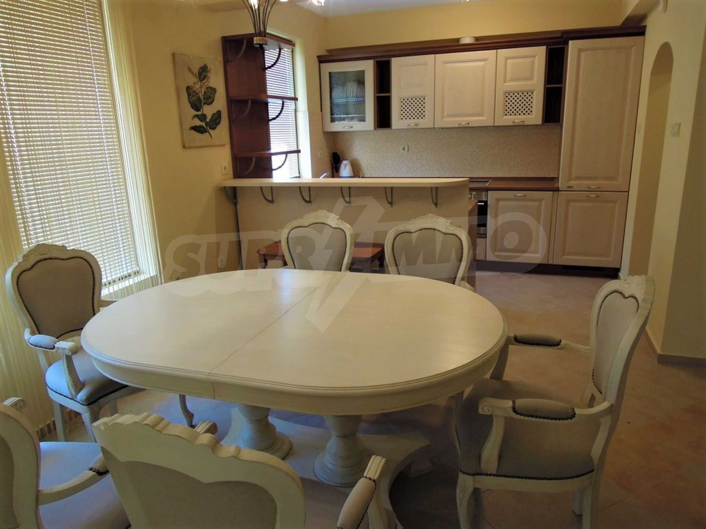 The house is comfortably and stylishly furnished, with excellent quality finishing works, ready to move in or rent. It consists of a spacious living room with veranda and kitchen, three bathrooms, internal staircase, three bedrooms and three terraces. Surrounded by greenery, the house has a pleasant bright facade, and the interior is designed in light, pastel tones, with wooden furniture, which contributes to additional comfort in the property. The classic furniture is complemented by modern appliances and equipment needed for the most comfortable living and recreation. The furniture and kitchen are from Italy, and the appliances are German.