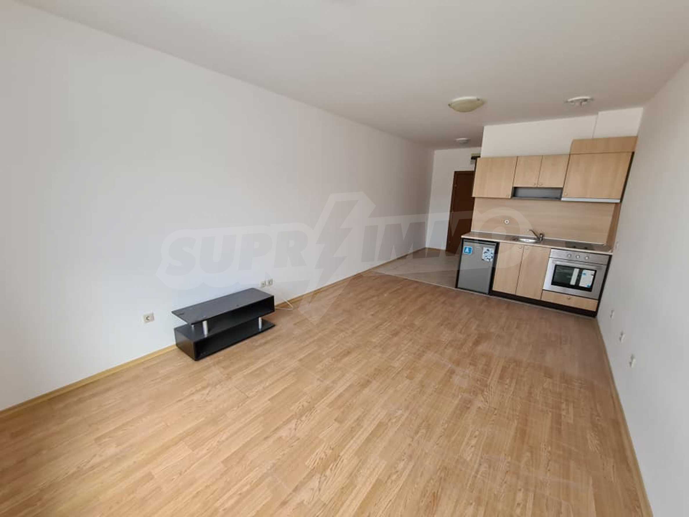 We offer a one-bedroom apartment for sale in a gated complex with many extras. The property has an area of 46 m2. and is located on the fourth floor. The apartment is a studio type and is unfurnished. The terrace overlooks the outdoor pool of the complex. Heating is provided by electric convectors. The apartment is suitable for investment or holiday property.